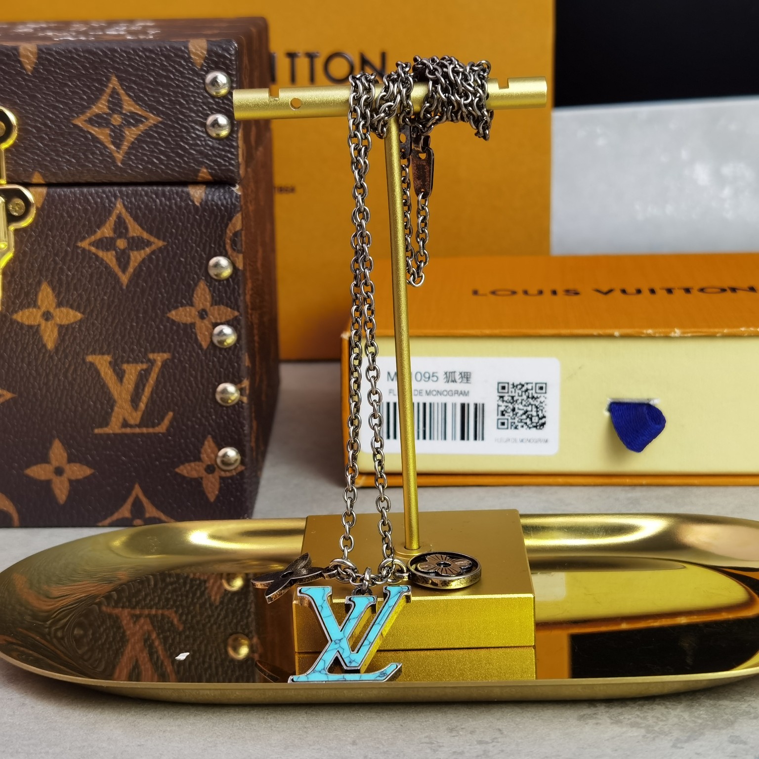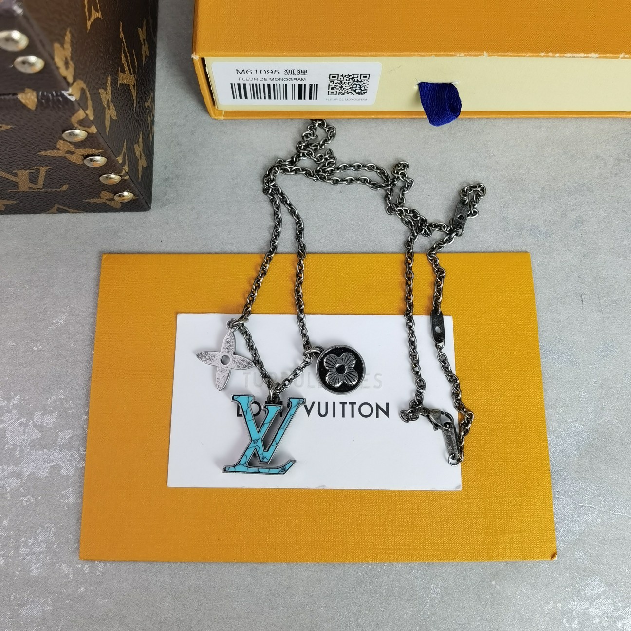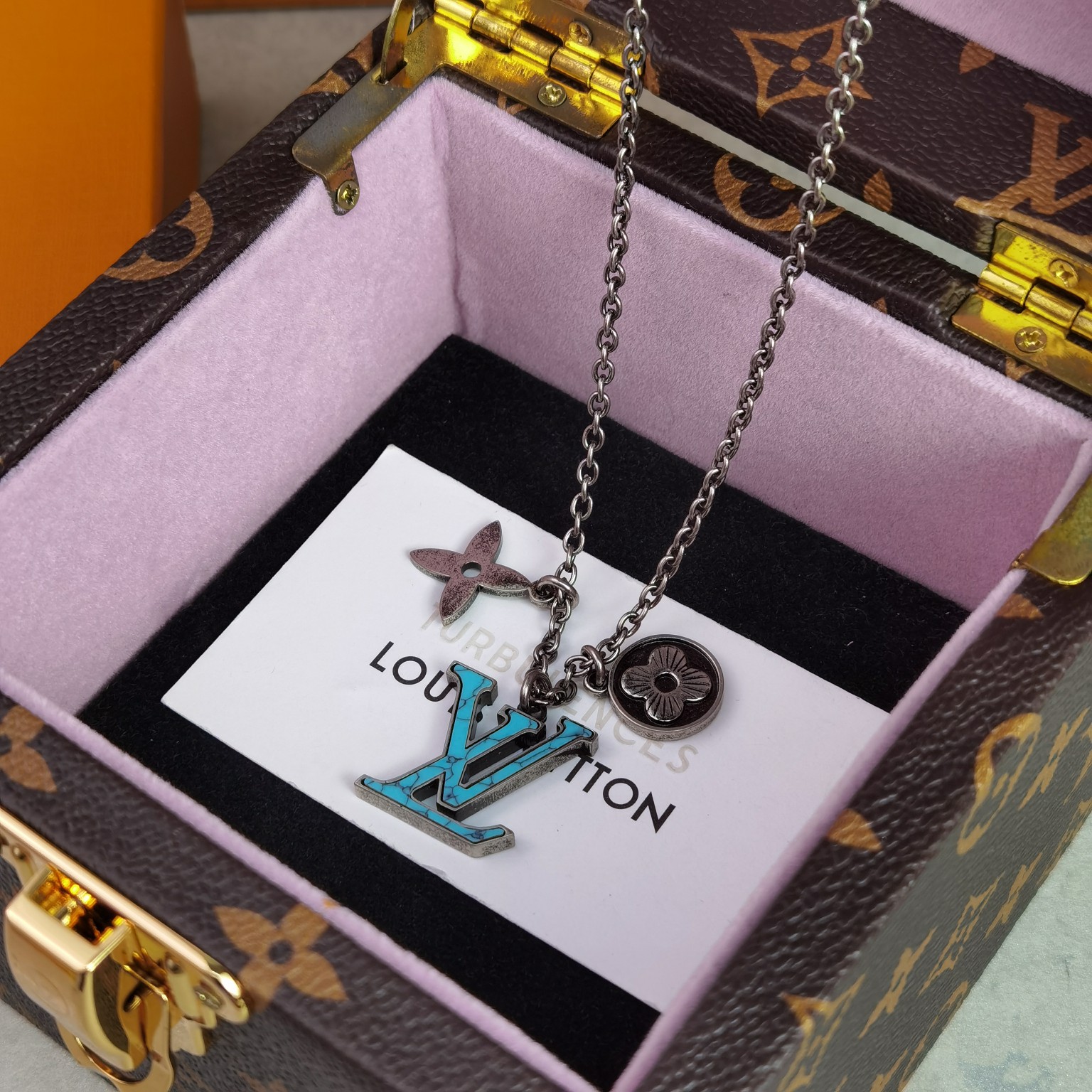 💰 120 (LV复古项链)LV Turquoise 精钢项链将品牌标志性元素汇聚一处:金属 Monogram 花卉流露微妙复古质感,经典 LV 字母取材石料,于可调节链条优雅悬挂。