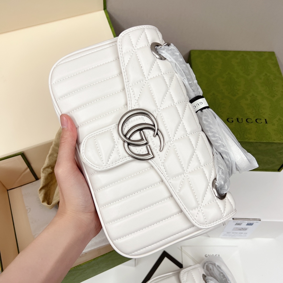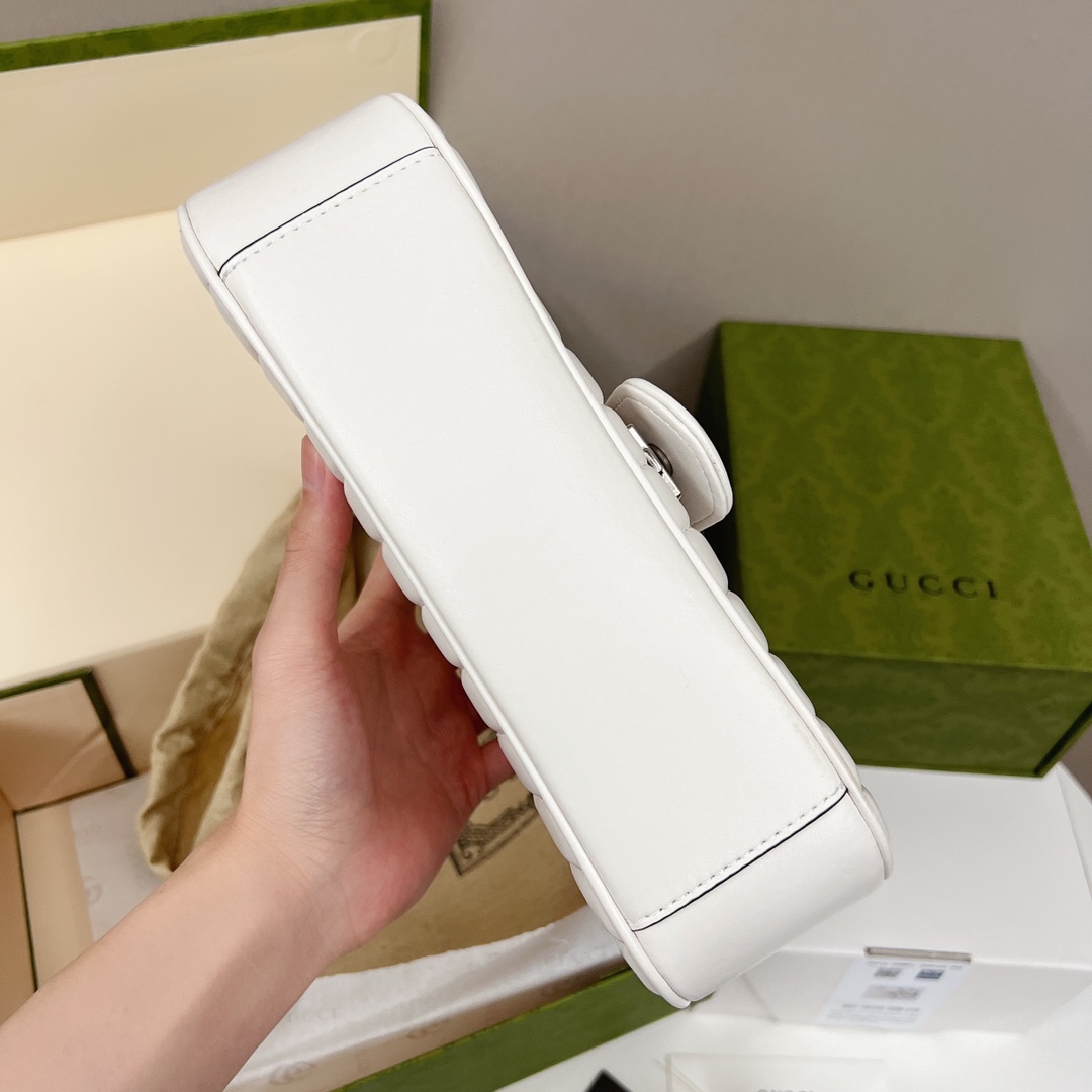 GUCCI 2021秋冬新款Marmont链条包 全新手袋以双G标识作为点睛之笔.采用更加柔软的皮质及结构.并对传统款式进行了全新的演绎.加上凹凸有致的立体感的水波纹缝线图案.随性搭配就超有范迷人.自然少不了大批明星潮人街拍搭配凹凸造型.【独家高端 海外购免税包装】 中号:22*13*6cm💰260 大号:26*15*7cm💰280