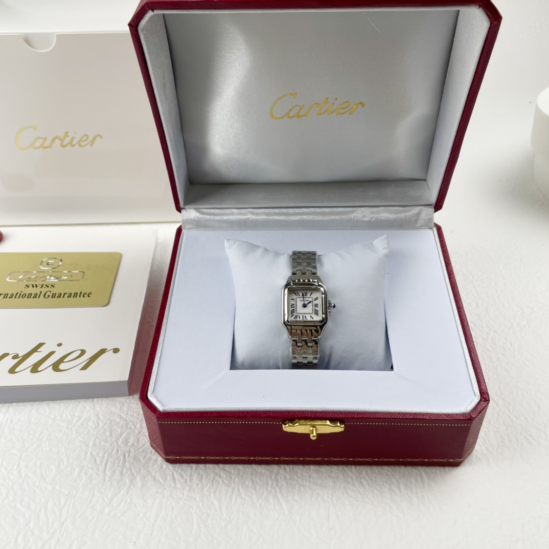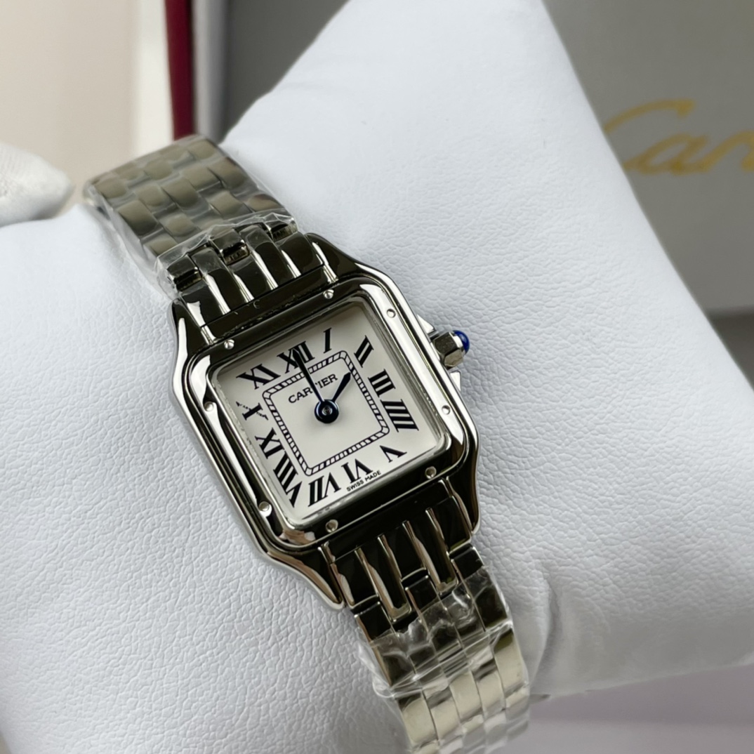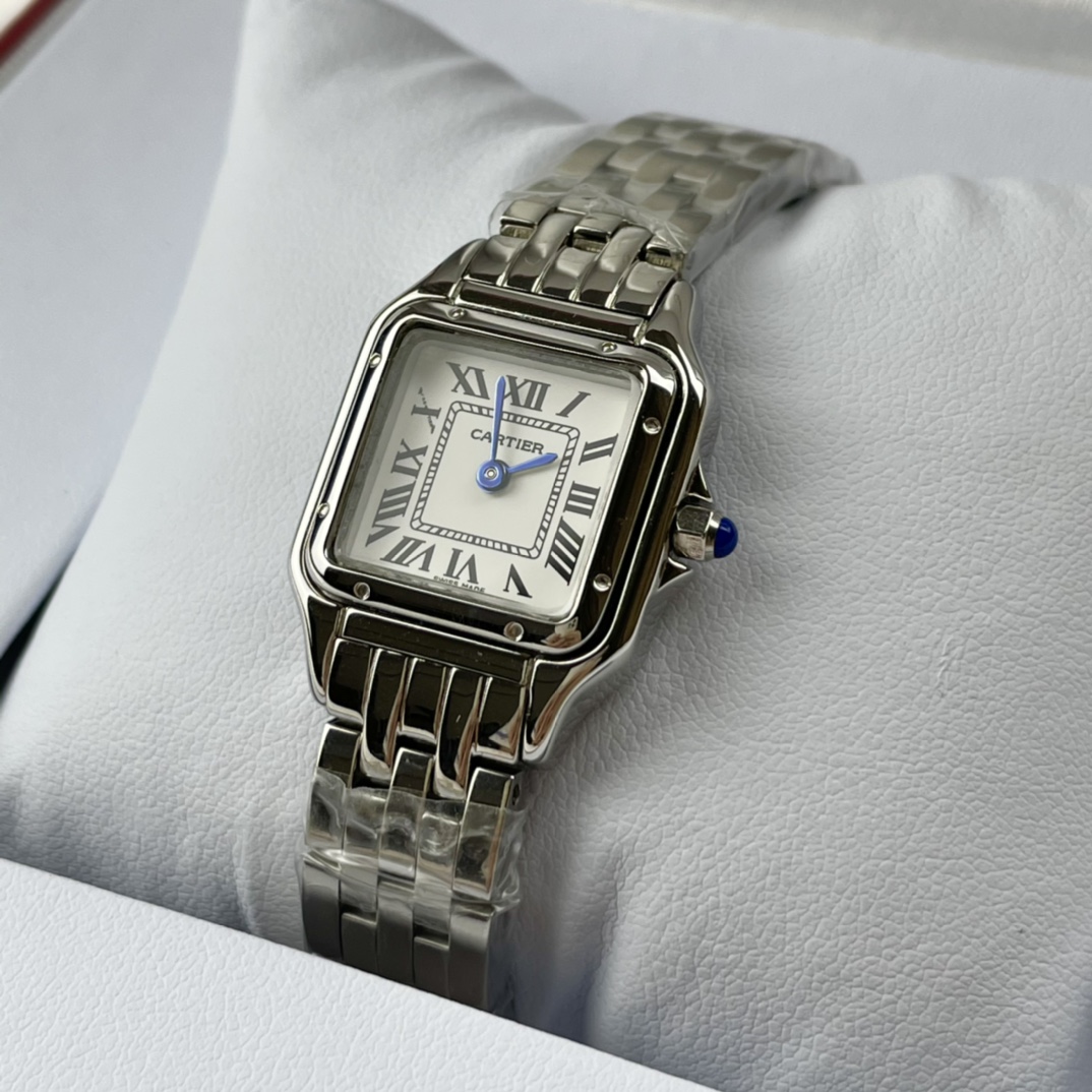 💰260 Panthère de Cartier 卡地亚猎豹手表,华丽而不羁,是Panthère de Cartier猎豹所传达的美学风格。它线条流畅,魅惑动人,柔软服帖于腕间,宛若在肌肤上翩翩起舞。独特的造型彰显成熟优雅、自信动人的女性形象。 表壳一体成型,搭配正品使用原装瑞士石英机芯,316L精钢壳套,镶嵌钻石 把头镶嵌一颗合成蓝色尖晶石,镀银表盘,剑形蓝钢指针,尺寸:27 x 37毫米,22*30毫米,二个尺寸。