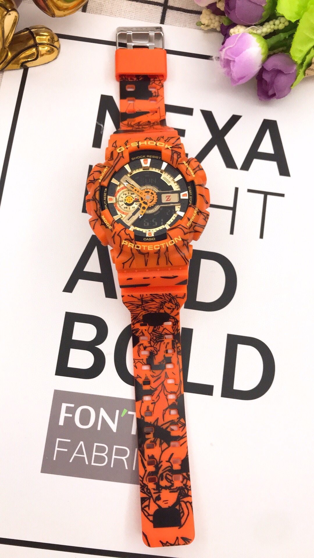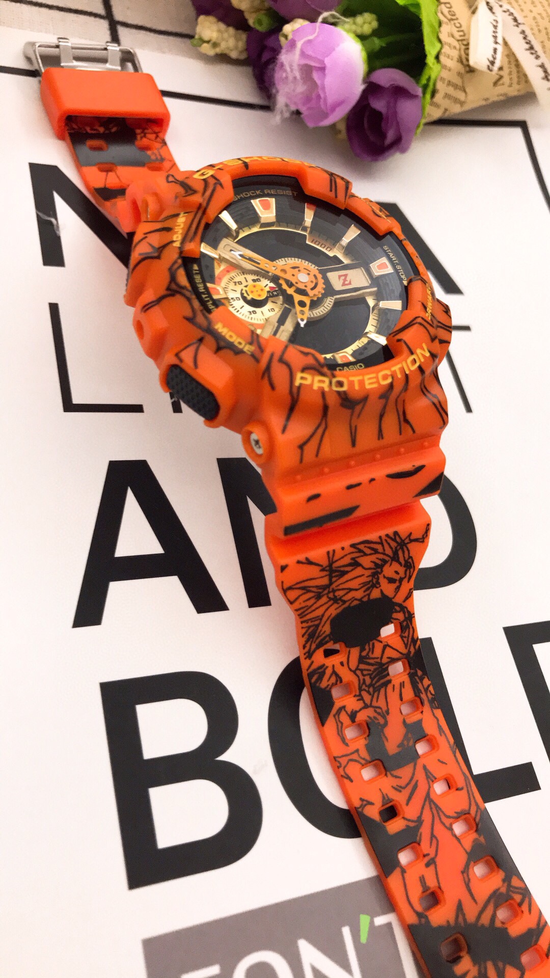 p70 绝版🔥卡西欧龙珠z 联名款❤联名款以大尺寸外观的“ GA-110”为基础,并在整体设计中表达了“七龙珠Z”的世界观。 表身整体纹路以漫画插图形式呈现,大胆地采用了整体橙色的设计。 表盘的配色和表圈上的logo使用了具有强烈视觉感的金色。9点钟位置的小表盘指针呈四星龙珠图案,是七个龙珠之中和孙悟空联系最紧密的一个,在3点钟的位置有一个代表“龙珠Z”的Z字logo图案。特殊包装和手表背刻上还印有“ Dragon Ball Z”的logo,体现联名款的独特性。主要功能:防震防磁200米防水自动LED照明世界时间(48个城市)秒表(1/1000秒)倒计时每日闹铃、整点响报间歇响报全自动日历12/24小时时制规格:尺寸(mm):55.0*51.2*16.9重量(g):72