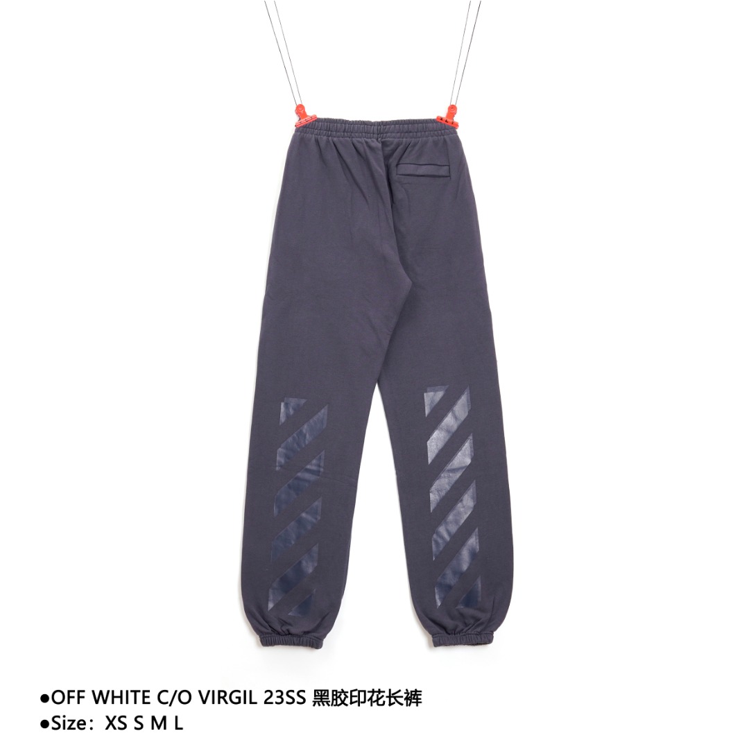 💰230 OFF WHITE C/O VIRGIL 23SS 黑胶印花长裤-深蓝黑 Size:XS S M L 定织定染420克重大毛圈 毛圈肌理 印花采用日资MIMAKI印花机作业 不起边无毛边 喷绘烫画热压冷撕 高温180度压烫 前片需要压烫两次(第二次需要180KG力度气压) 透布纹防刮擦熨烫作业 印花不起雾 黑胶印花效果有一种低调的写意呈现 线条以黑感颠覆既有感官 视觉上立体感十足 洗标也是按照原版的字体找公司订做 辅料部分依旧采用全线正确辅料 长方形梭织领标设计 把之前的立体硅胶手感字体取消改为全梭织领标 领标部分可以看到荧光色字体 五联硅胶吊牌 三联水洗标以及包装线依旧 款式编号:NN-56056056024