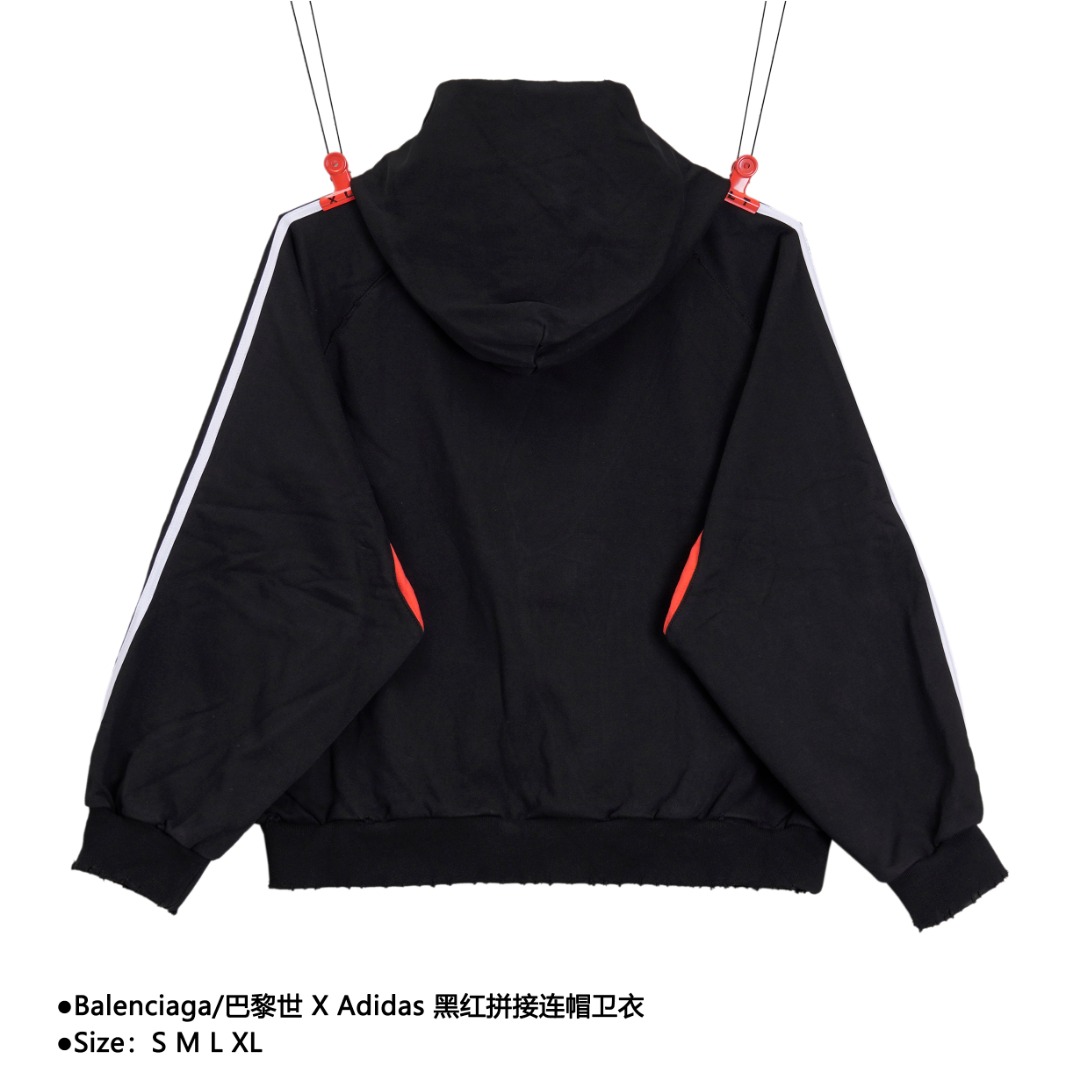 💰290 Balenciaga/巴黎世 X Adidas 黑红拼接连帽卫衣 Size:S M L XL 100%纯棉打造,内里走线严丝合缝,刺绣精密度饱满度拉满,宽大的版型和剪裁以及特殊出众的黑红拼接配色,无抽绳连帽设计,插肩袖,正面袋鼠袋磨损效果,极简元素上创造出独树一帜的风格 款式编号:A-56056065030