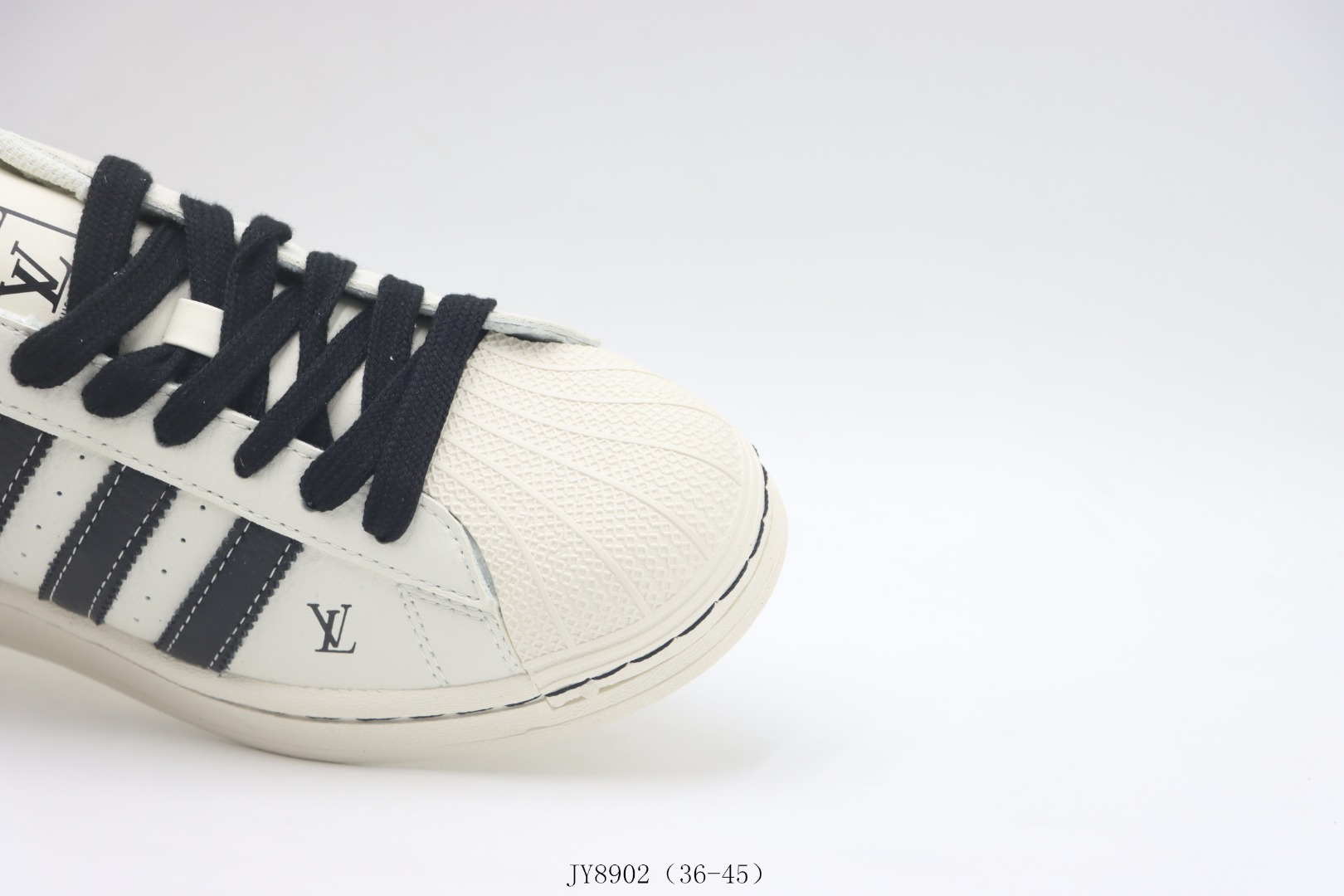 💰200 【公司级 贝壳头系列】阿迪达斯/Adidas 阿迪三叶草贝壳头板鞋 白黑lv 货号:JY8902尺码:36 36.5 37 38 38.5 39 40 40.5 41 42 42.5 43 44 45 ❗️❗️❗️ 阿迪达斯AdidasSUPERSTAR贝壳头系列低帮百搭休闲运动板鞋