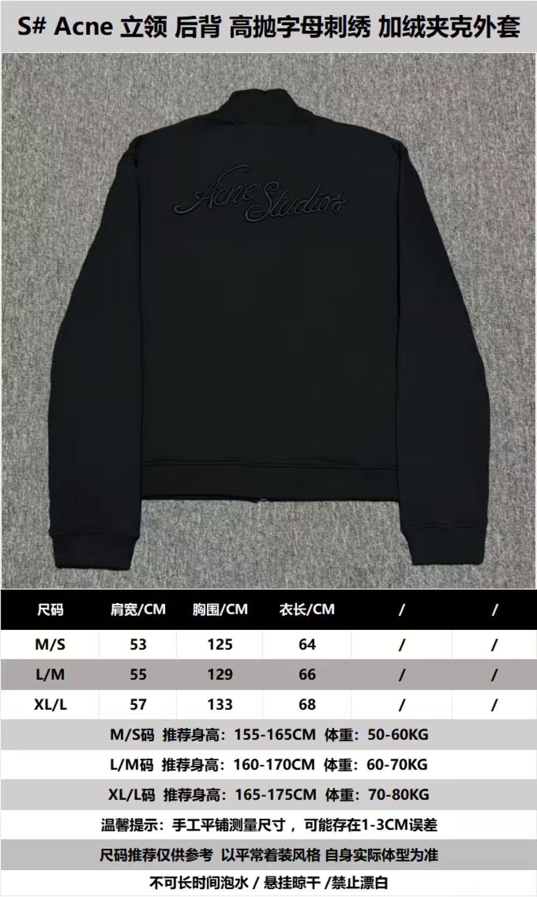 尺码参考对照表 具体以自身体型和穿着习惯为准 S# Acne Studios 立领 后背高抛字母刺绣 加绒夹克外套 真正原版购回开发打版 高端零售专供 品质保证 100%放心出街