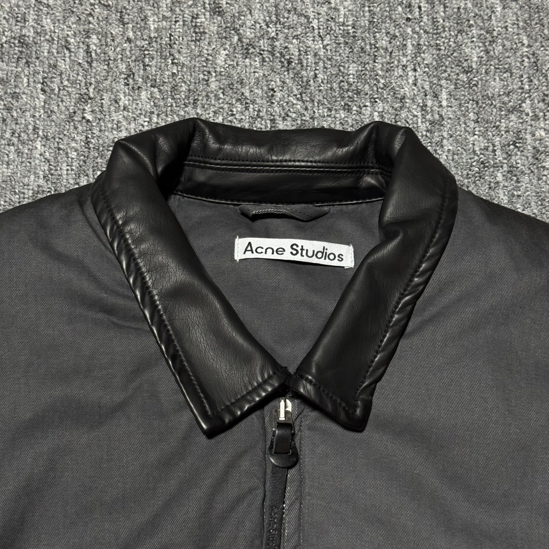 💰360 S# Acne Studios 巴恩风 皮领 棉服夹克外套 真正原版购回开发打版 高端零售专供 品质保证 100%放心出街 尺码:38 40 42 编号:41PFUU81 采用高克重14oz长绒棉斜纹织造 双重洗水工艺(酵素洗+浮石磨)处理,呈现自然褪色效果,确保每件夹克的色落纹理独一无二 定制洗水皮革面料(荔枝纹)选用植鞣革基底,通过油染工艺与机械压纹模拟荔枝纹肌理,洗水后软化皮质并增加做旧层次感,避免工业涂层的塑料感, 采用22支精梳棉平纹布,预缩处理防止变形,透气性与亲肤性平衡,边缘包缝工艺防止脱线,填充1400D洗水棉:高密度绗缝填充结构,棉絮经预洗处理消除硬化,保证蓬松度与保暖性,同时通过立体裁片分区避免臃肿 独立开模纽扣:锌合金压铸基底,表面做旧电镀,刻有LOGO英文,开模成本超2K 定制YKK EXCELLA系列5号拉链,齿牙做旧处理,拉头内嵌硅胶阻尼防止滑动,款式简约基础,男女皆可驾驭 【不拉拉链可以不用考虑体重】 对版定做三标辅料,与原版材质大小相同