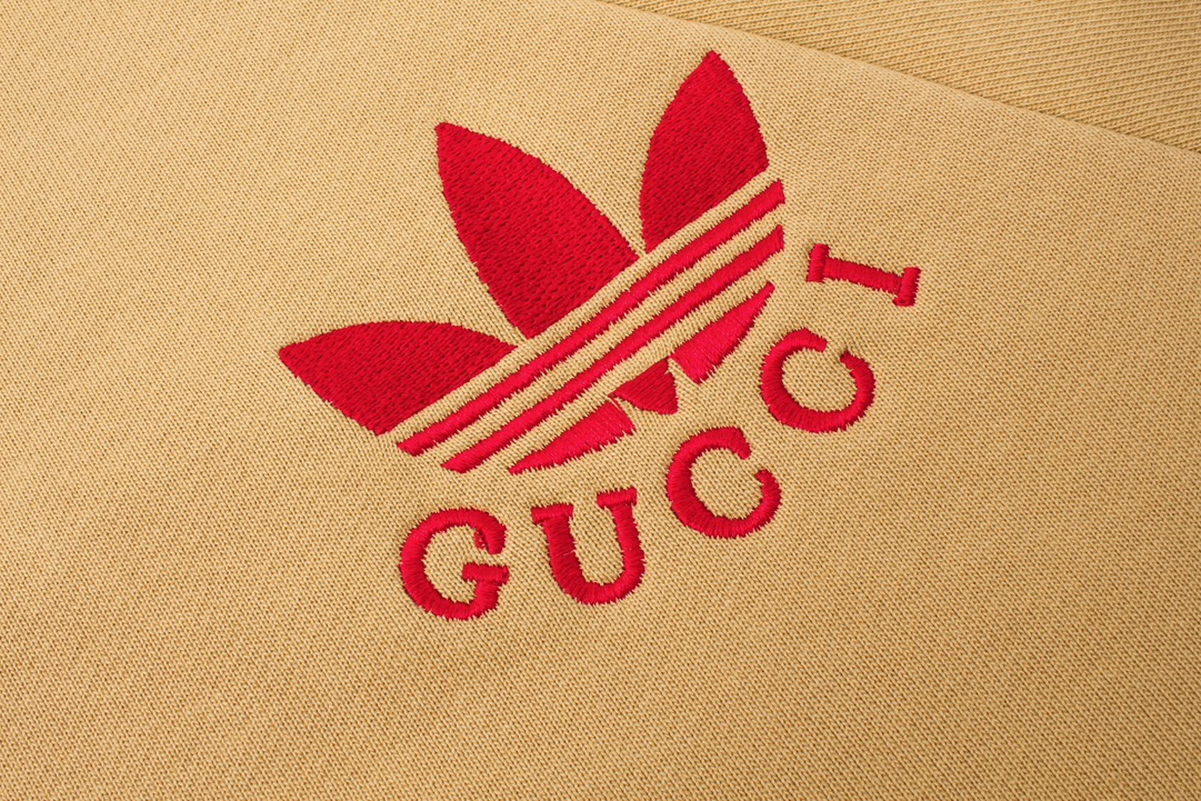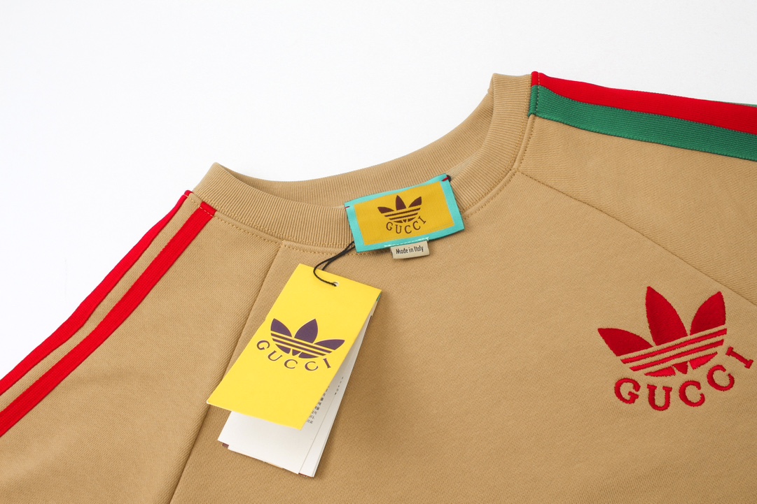 💰 120细节图【顶级版本.官网品质】 #Gucci古驰##三条纹##Gucci x Adidas#撞色三条纹罗缎绣花联名款,区别市场通货,官方原版,定制32支双纱纯棉大卫衣面料,克重460g,手感松软细腻又比一般棉布料扎实,舒适透气不易变形,采用进口纳绣花机刺绣,精密网版让绣花更为立体清晰细致,原版辅料一比一三标齐全,人工手缝织唛,还原专柜,宽松版型,男女同款,官网品质 码数:XS - L 颜色:卡其色