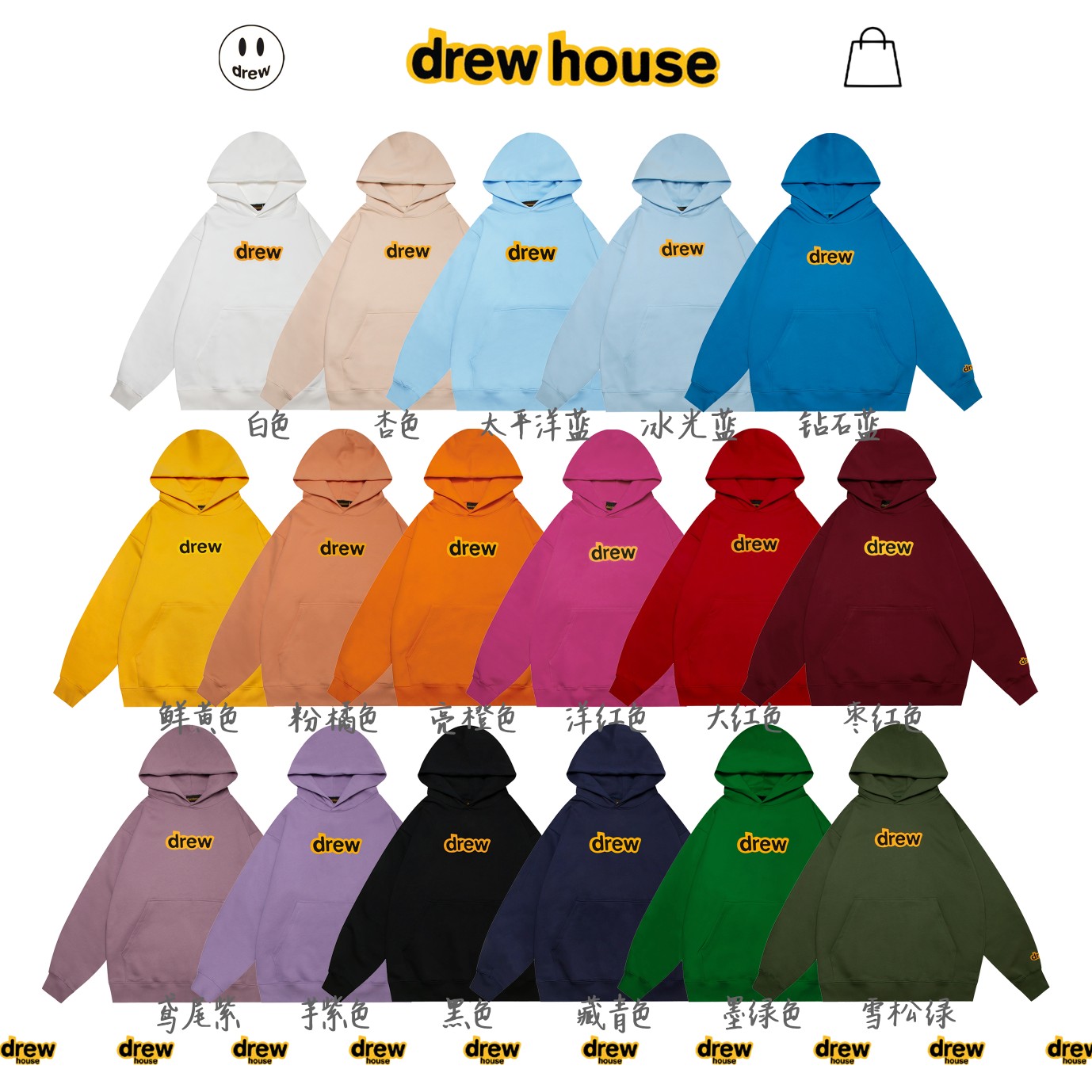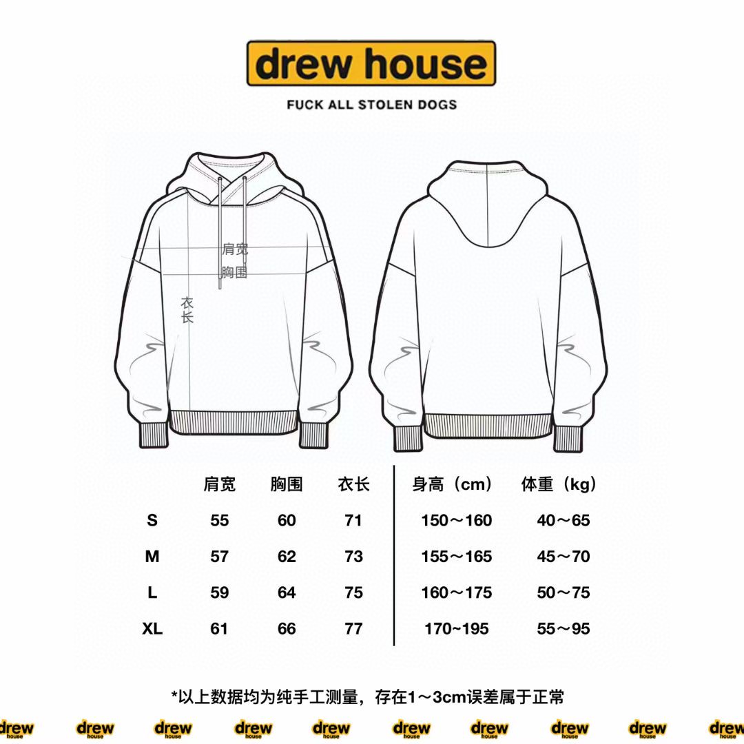 DREWHOUSE-“AAAAA品质” 💰120 DREWHOUSE贾斯汀比伯Justin Bieber同款卫衣 -特点:面料,印花,版型,细节市面最佳❗️❗️❗️ -面料:420g抓毛,棉感超强,不是市面世博绒可比的❗️❗️ -印花:椭圆机胶浆发泡印花做到印花手感清晰度99分,多一分怕骄傲❗️❗️❗️ -颜色:17个色-详细看合集 -尺码:4个码数-S,M,L,XL