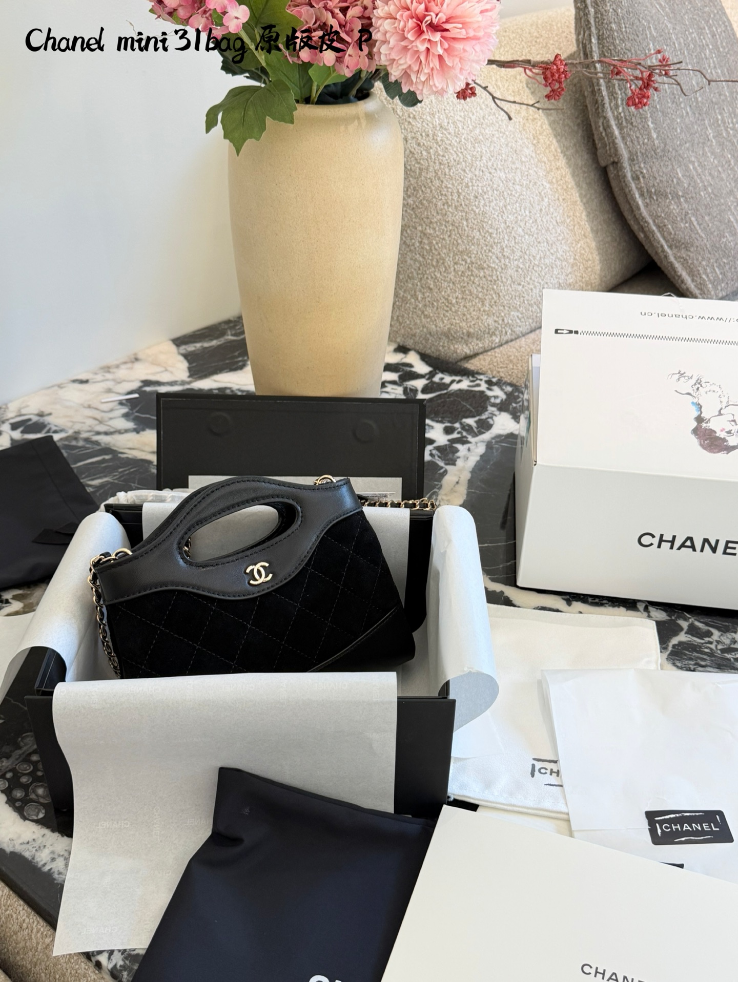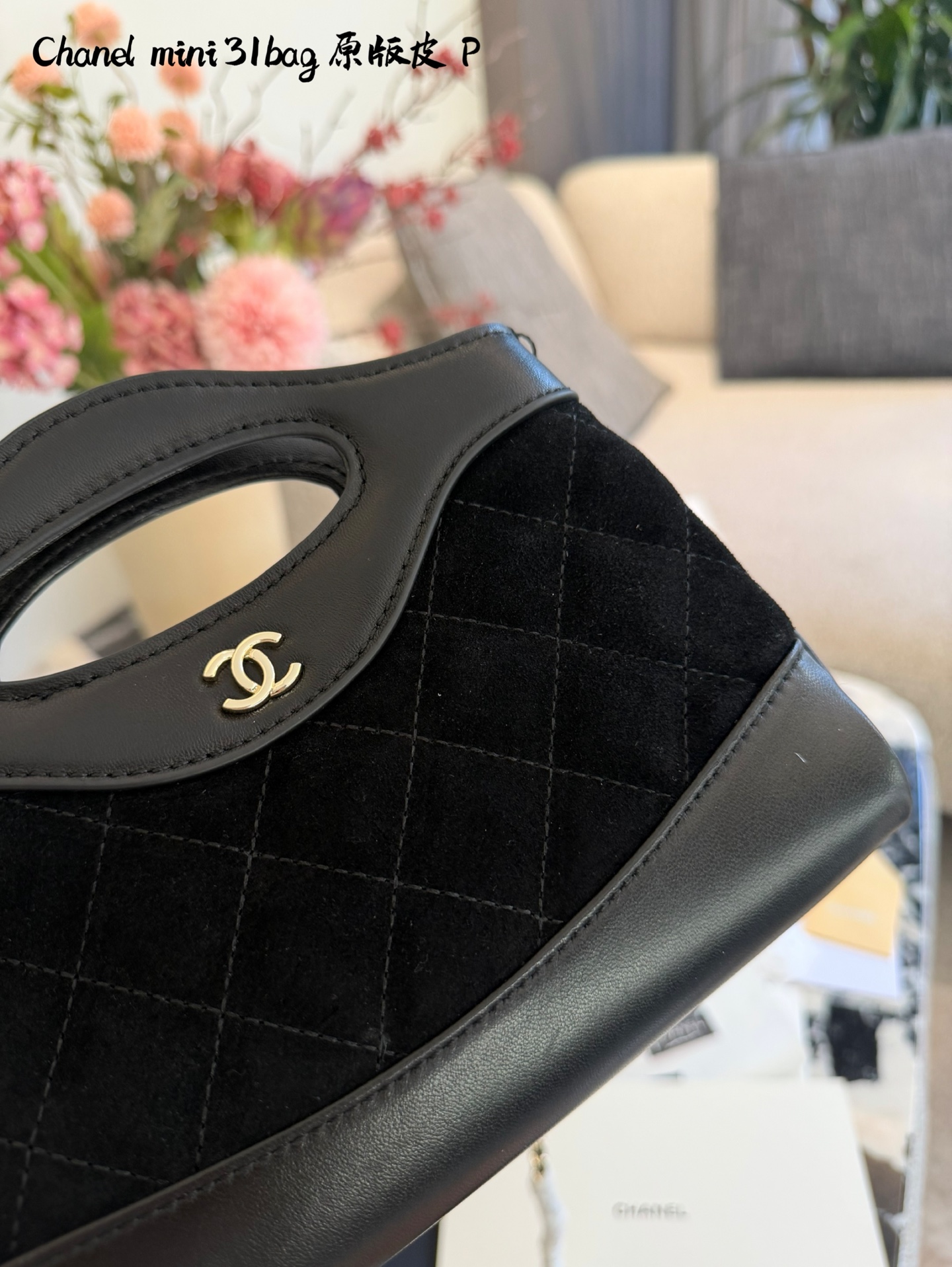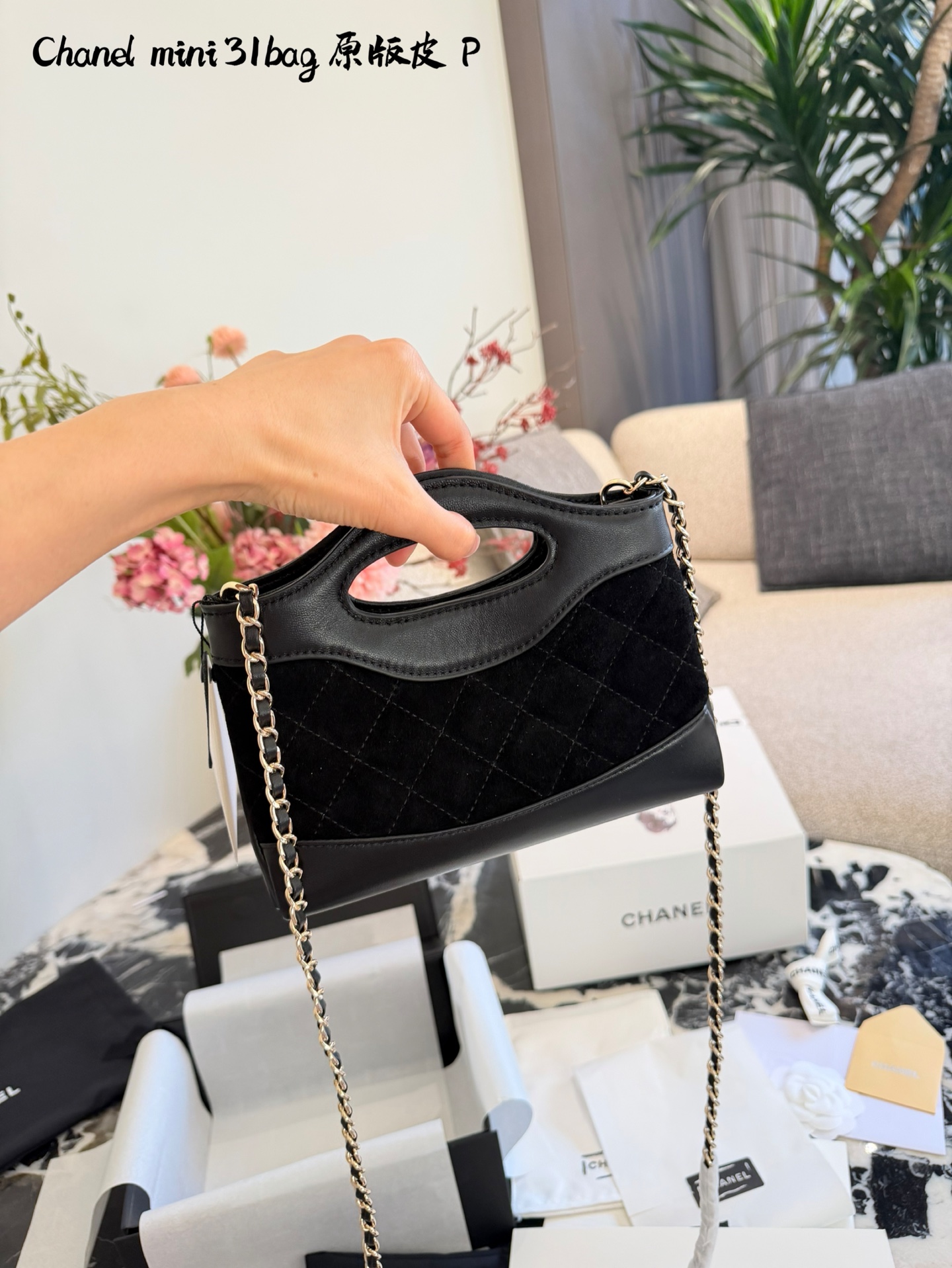 💰280 香奈儿31bag nano麂皮包 t香奈儿31bag nano横版,黑色麂皮+光滑皮革拼接,经典菱格纹+淡金色双C标志,复古优雅气质满分!尺寸约20.5cm,轻巧便携,链条肩带可调节,手提斜挎都OK,通勤出行都很适合。麂皮柔软有质感,秋冬搭配超温暖,但要注意防水防污哦!双盒包装