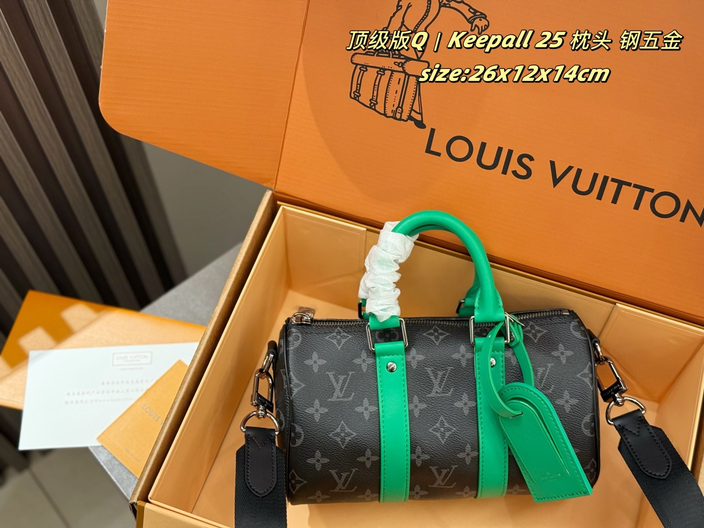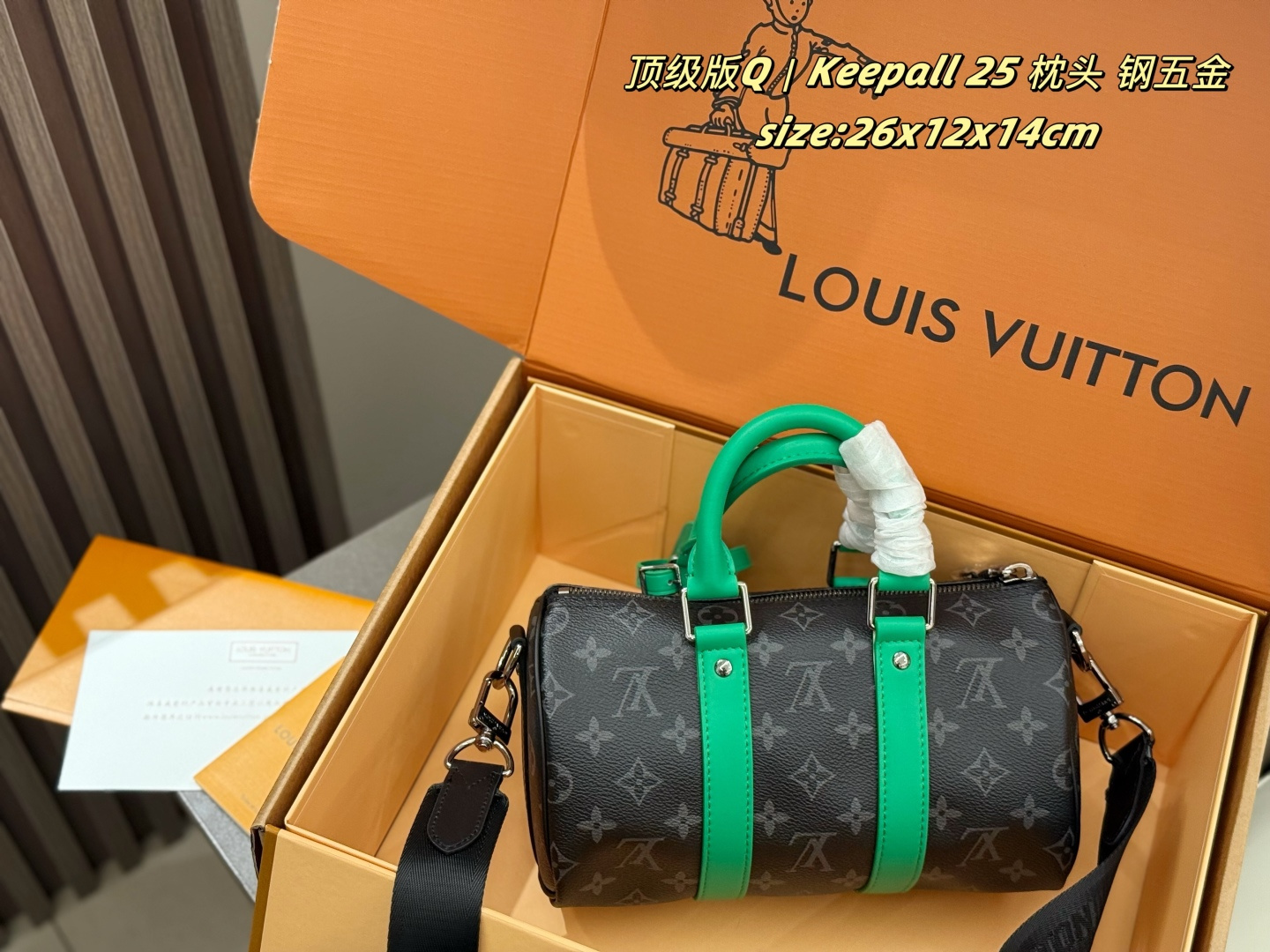 💰405 钢五金 顶级版 双盒包装 LV | Keepall 25 枕头 经典MonogramEclipse Reverse老花帆布+皮革饰边,低调又有辨识度。拉链开合,手提斜挎都OK,通勤短途旅行都能用!肩带可调节,男女都能轻松驾驭,酷飒百搭,实用又时髦,是LV热门款之一 size:26x12x14cm