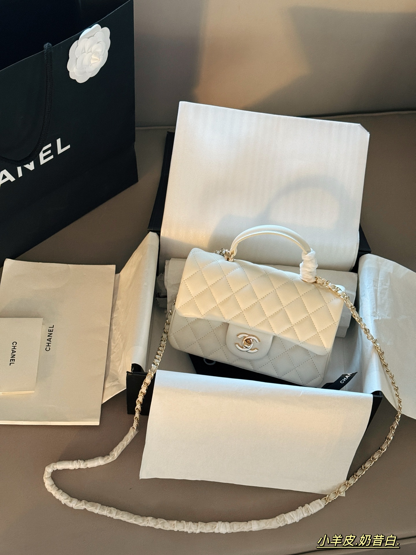 💰420 配盒 小羊皮 size :20*12cm 小香家 Chanel23k皮手柄cf让经典再升级~ 可以手提的!包包很实用! 羊皮配复古五金扣,优雅又公主! mini cf handle真香大小正好 可以放pro max