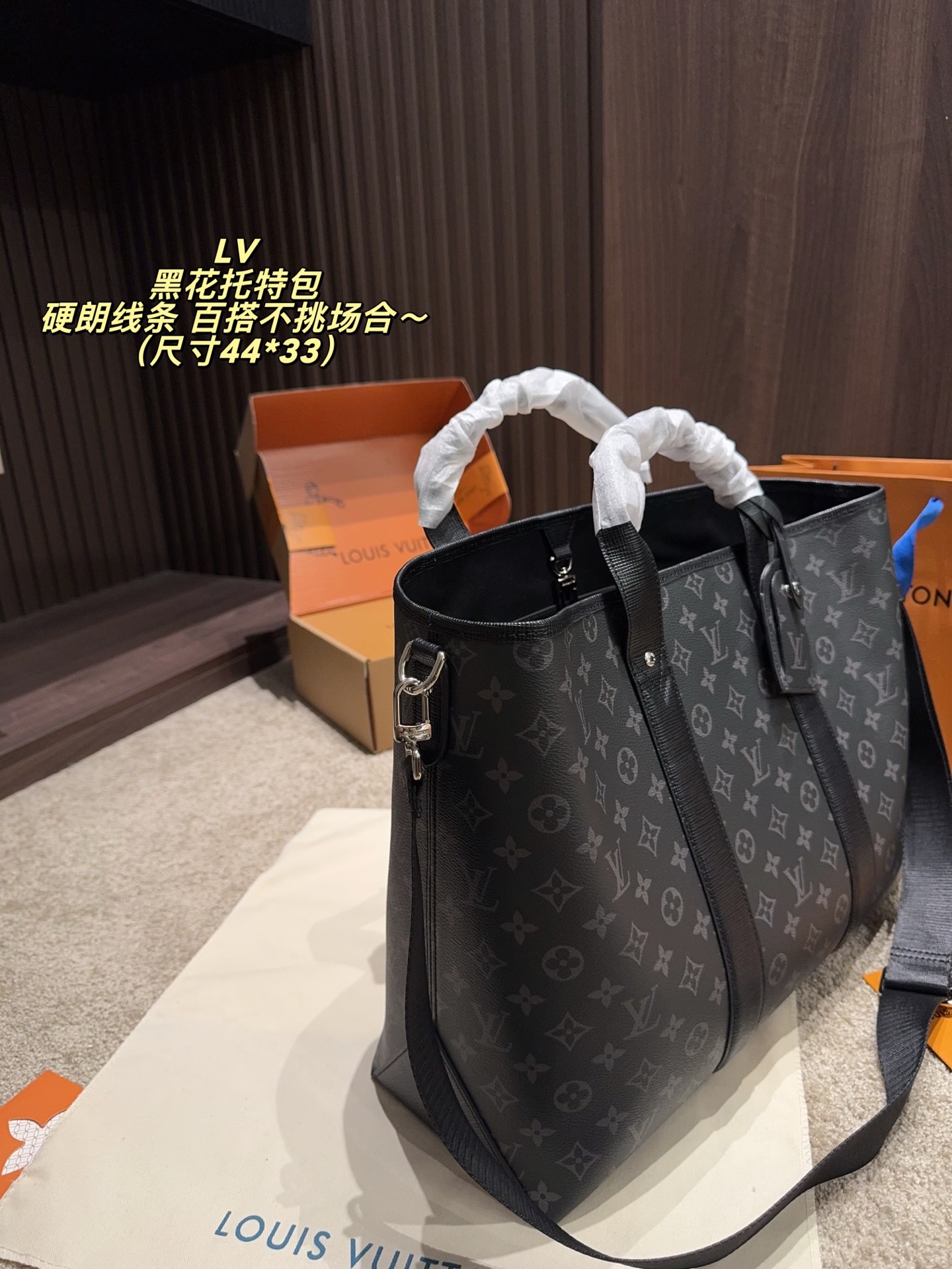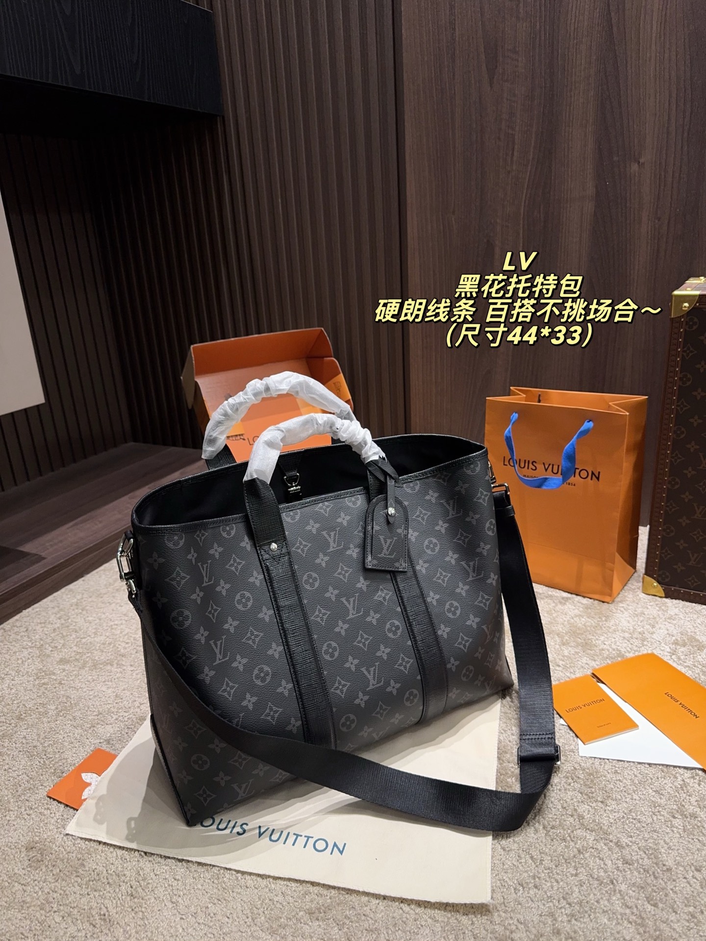 💰470无盒⚠️尺寸44*33 LV WEEKEND TOTE NM 黑花托特包~ 经典Monogram老花帆布+黑色牛皮饰边,低调奢华超有质感计。容量大,通勤or短途旅行都很OK!标志性钩扣设计,开合方便叉有仪式感。硬朗线条+宽幅侧带,手提肩背都舒适,男女都能驾驭,百搭不挑场合