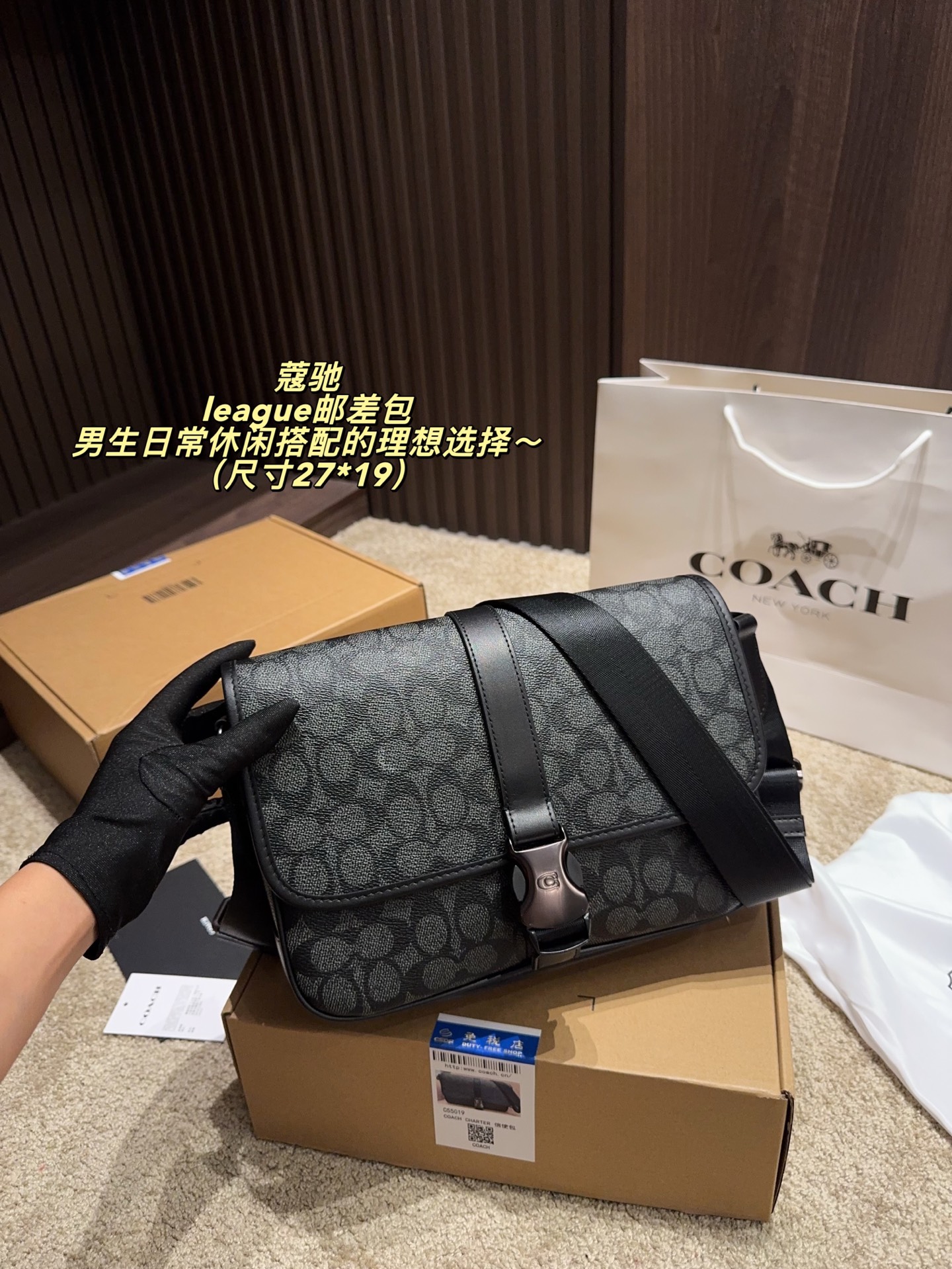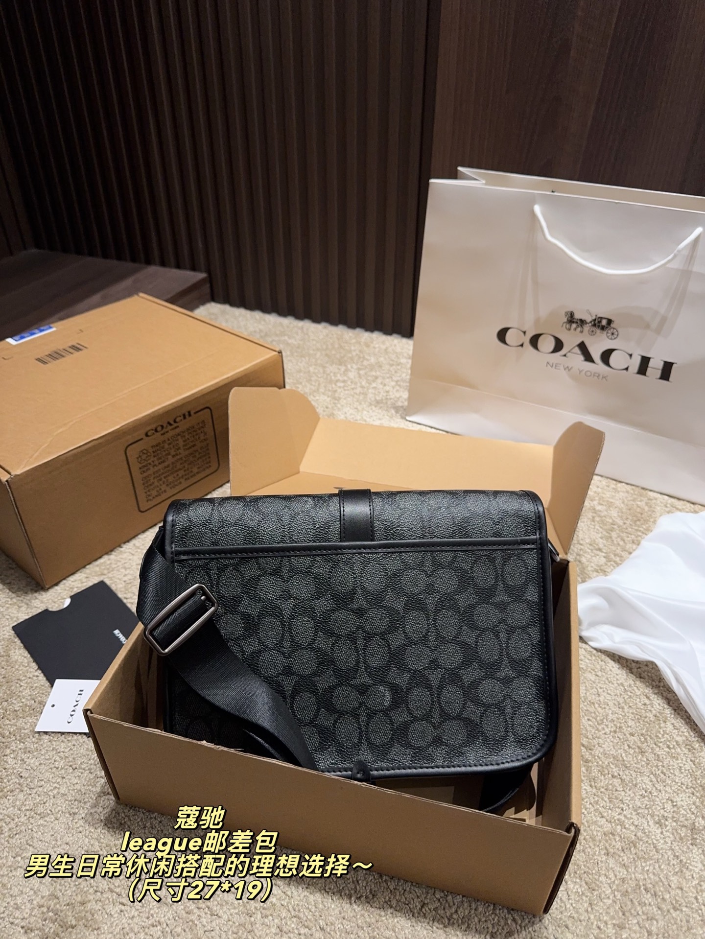 💰420配飞机盒⚠️尺寸的27*19 蔻驰coach league邮差包 男生日常休闲搭配的理想选择~ 容量真的超级大,电脑,平板都能放得下 采用光面小牛皮&涂层帆布材质 内部的开放式隔层,可放置平板电脑 便捷扣开合 配备可调节长度的长肩带
