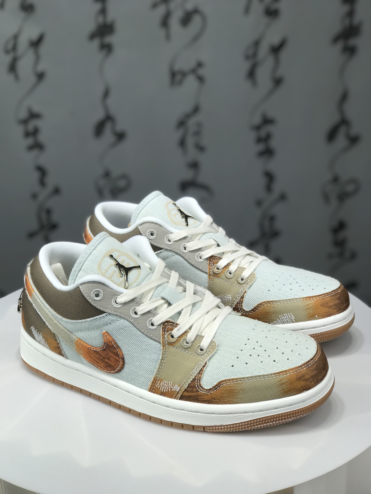 #采用毛边帆布面板与做旧细节,营造出自然磨损的复古质感。棕、橙、灰等大地色调的覆面与泼墨般的斑驳印记形成鲜明对比,赋予球鞋粗犷的街头风格。