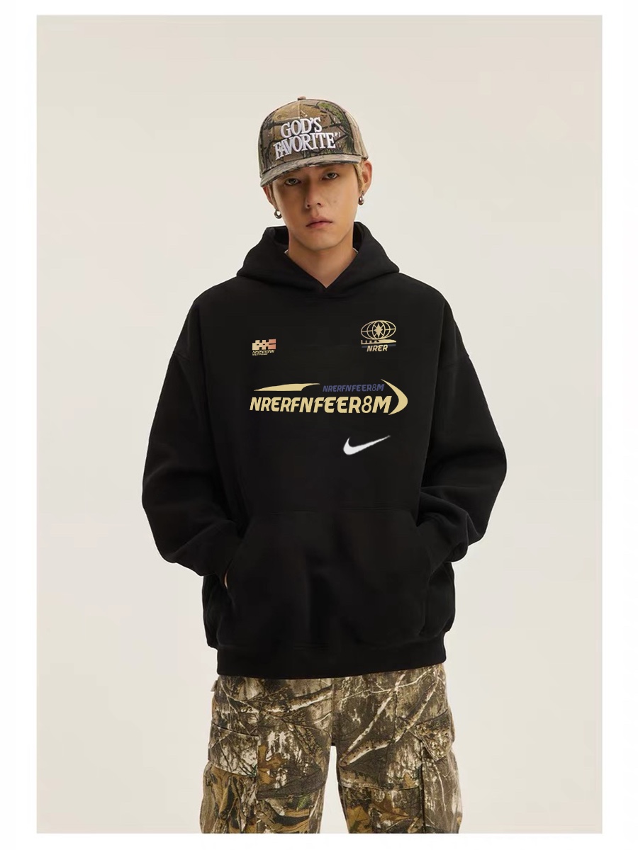 💰205 NIKE 耐克 酷黑调性 联名系列 高街 潮牌 宽松休闲连帽卫衣 男女同款 情侣款 💡:标配帽绳如不喜欢,可自行抽出拆卸,廓形帽衫玩转不同穿法。 设计灵感: Nike 这款连帽卫衣,酷黑主调超有范儿~个性字母印花搭配经典小勾,还有精致小标点缀,潮流感直接拉满。 宽松版型对各种身形都友好,连帽设计增添随性感,不管是搭配短裤玩下衣失踪,还是配牛仔裤走休闲风,都能轻松hold住,出街吸睛必备! 面料工艺: 1.甄选320g新氧棉面料,触感细腻柔滑,吸湿透气,柔软自带支撑感。 2.弹力罗纹收口,后领保形织带,有效防止肩部坍塌和变形。 4.显瘦双肩线领口,贴肤面透气舒适。 5.下摆双排车缝线做工精细,缝合自然,公正有序。 6.双层帽子,厚实硬挺不软塌。 尺码数据: M【170cm】:衣长70/胸围112/(适合130斤以内) L【175cm】:衣长73/胸围118/(适合160斤以内) XL【180cm】:衣长75/胸围124/(适合190斤以内) 注意⚠️: 落肩袖设计,版型偏大。 平时穿着效果偏合身的朋友建议选择小一个码数。