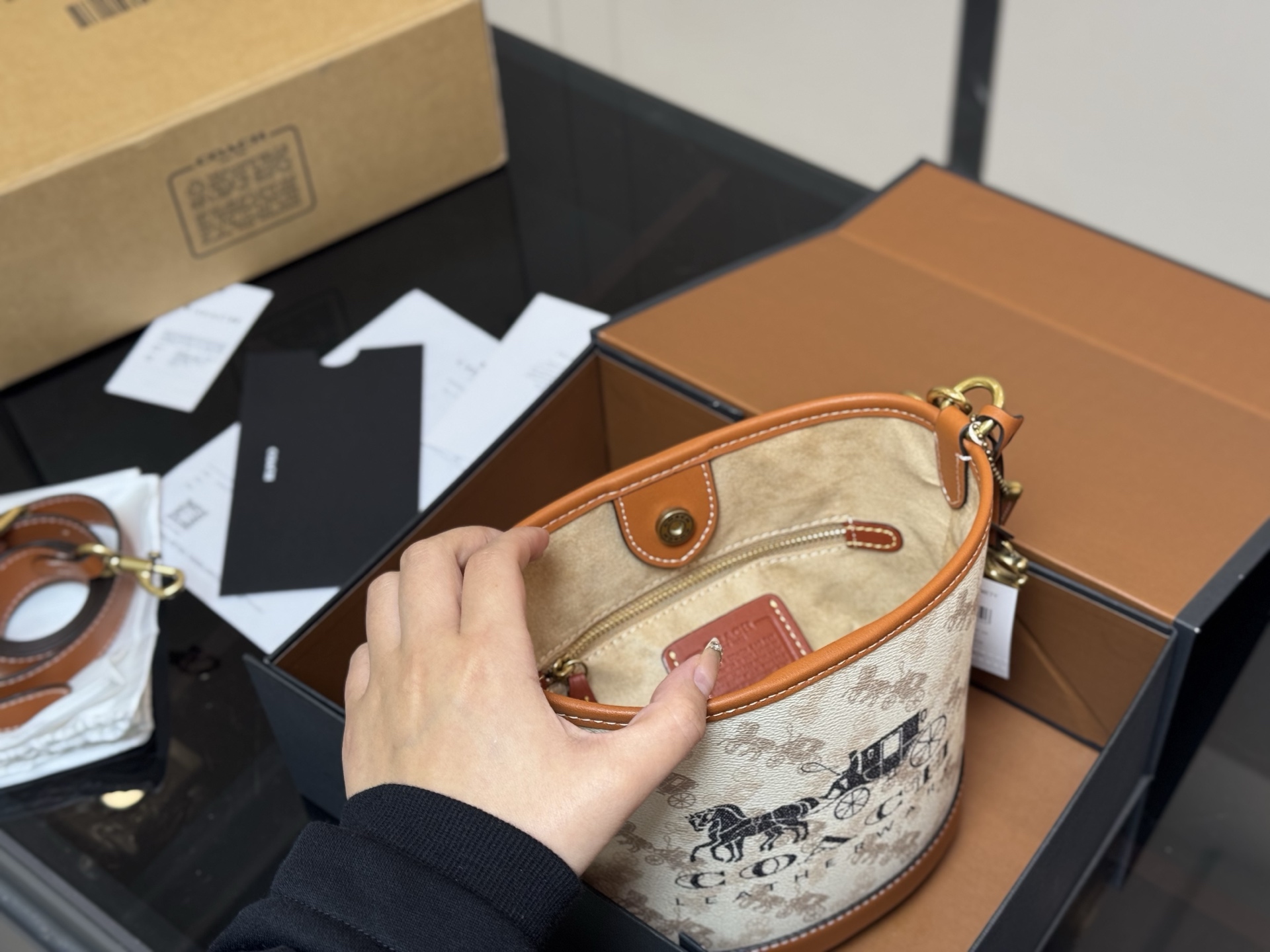 💰375 配折叠盒飞机盒 Coach mini马车水桶包太可爱 ‼️ 听说今年很流行蔻驰水桶包 手提单肩斜挎都很 拍照凹造型 真的很好看 真的是小个子福音~ 喜欢小号马上冲!! 尺寸:17.19cm