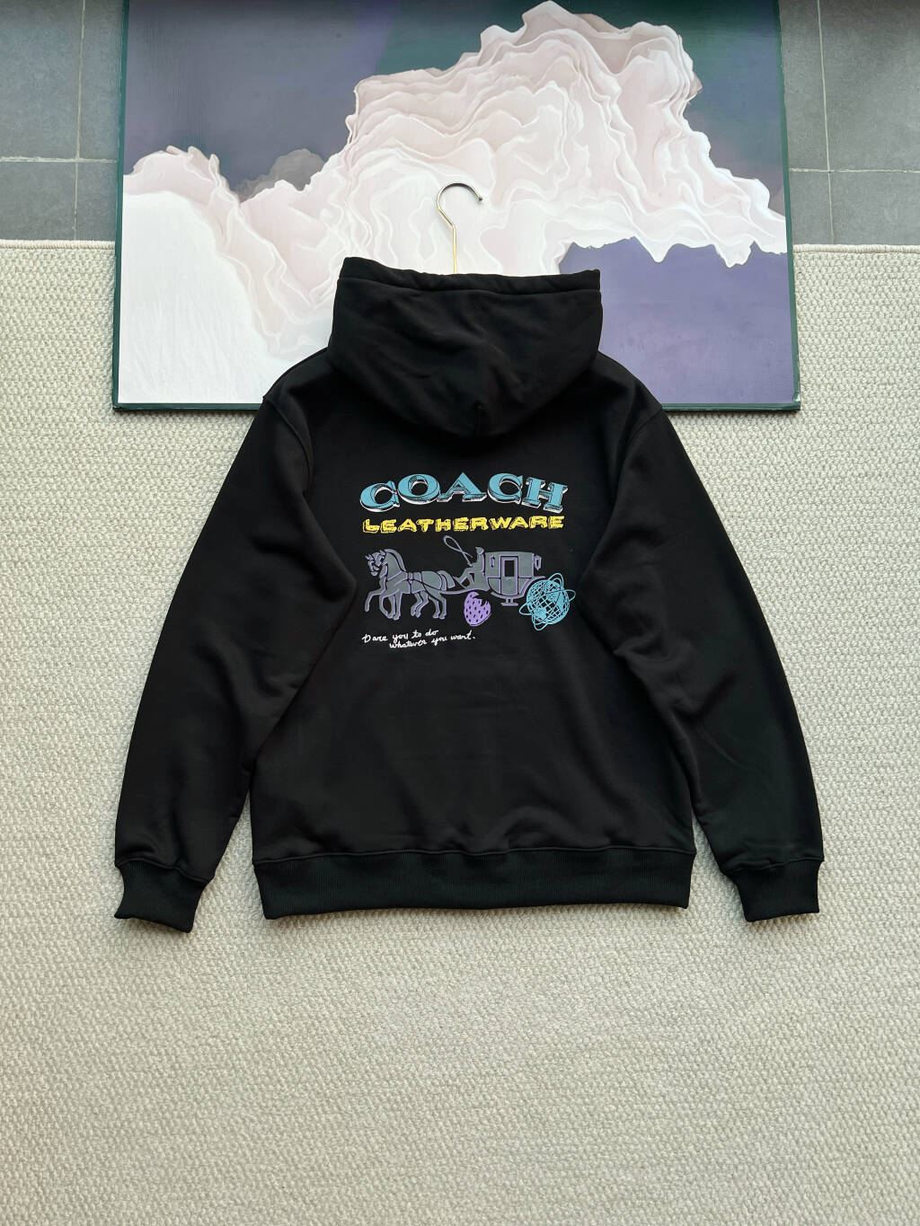 💰225 COACH寇驰情侣款后背马车图案休闲运动连帽卫衣 专柜同步🔥这款美式复古帽衫卫衣,充满了街头的个性与不羁,胸前标志行字母图案 后背经典马车图案,轻松诠释了蔻驰的经典🔥 品名:蔻驰后背胶印马车连帽卫衣 颜色:图片色 尺码:S M L XL 帽衫长袖尺寸参照 部位\规格 S M* L XL 衣长 65.5 67.5 69.5 71.5 半胸围 53.5 55.5 57.5 59.5 肩宽 47 48.5 50 51.5 袖长 59.2 60.5 61.8 63.1 袖口 8.8 9.1 9.4 9.7 帽高 39.5 39.5 39.5 39.5