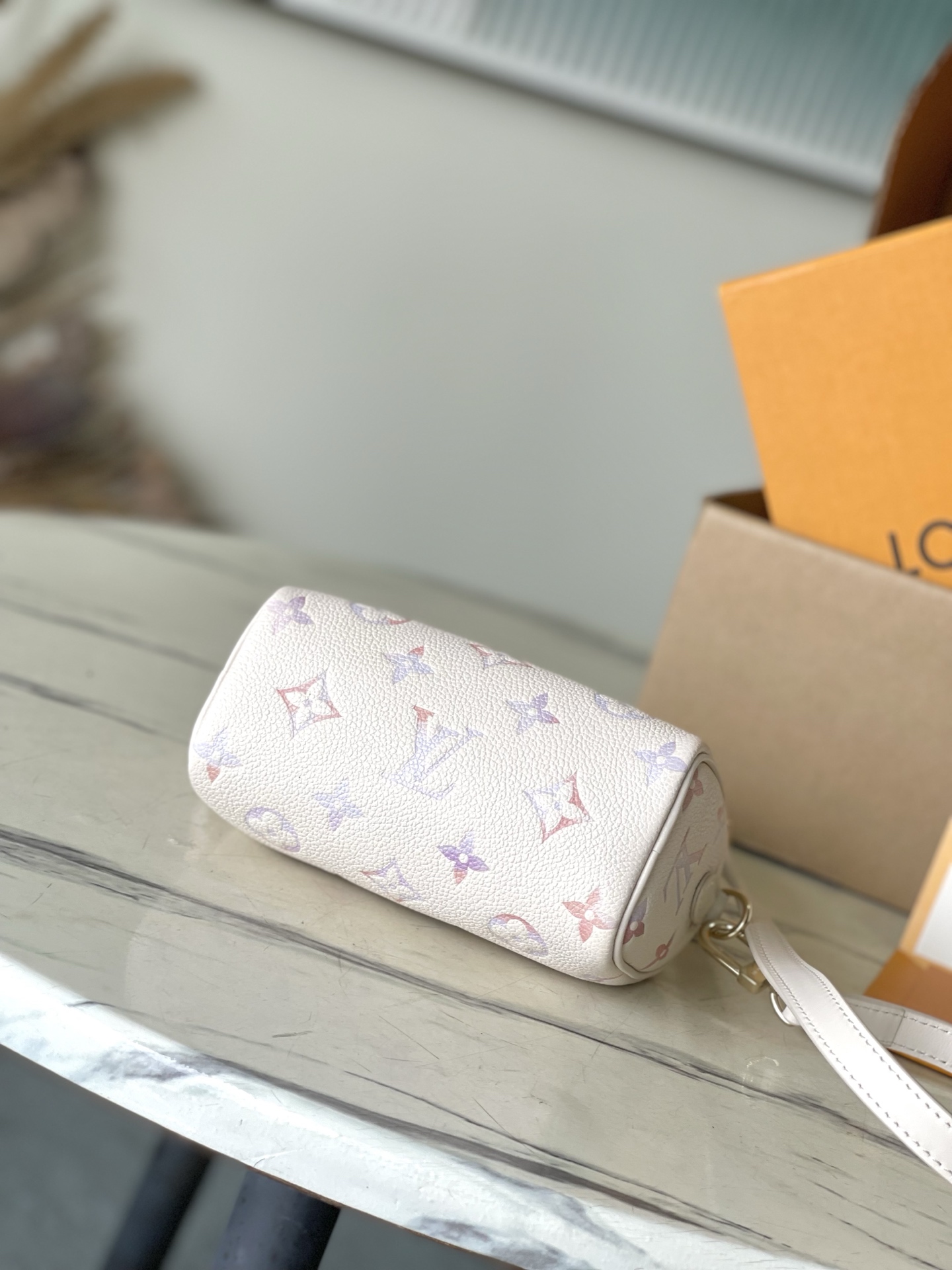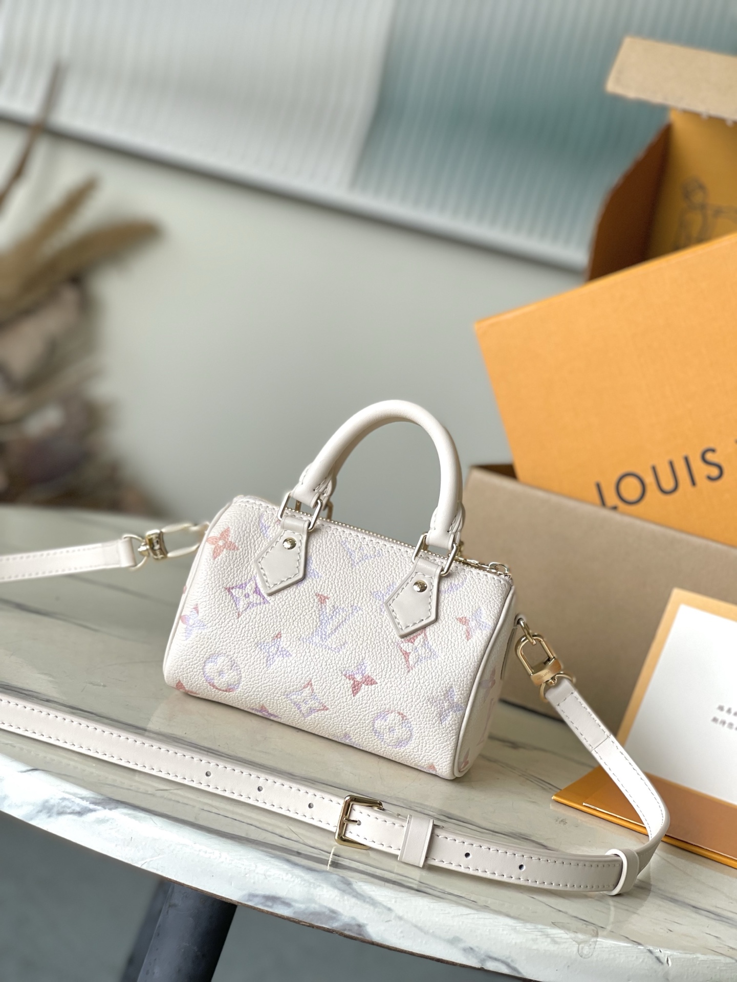 顶级原单 代购级免税版 M25591 本款NanoSpeedy手袋于新季浸染淡雅幻梦色彩,可轻松点亮各式造型。经典Monogram Empreinte皮革包身搭配金属件,充裕内里可容纳短款钱夹等日常所需,可拆卸肩带实现多种背携方式。尺寸:16 × 10 × 7.5 cm