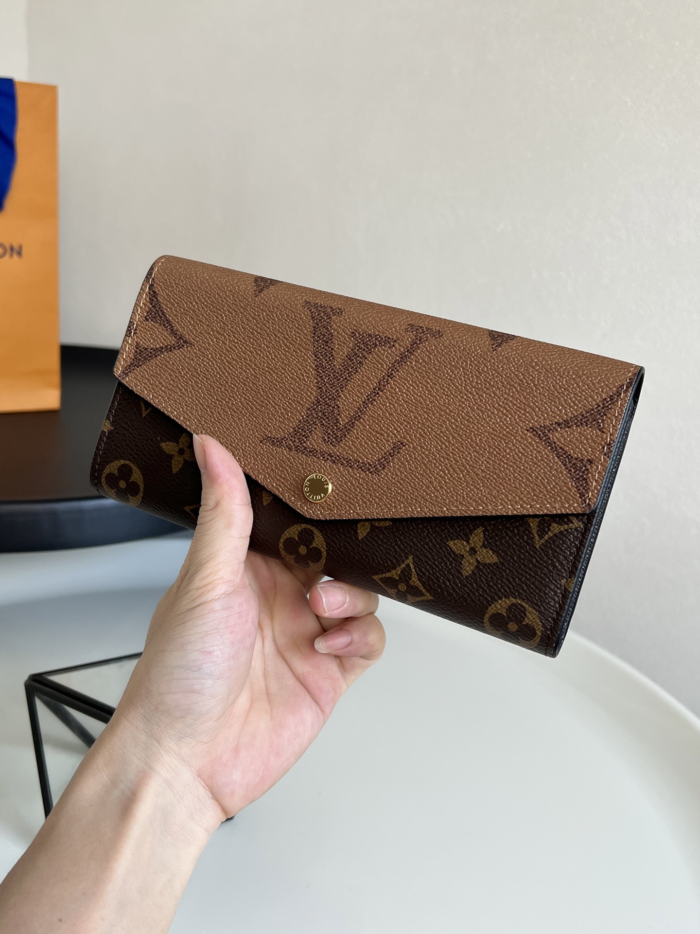 原单💕 M80726黄花 新款拼色信封包 这款信封式钱夹以优雅的 Monogram 帆布制成,内部设计精巧独特,拥有各种口袋和信用卡槽。19.0x 10.5x 2.5 cm (长x 高x 宽) - 19 x 9.5 x 1 厘米 - 16个信用卡槽、2个大号隔层用于存放纸币、拉链零钱包 - 小牛皮内衬 - 闪亮的金色金属配件