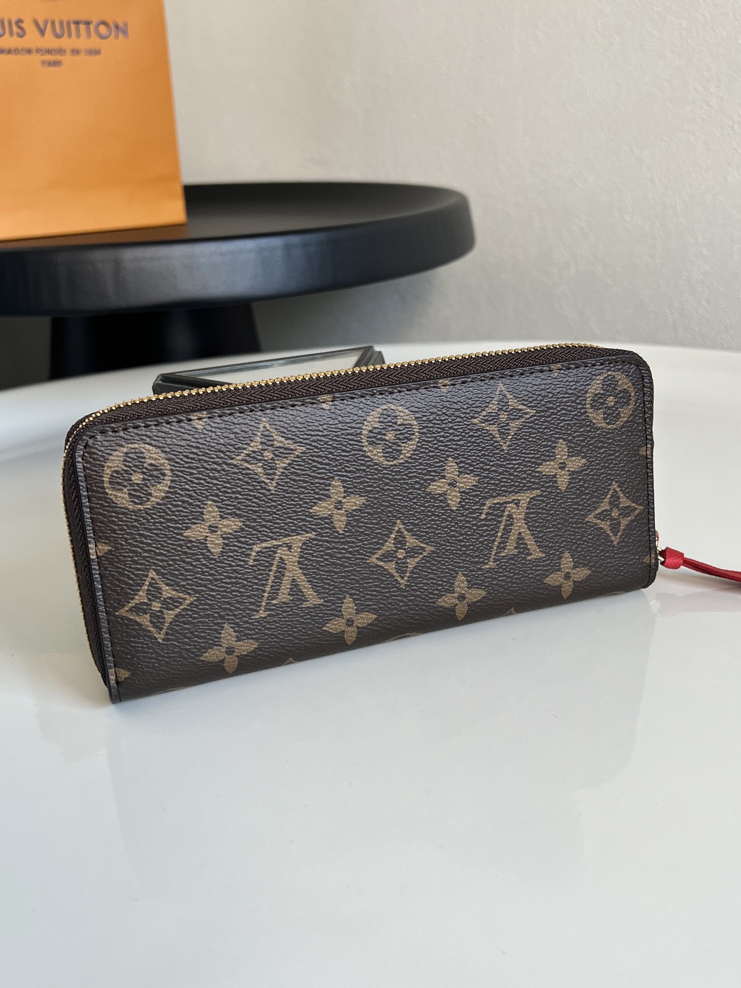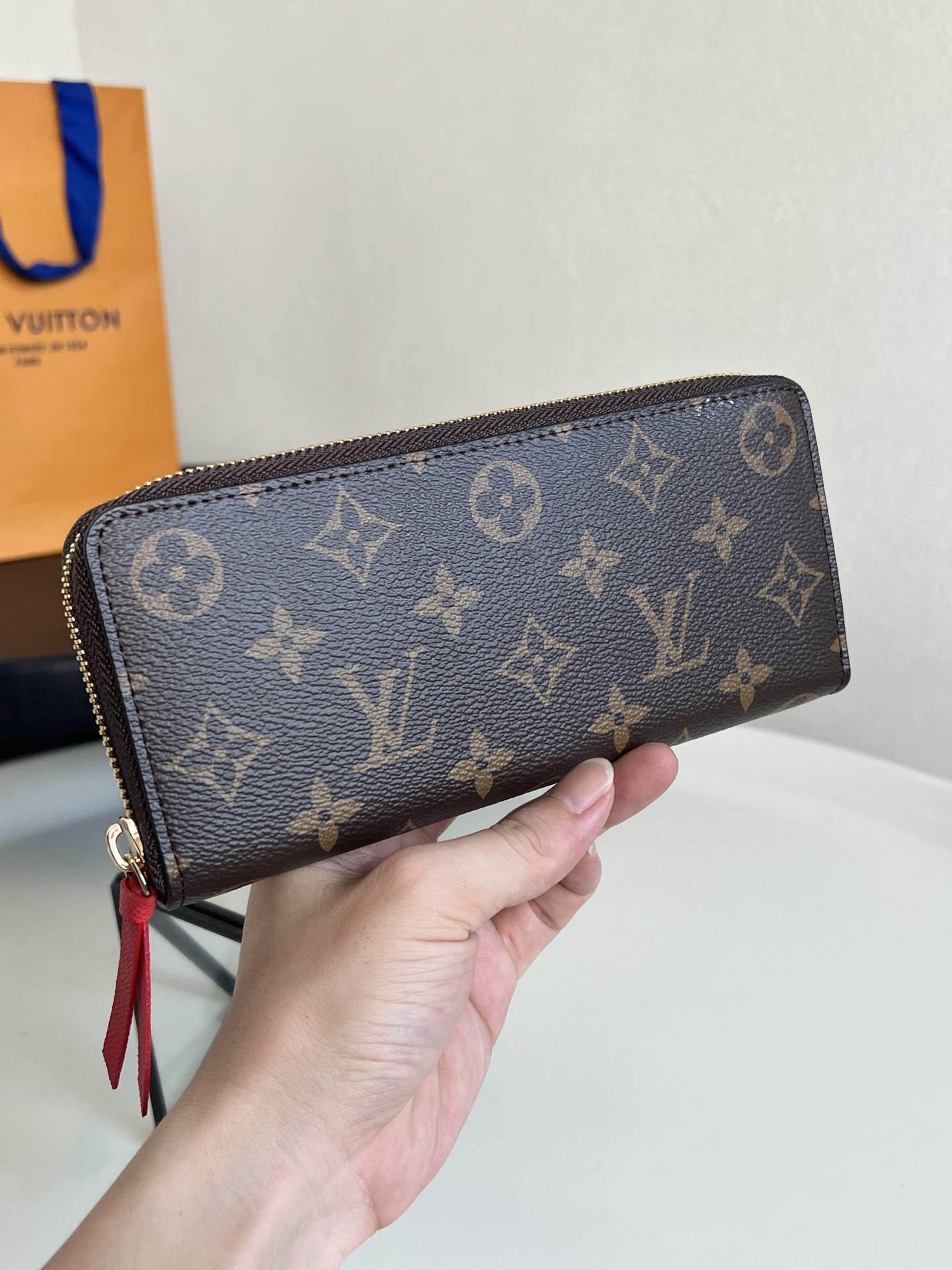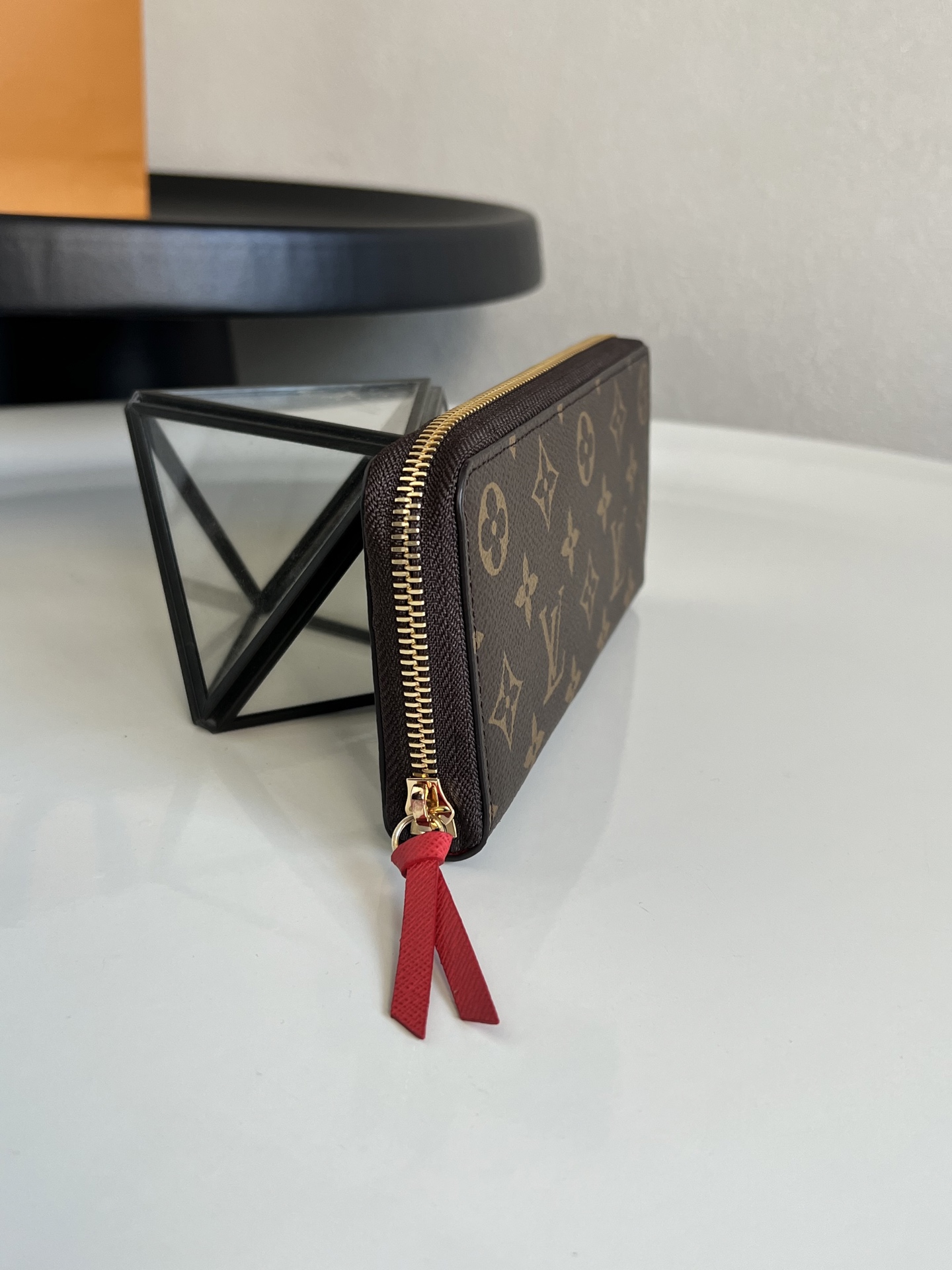 原单💕 M60742 红色 Clémence 钱夹,尺寸小,容量大,采用标志性的 Damier Azur 帆布制作而成。19.5x 9.0x 1.5 cm (长x 高x 宽) - 19.5 x 9 x 1.5 厘米- 8个信用卡槽- 1个拉链零钱内袋 - 2个用于存放纸币的大号接裆式隔层- 2个用于存放票据的扁平内袋- 1个皮质拉链头- 小牛皮内衬- 闪亮的金色金属配件。