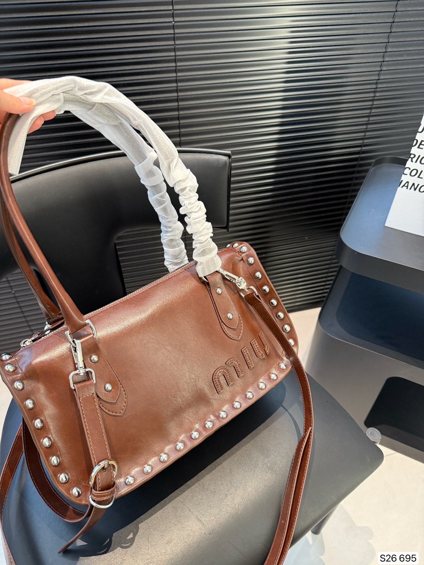 💰380 缪缪中古包 甜美系 Miumiu的叛逆一面|还是有一颗童心 最近觉得miumiu的中古包越发掘越有意思 这个小南瓜 一样的铆钉包 美式复古拿捏了 真的是很难不爱这只miumiu。侧边铆钉的一个设计。超级超级洋气。 尺寸:33 19 货号695