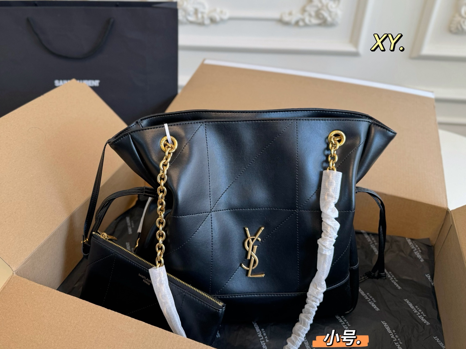 💰400 小号(飞机盒) size:29×28 YSL圣罗兰新款jamie large 💰ochon 托特包❤️ 又叫福袋包,装的满满都是福气 材质柔软,质感超好 高级感满满 包身抽绳设计 自重轻,容量超大 日常通勤背它回头率百分百💯