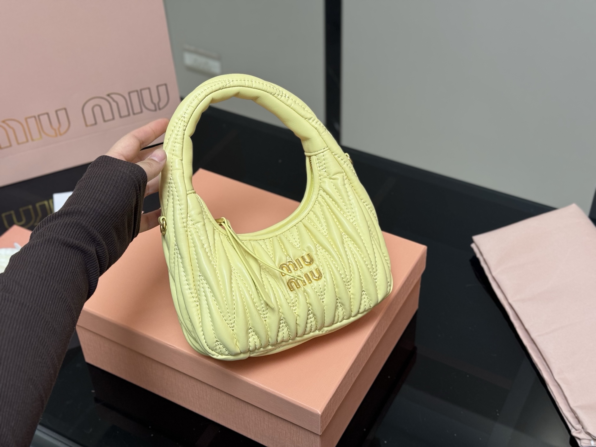💰350 配盒 size:22*11cm 可盐可甜的 MiuMiu 女孩 miumiu wander包包 好搭 什么风格都能驾驭 材质很柔软 容量也非常OK 复古俏皮的hobo包型 是近期几乎天天拿出门的包包!