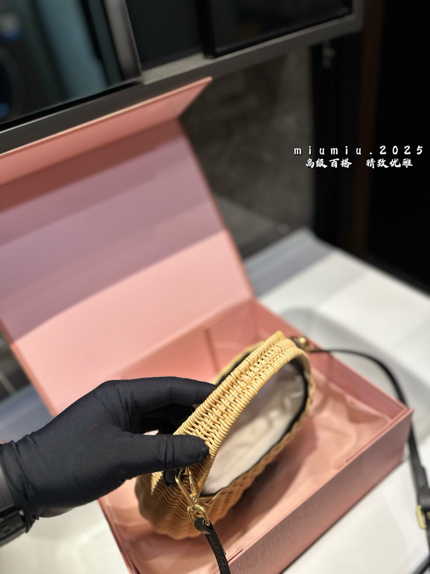❤️💰370(礼盒包装)❤️ miumiu夏日田园度假风编织菜蓝子缪缪夏日田园度假风编织菜蓝子包,5BC125,正面手工缝制皮质logo标,里面一个卡位隔层,搭配皮质长肩带,单肩手拎都可以,容量很好,手机纸巾,粉饼口红都能放,甜美百搭,踏青度假绝绝子。自各大品牌相继推出草编菜篮风格款包,我觉得只有MIU家是最用心的,精致好看,玲珑美观,绝对值得大家拥有。尺寸:23*16*7