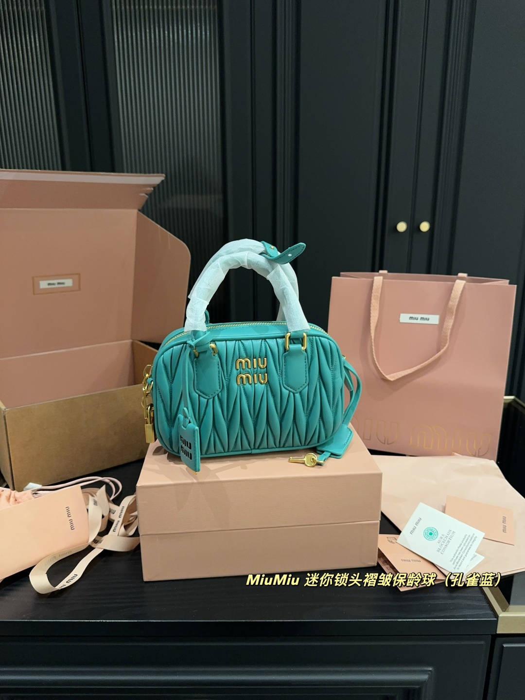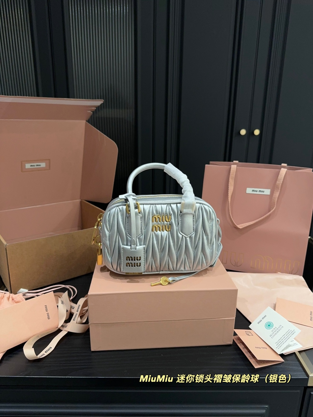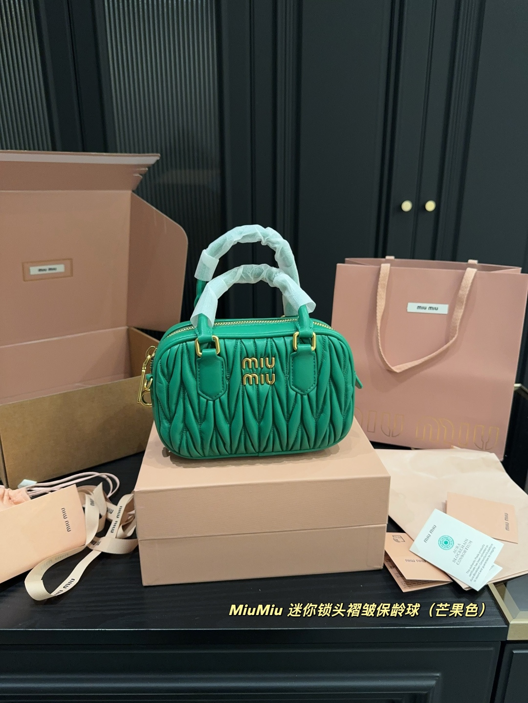 ✅高品小羊皮💰450全套包装⚠️尺寸20.13 MiuMiu 迷你锁头褶皱保龄球