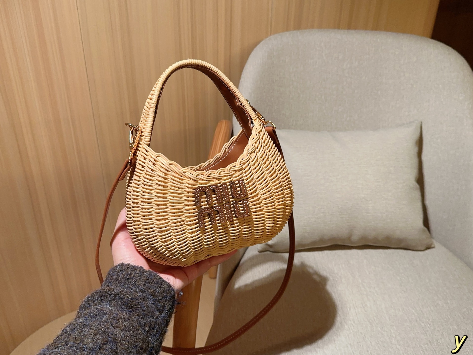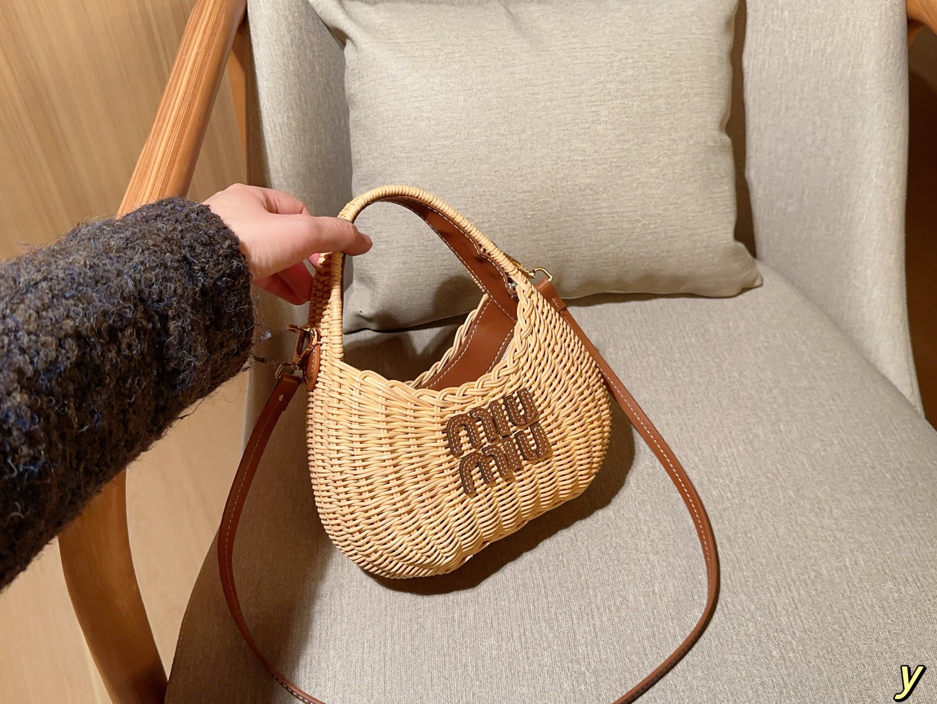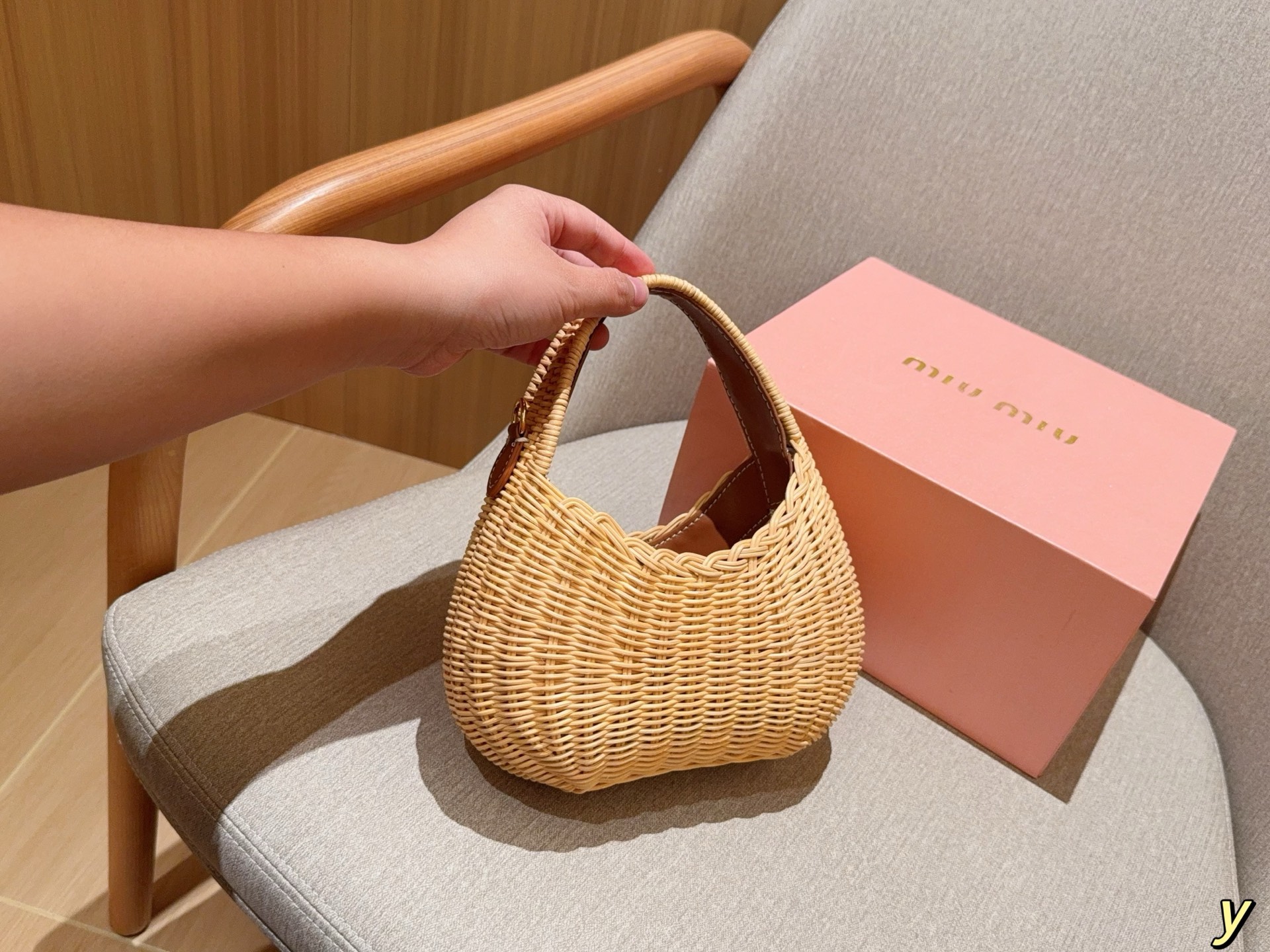 💰385 miumiu/缪缪 新款草编包Basket Bag 菜篮子 编织拼皮沙滩度假⛱️手提包/斜挎包 尺寸:20×15×7 礼盒包装🎁