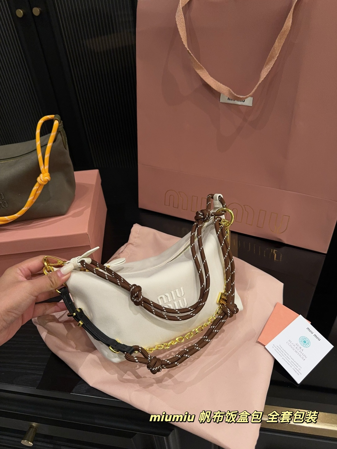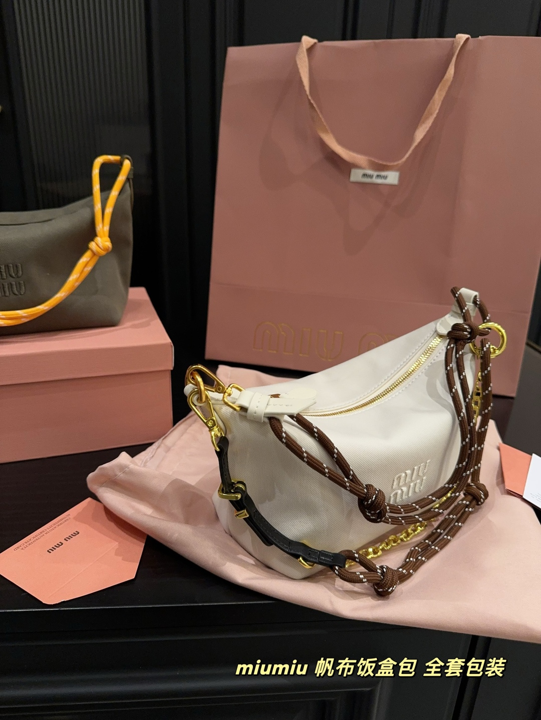 💰360全套包装⚠️尺寸18.14 miumiu 帆布饭盒包 绳结Hobo