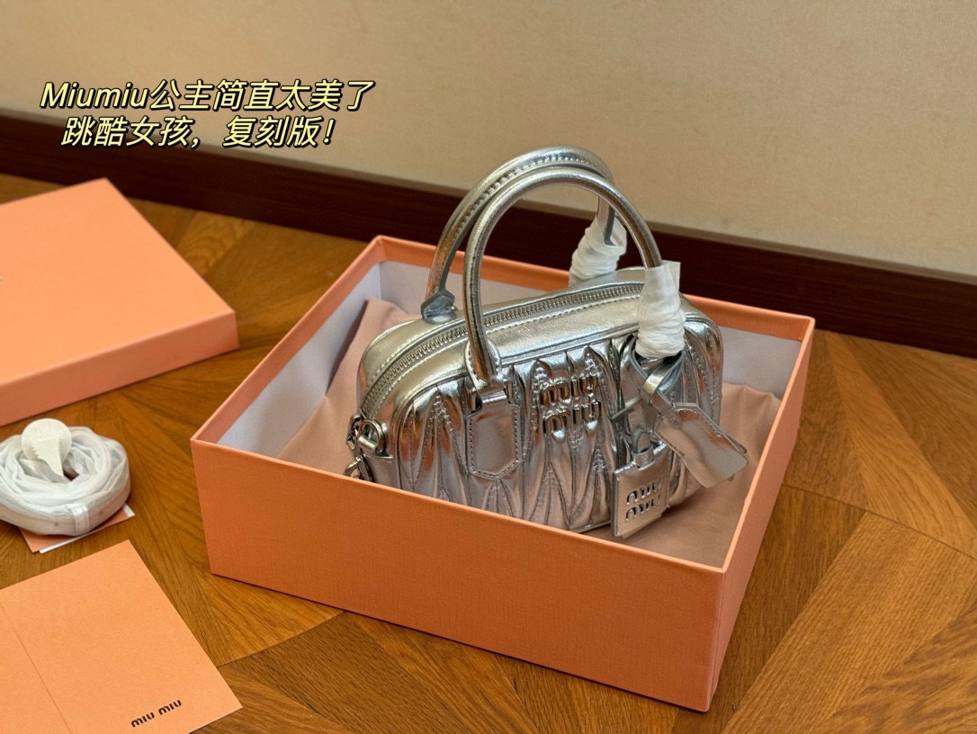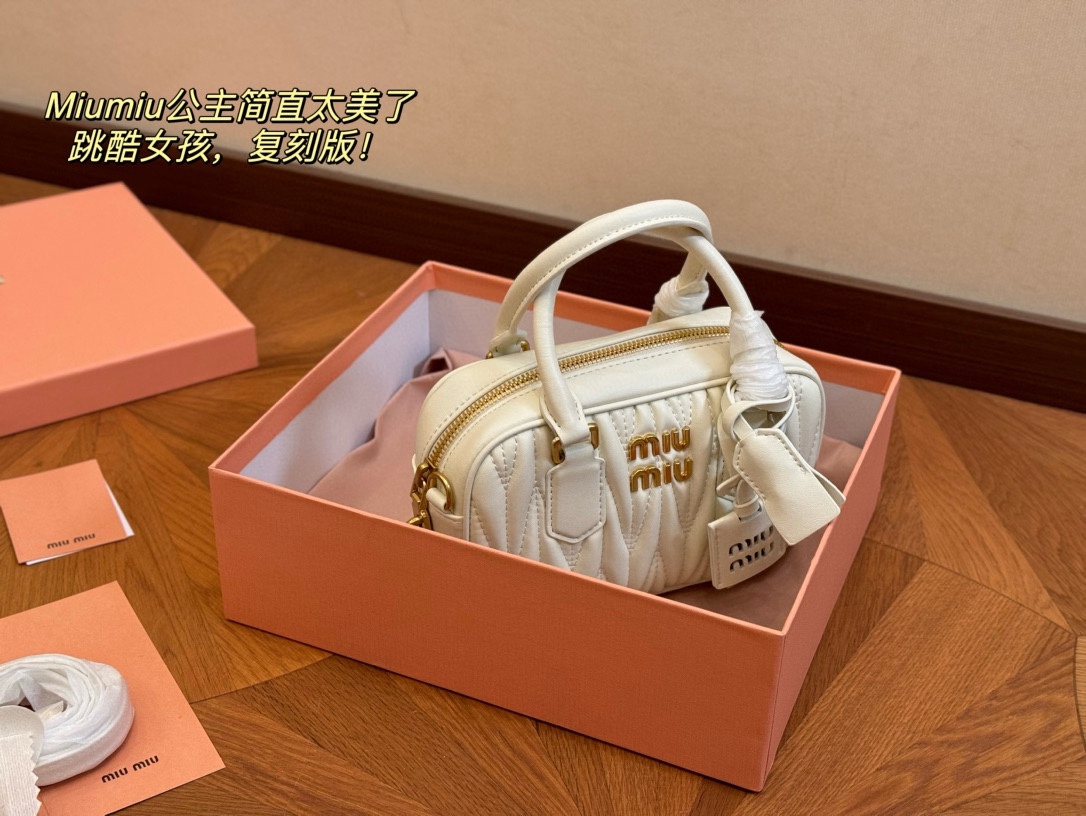 💰410升级版配盒 size:20*14cm miumiu保龄球包包甜度刚好! 很难不爱啊啊! 又奶又千金的感觉! 可手拎也可斜挎 绝对不是小废包哦!容量足足的~~ 出场就是miumiu小公主!