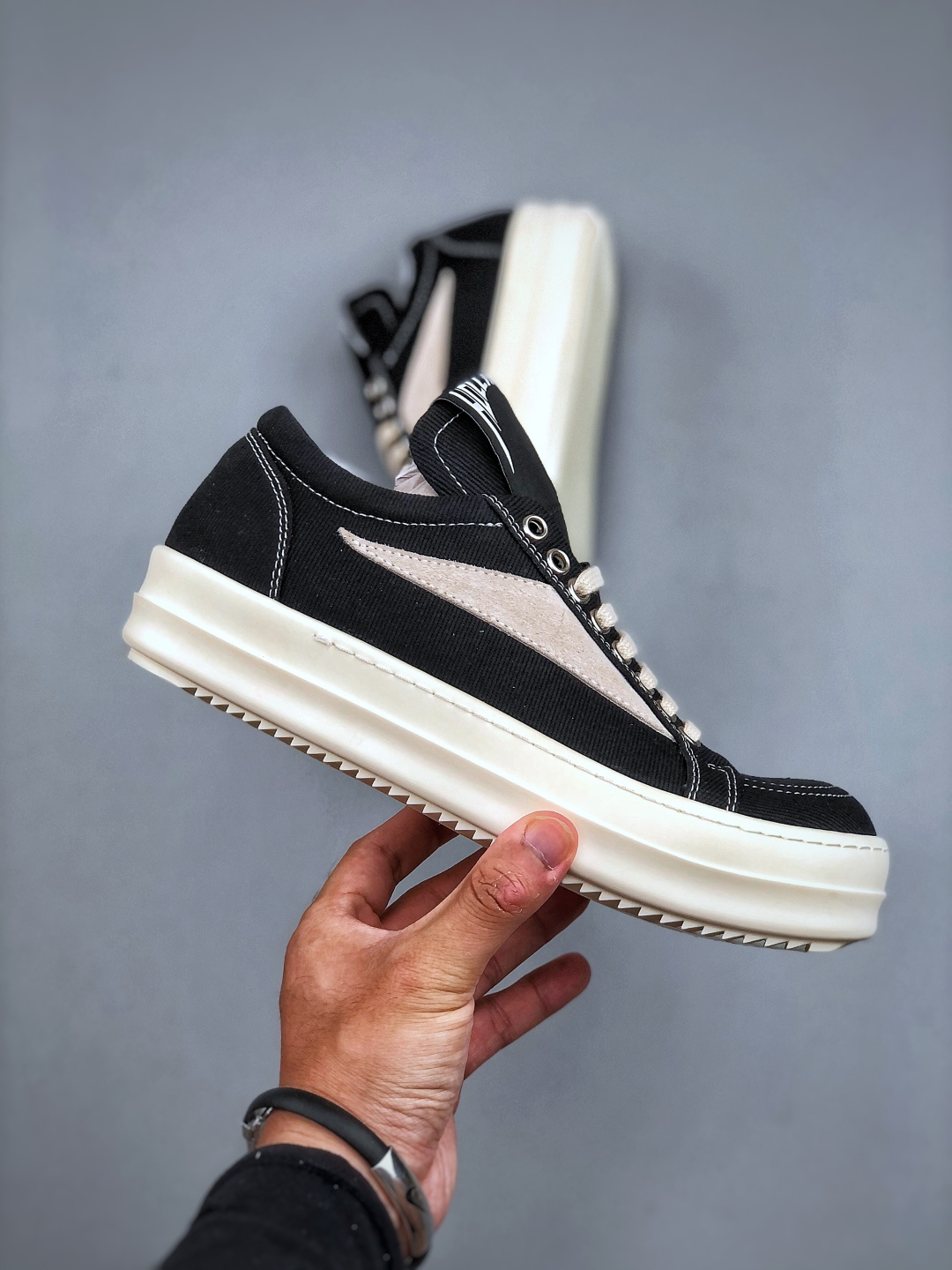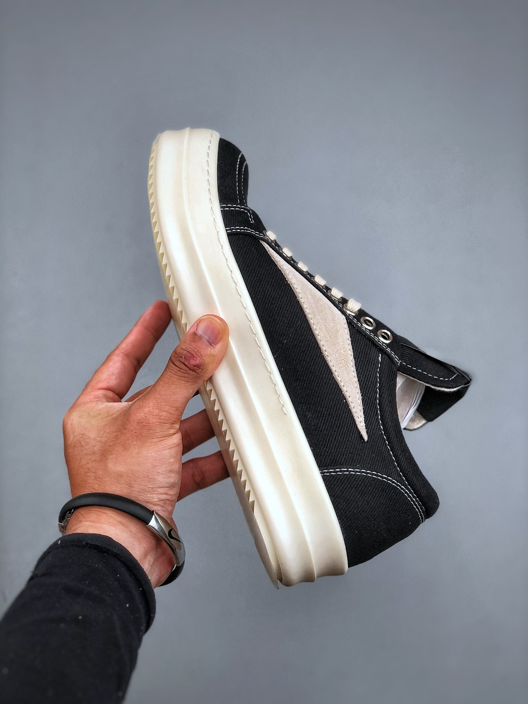 Rick Owens DRKSHDW Hollywood 瑞克·欧文斯 【款式】 帆布款/低帮/ 长鞋舌款 黑色 【面料】 东莞原厂进口全新2025年新材质 高丝光轻绒感12盎司帆面 【鞋带】 鞋带采用水染定织法工艺,高密度之下,透出光泽感! 【鞋头】 奶白色小牛皮,软糯,轻轻按压有牛皮细细的纹理质感! 【鞋底】TPU大底奶香味!硬度、肤感一比一!鞋底logo钢印清晰正确! 【鞋垫】整张牛皮鞋垫+logo ,独家私人开模冲孔! 【尺码】 :36 37 38 39 40 41 42 43 44 45 46 适应外贸业务,超大尺码!