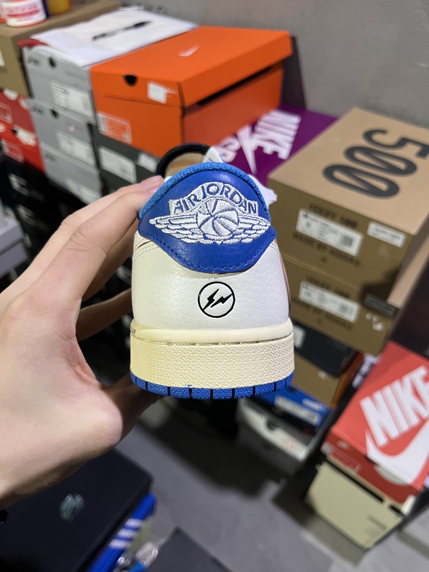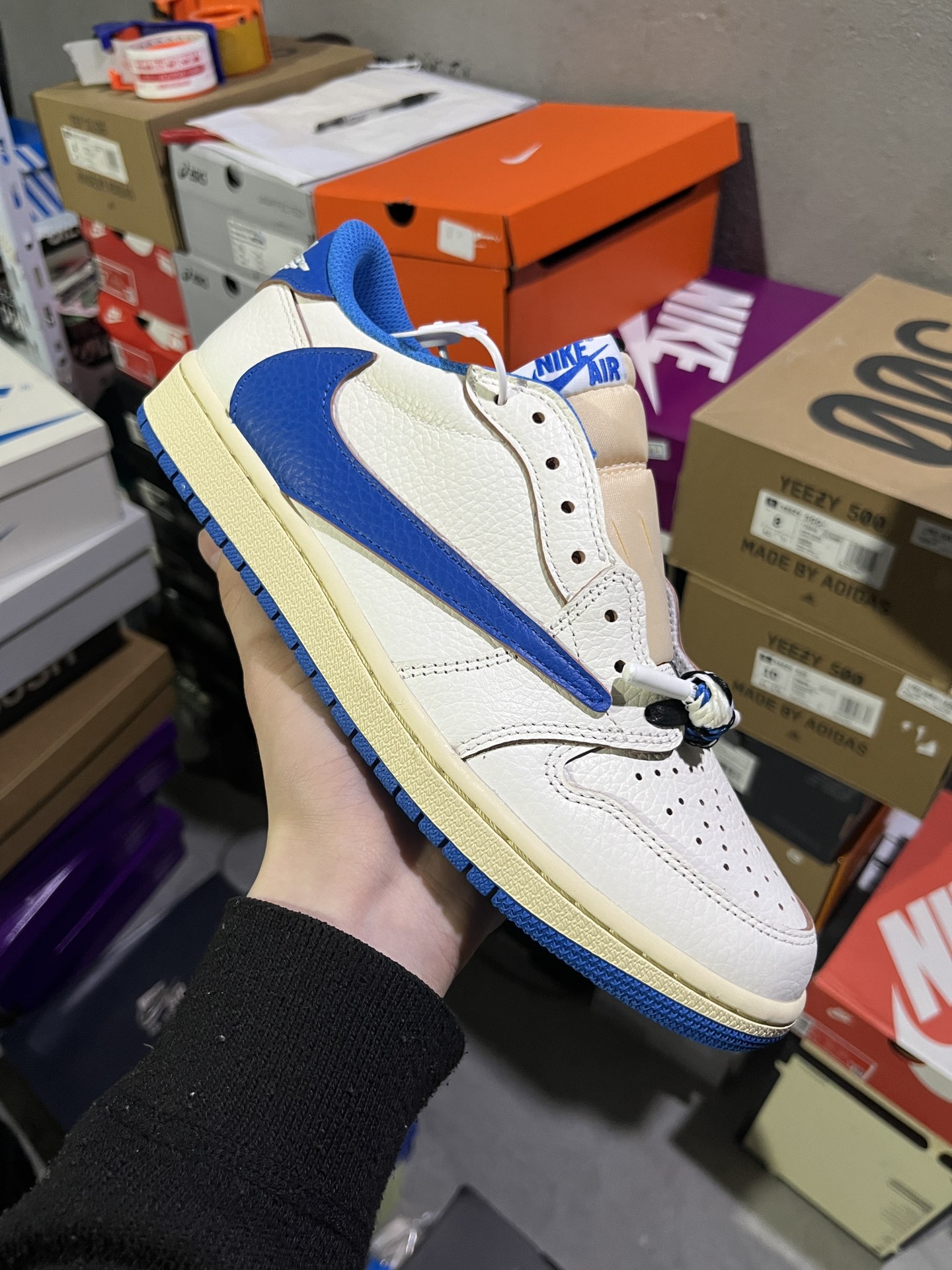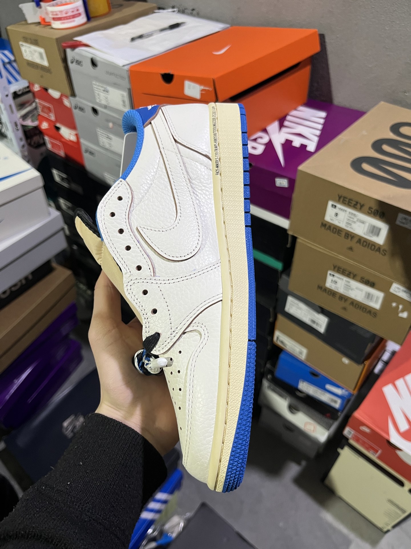 #实拍鉴赏 #仓库随手拍上新 #新F版/KZ神版 💰180 Travis Scott x Fragment Design x Jordan Air Jordan 1 Low OG SP 倒钩 三方联名闪电 低帮 篮球鞋 男女同款 白蓝 货号:DM7866-104 尺码:36-47
