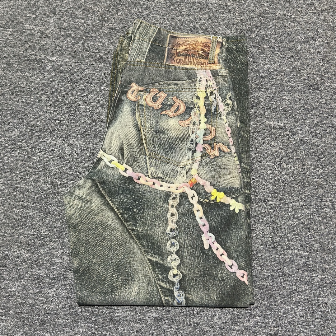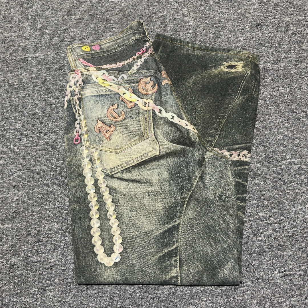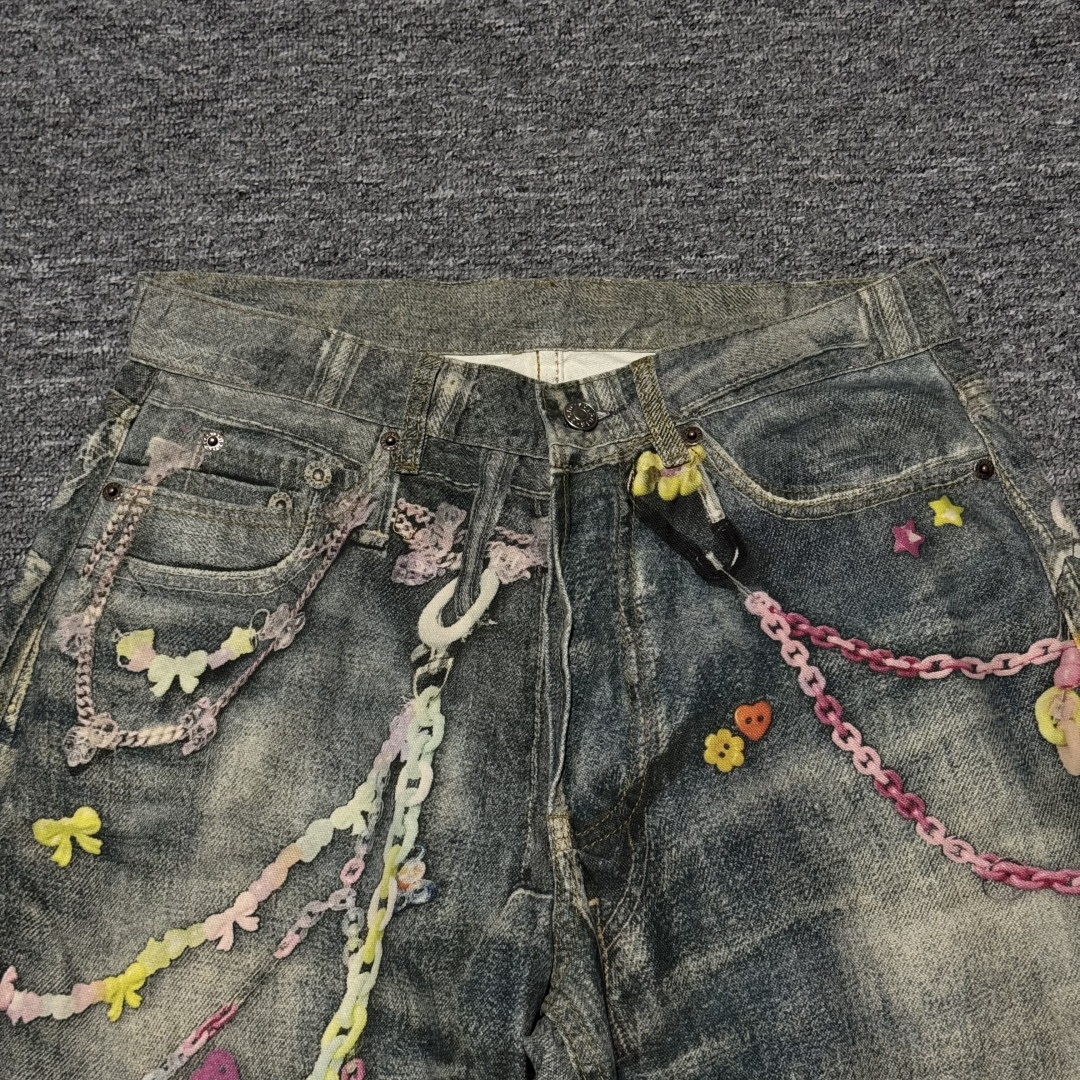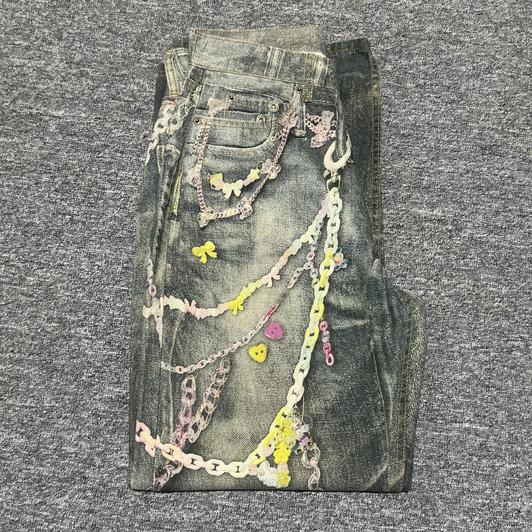 💰340 S# Acne Studios 25FW 糖果链条印花牛仔裤 真正原版购回开发打版 高端零售专供 品质保证 100%放心出街 尺码:46 48 50 (拍摄灯光有跳灯问题颜色偏差 实物颜色为正品🆚大货对比图 )编号:39OFUT82 面料采用10支斜纹白胚长绒棉织成,面料整匹数码直喷,进口机器清晰度完全还原无色差 纽扣开模logo,所有印花接缝位置全部对位缝合,市面很多版本觉得对位难做把因为位置移动了(比如后腰皮牌中间都有一根缝线,很多版本觉得不好做都把缝线移动到了皮牌下面) 印花精度要求极高:3D错视效果需要精准还原链条的立体感和色彩层次 而市面常见的是胶浆印花工艺 大货仅印花调色/细节修正就反复8-10次 市面普通工厂难以达标 大货采用“先印花后裁剪”的单片裁剪工艺 激光定位切割裁片 保证缝纫时印花图案对位精准,一旦偏移同样无法保证整体视觉效果,总的来说这条看成型的立体效果就对了 秒杀市面99的产品 原版印花后做喷马骝/酵素洗做旧 水洗力度和化学试剂浓度 避免印花脱落、褪色不均 这些都是需要反复调试的,市面大多数机器不正确 工艺顺序更是一言难尽 独家原版定制三标辅料