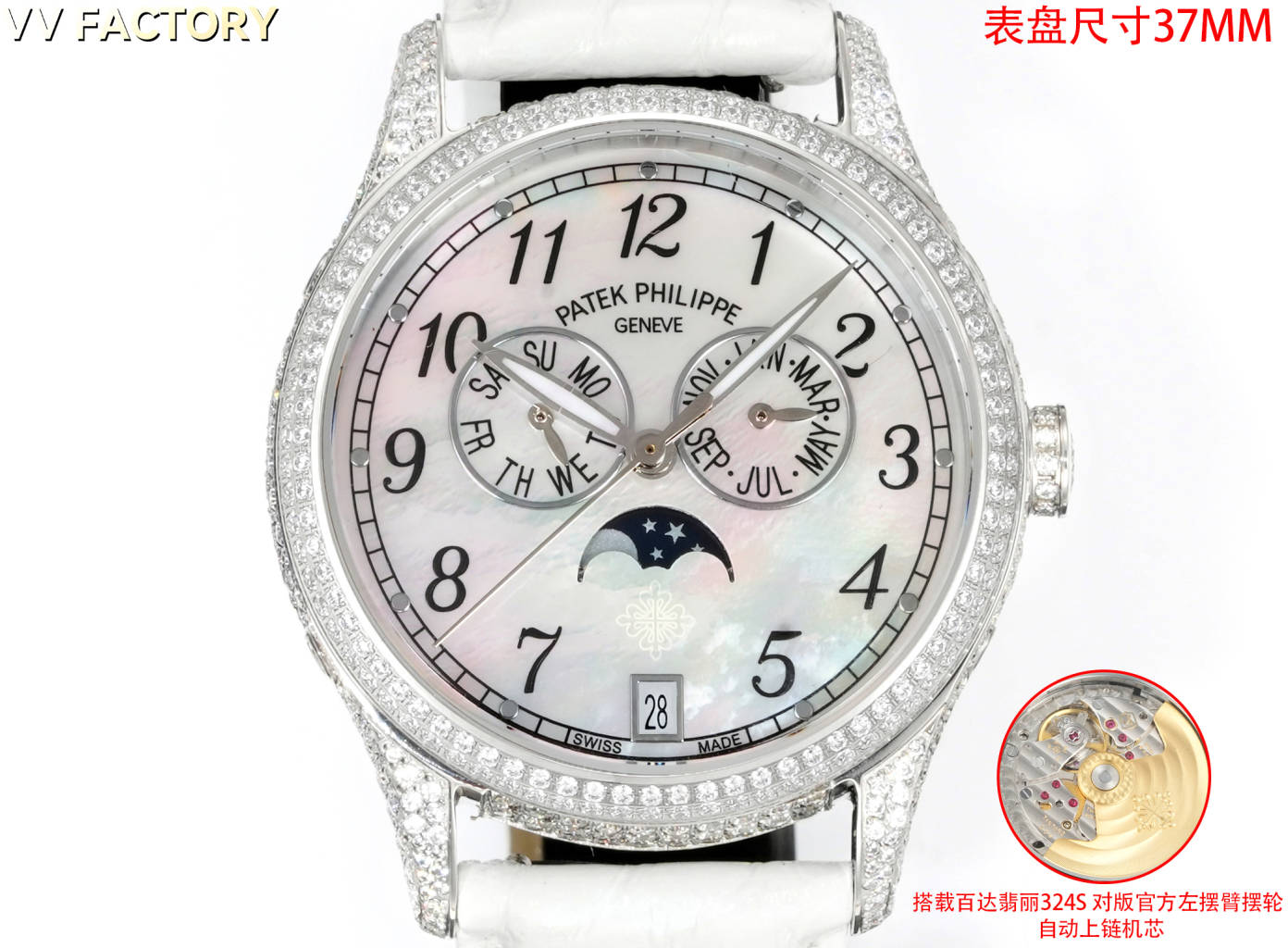 VV Factory 出品 🌐鳄鱼皮送牛皮 2025最新推出 百达翡丽复杂功能时计⌚PP姐妹款, ❤️38mm尺寸 4947G,4947R,4948G,4948R 🧡37mm尺寸 4936G,4936R,4936J,4937G,4937R 搭载多功能的设计,奢华的女士腕表,由众多精美的细节,勾勒出它最美的样子。或装饰以华美的贵金属,或点缀有璀璨的钻石,令人赏心悦目。37和38的表径,11毫米的厚度,上手舒适贴合 【表壳专注】玫瑰金与白金款式,外壳由精钢904 采用EPPT电镀技术 1️⃣【表盘细节】分别有布纹、贝壳、放射等面,真材实料不惜成本复原,数字刻度,💓表耳间距采用官方对版尺寸19-14,历时半年开模研发,不同于市场其他版本19-16表耳尺寸,还原官方标准尺寸✨ 2️⃣【镶钻技术】采用“莫桑钻”镶嵌,由于镶嵌难度大,尽可能复原尺寸大小与位置 表径37mm 38mm 厚度11mm 3️⃣采用原装进口9015自动机械 作为基础机芯 复刻Cal.324 S QA LU机芯 复原ZP一样“左”摆臂摆轮 4️⃣日历可快调或顺时跳, 月相一个月转一圈,可快调 5️⃣ 星期由日期带动转跳,可快调 6️⃣ 月份与ZP一样手动调,可快调 7️⃣【表扣】搭配14MM🏹️箭型Patek Philippe原厂级针扣。整扣采用十字卜形为基础必赋予大面积平面及斜边位叠机高光处理,原版三角形例仔,并全部电镀白金,黄金及玫瑰金,最大程度还原质感 8️⃣【表带】采用自然裂纹鳄鱼皮,以及缝线的装饰下更显素雅、优美之感。手动拆卸伸耳,下单即送竹节纹牛皮,🎁10个颜色,任意搭配🌐