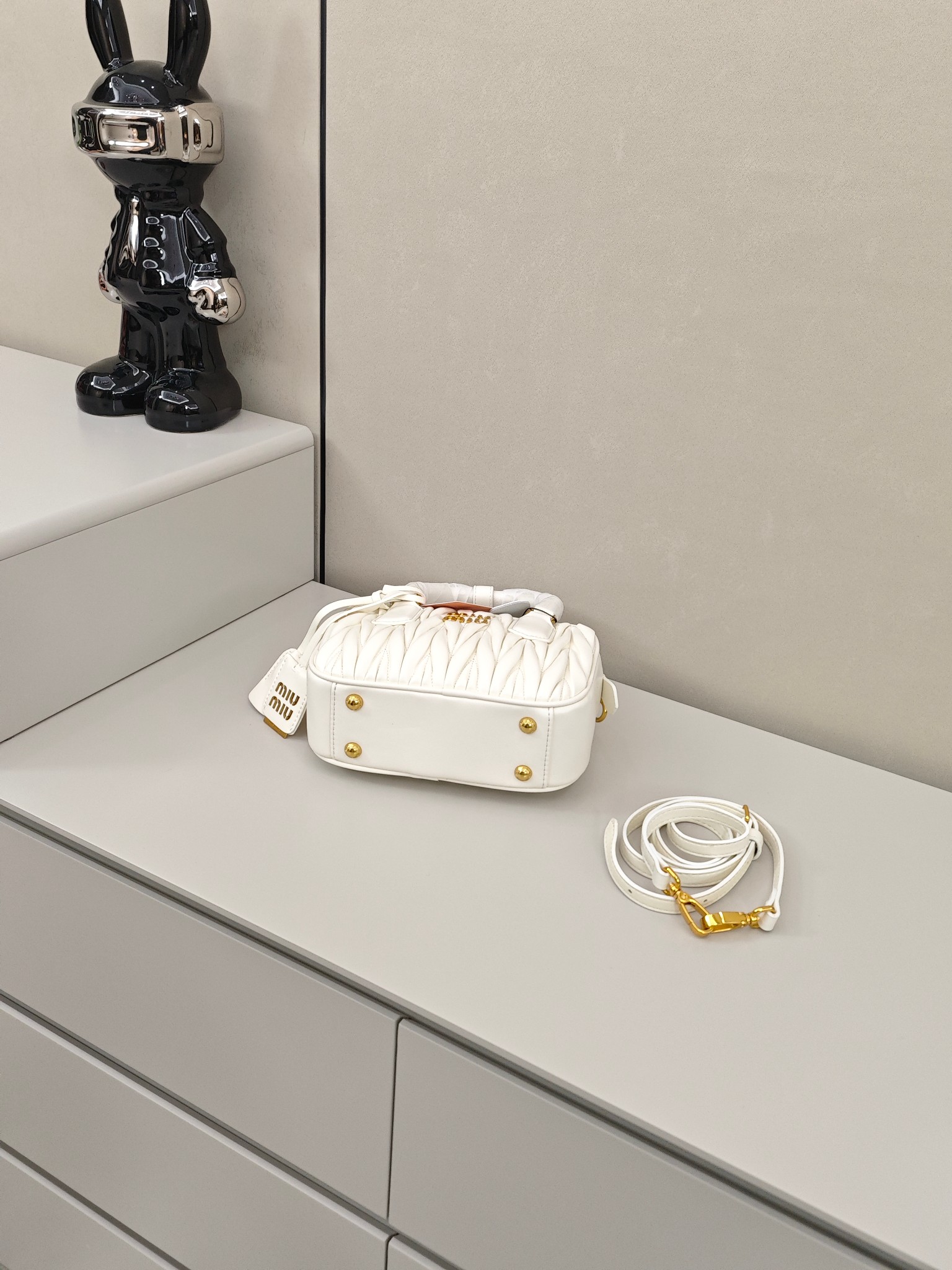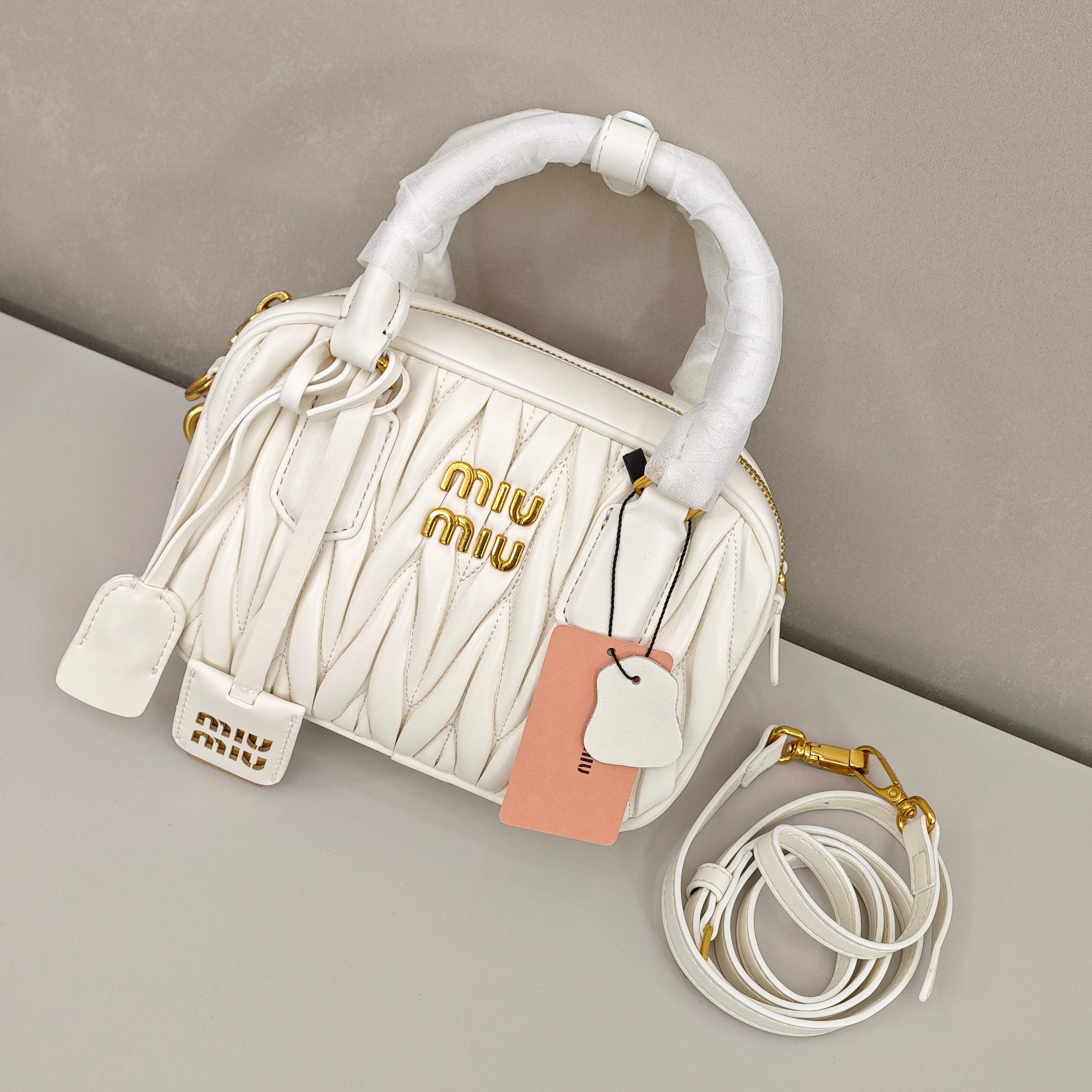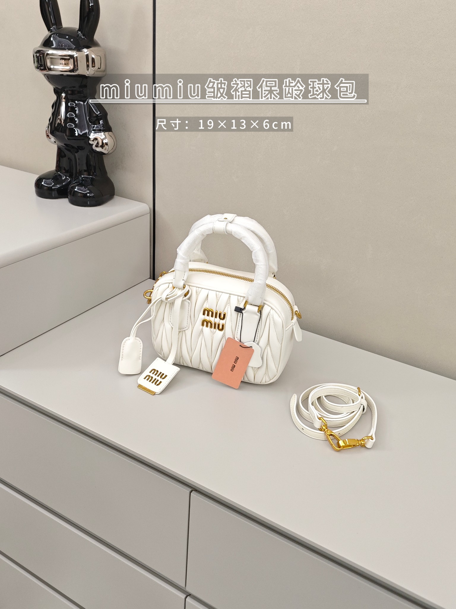 miumiu褶皱保龄球包💰260 尺寸:19×13×6cm 简介:拉链式开合,皮料亲肤柔软,内部空间可放下手机充电宝等随身物品,搭配可拆卸长肩带,可手拎/可斜挎背。