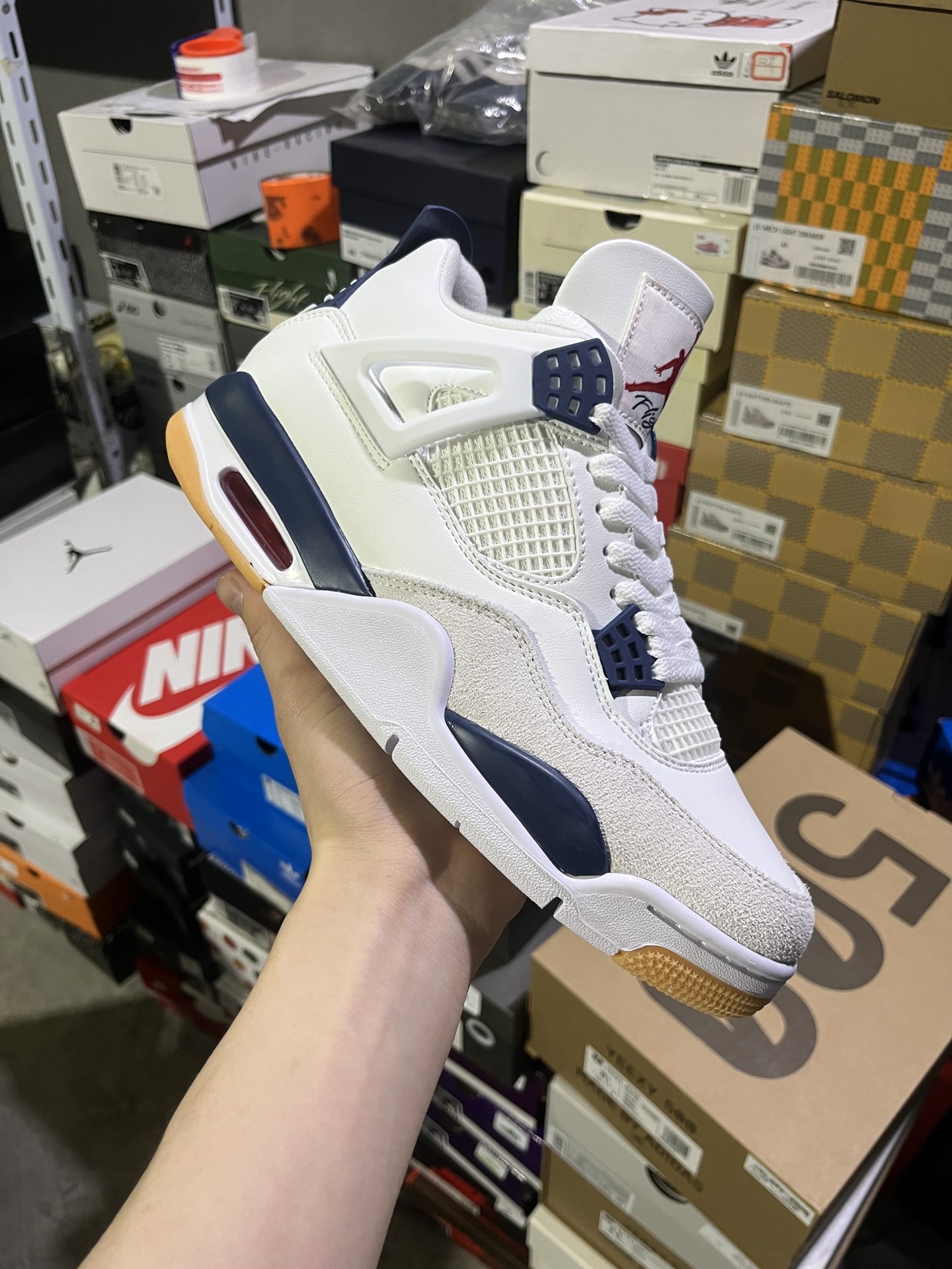 #实拍鉴赏 #仓库随手拍上新 #Z版公司级 💰110 Nike SB x Jordan Air Jordan 4 "Navy" 织物人造革 联名款 耐磨 中帮 复古篮球鞋 男款 白蓝 货号:DR5415-100 尺码:36-47