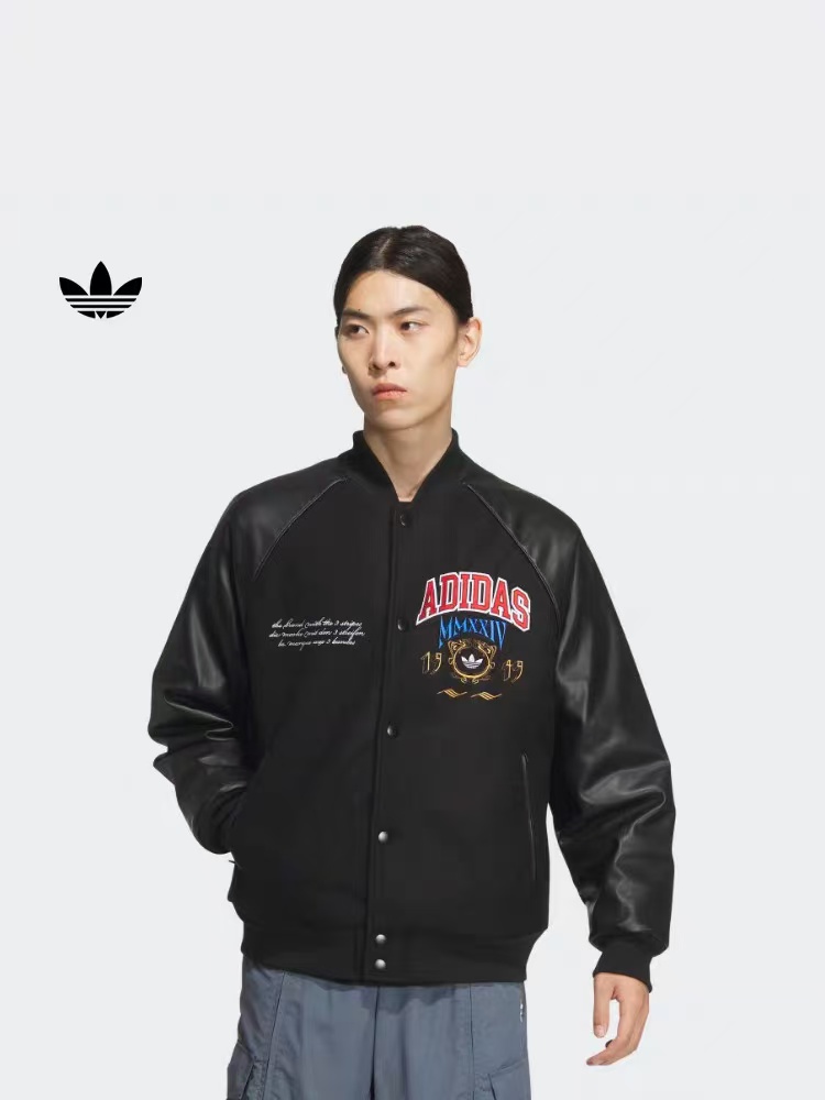 ADIDAS 刺绣logo拼皮夹棉棒球服外套 上身效果#