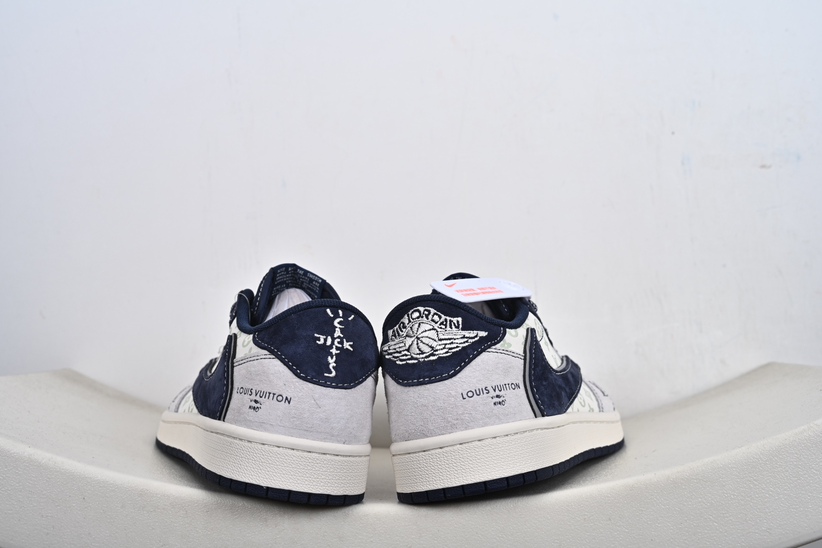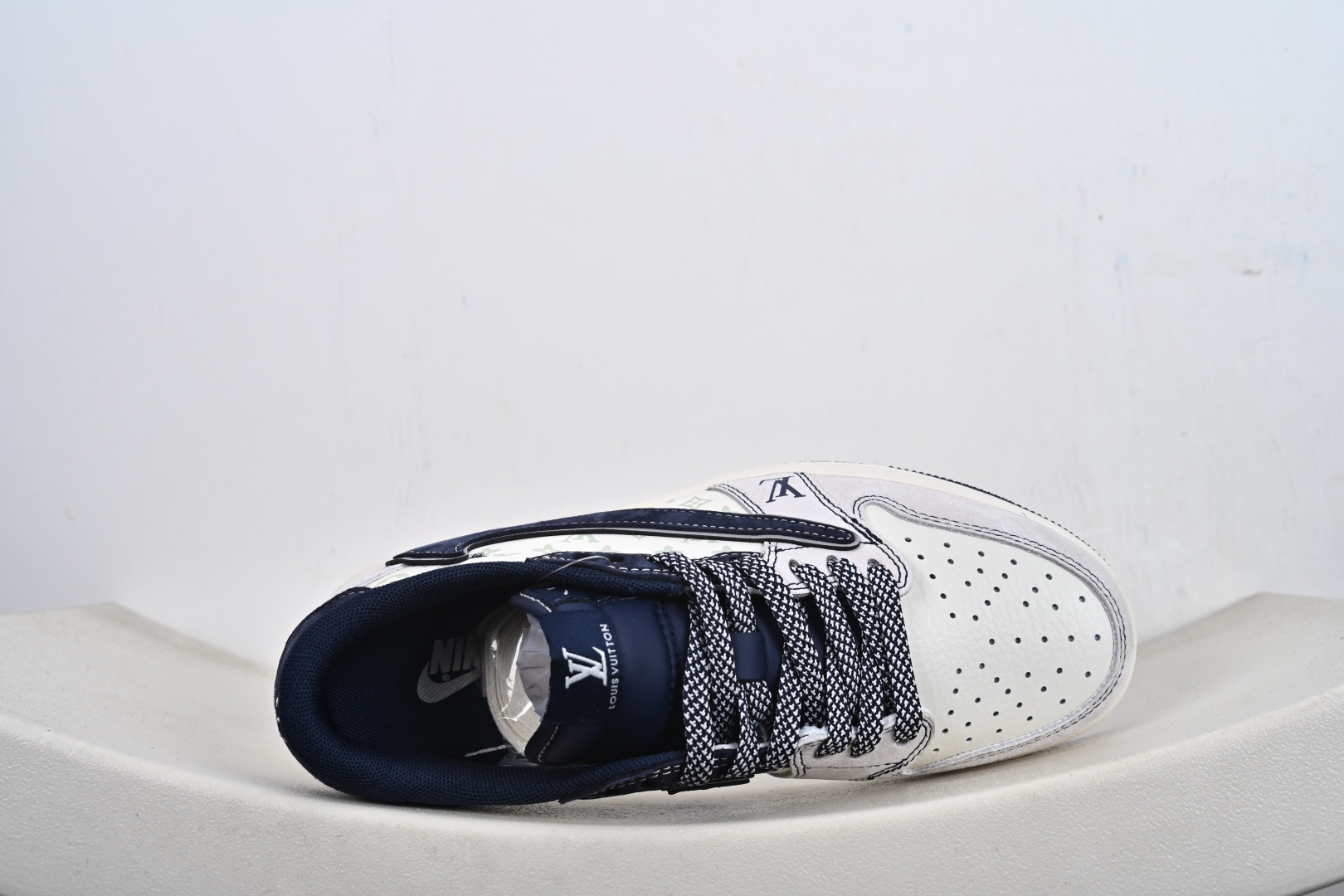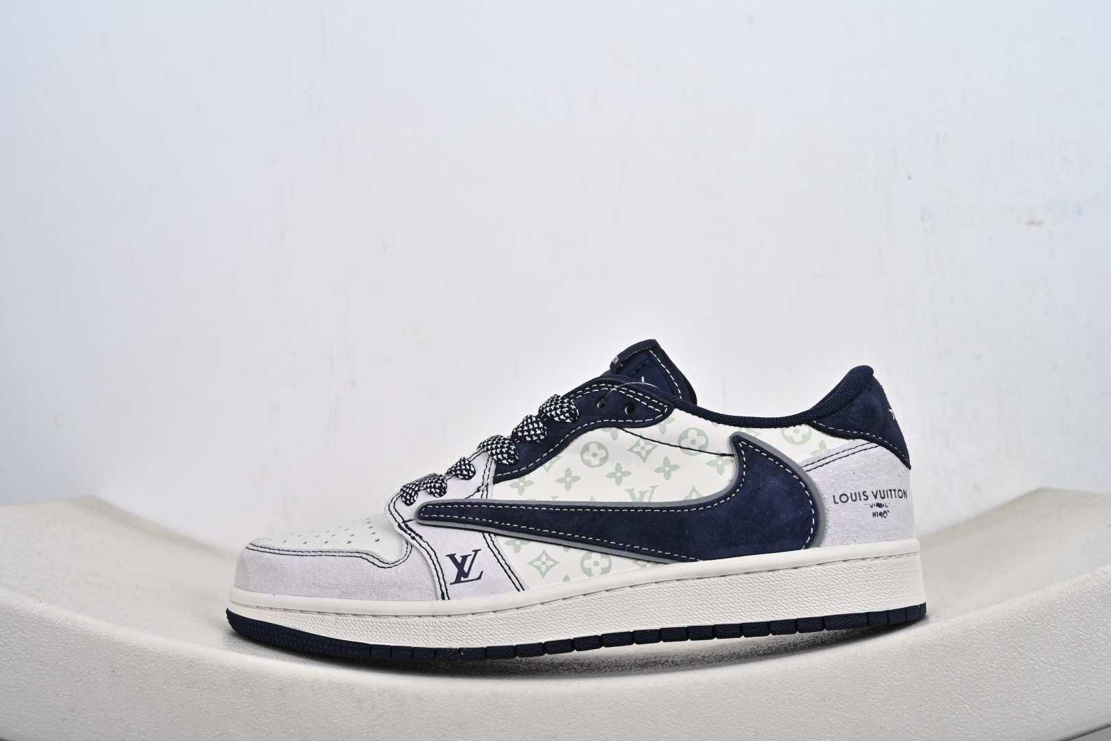本地💰250支持放店 奢潮顶流,传奇碰撞|Air Jordan 1 Low x LV定制款 当篮球传奇Air Jordan 1 Low邂逅奢侈巨头Louis Vuitton,这双CX5050-Y37直接将高奢质感与街头传奇揉成了潮流新范本!鞋身以雾面浅灰麂皮打底,搭配深海蓝翻毛皮鞋帮与鞋舌,冷调配色高级感拉满;鞋侧满印LV经典老花图案,鞋头的LV字母标识、后跟的“LOUIS VUITTON 1854”字样,将奢牌底蕴刻进细节;反钩Swoosh设计打破常规,让经典AJ1轮廓多了几分不羁的潮流态度。经典的中底与外底组合保留了AJ1的复古脚感,上脚既能驾驭高街穿搭,又能彰显奢潮品味。无论是收藏级玩家还是潮流爱好者,这双AJ1 Low x LV定制款都是鞋柜里的“王炸”单品,让你在潮流赛场中轻松站在金字塔 Size:36 36.5 37.5 38 38.5 39 40 40.5 41 42 42.5 43 44 44.5 45-G1-F2