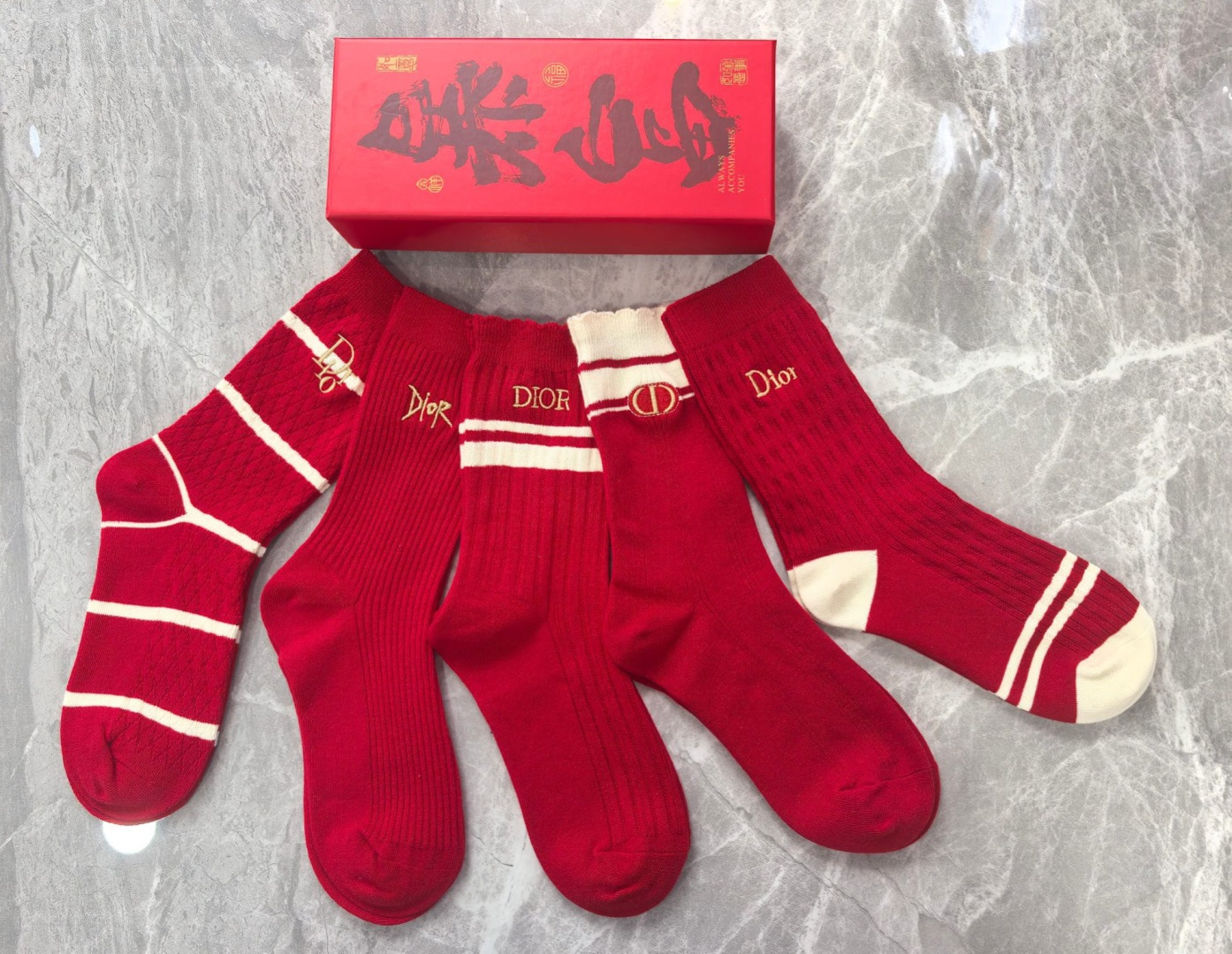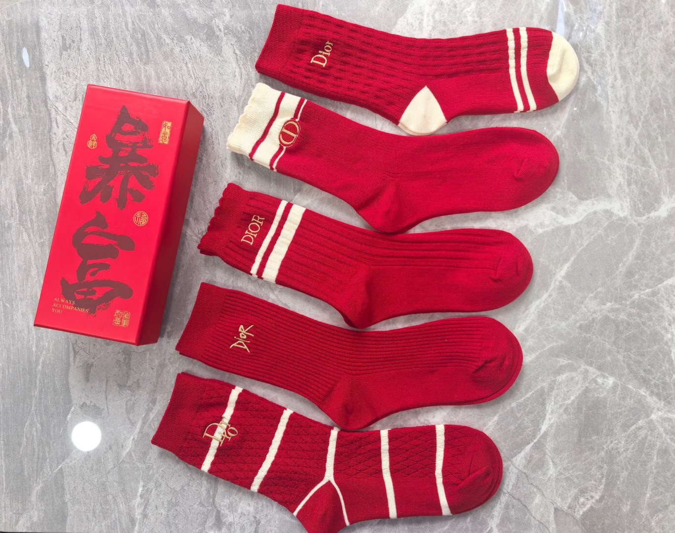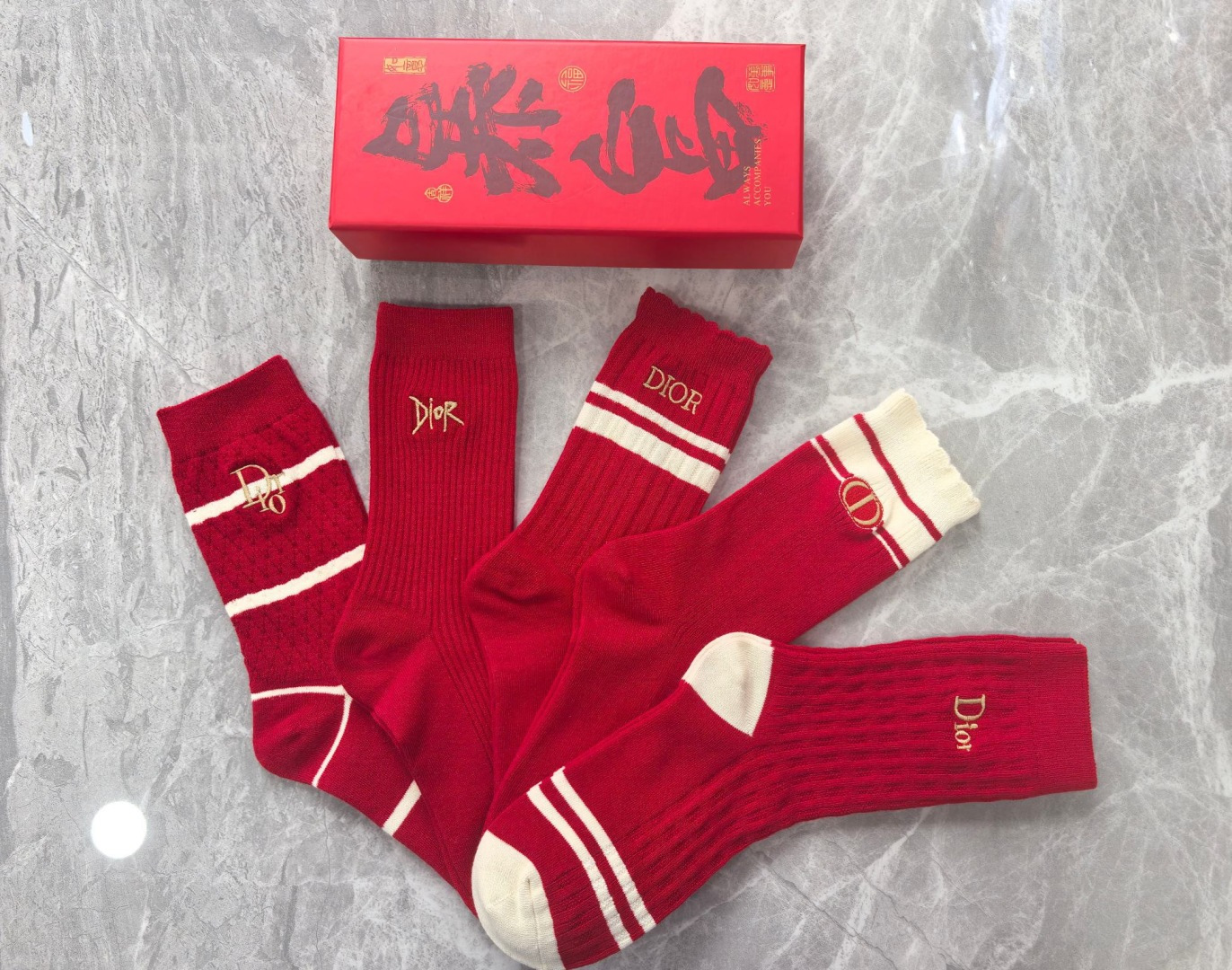 特价💰99💛配包装 红红火火 大红袜 DIOR(迪奥)🧧新款经典刺绣中长款堆堆袜袜子!一盒五双,专柜同步筒袜袜子,💛大牌出街,潮人必备🔥超好搭。