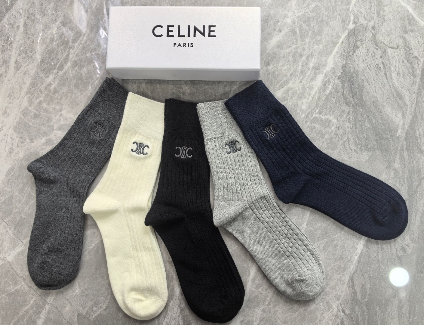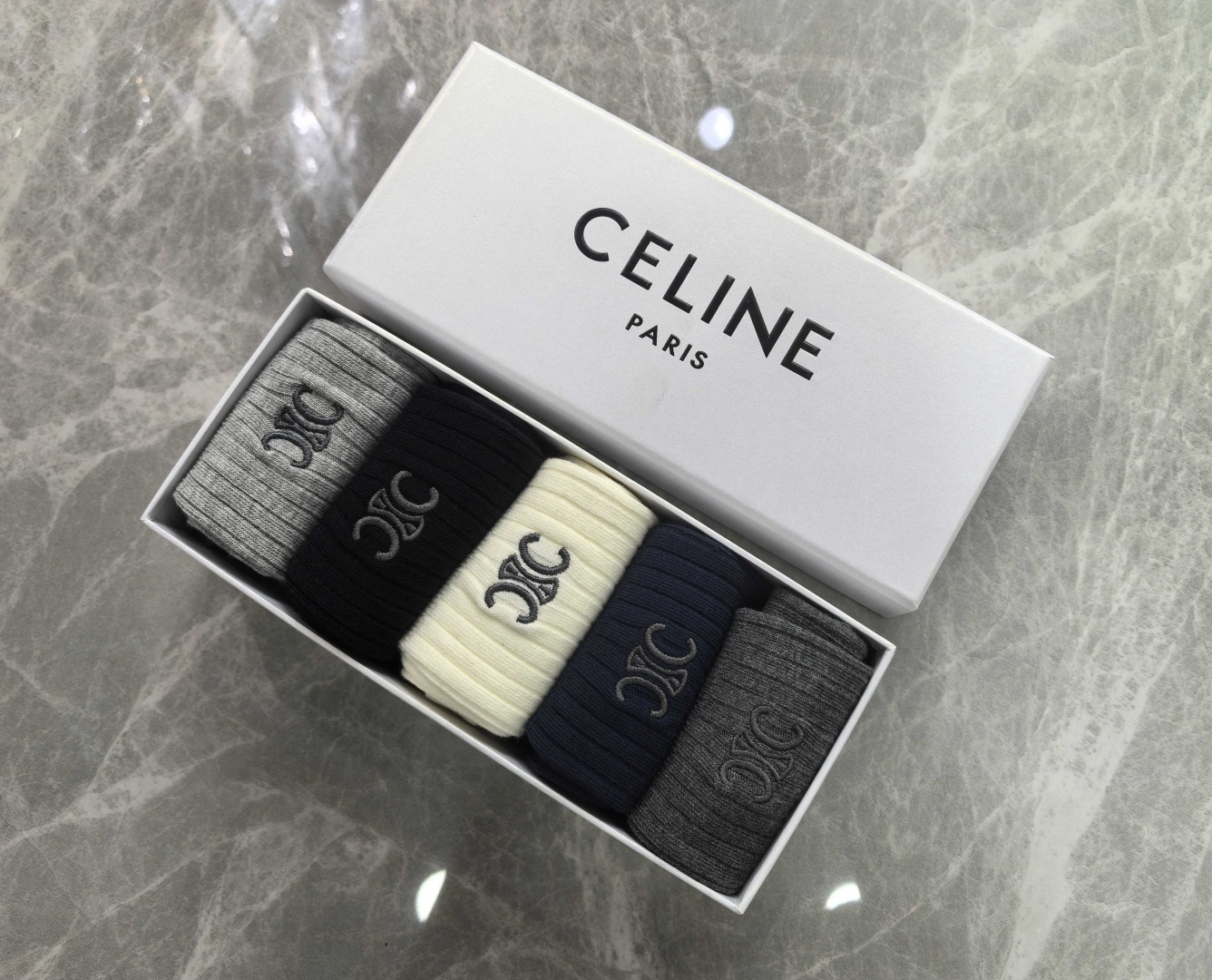 特价💰99 💛配专柜包装 CELINE(赛琳)最新双针中长筒刺绣款堆堆袜袜子!一盒五双,专柜同步筒袜袜子,💛大牌出街,潮人必备🔥超好搭