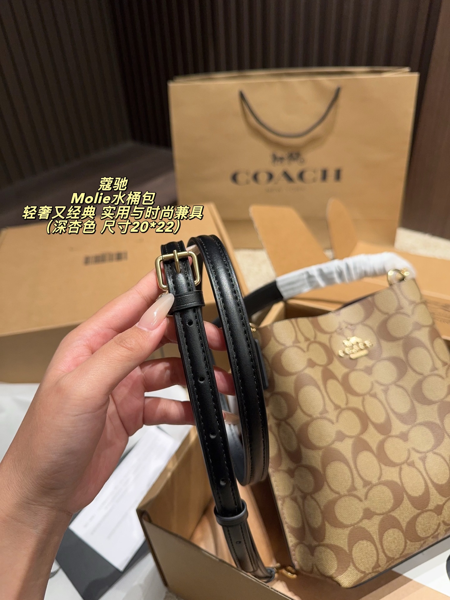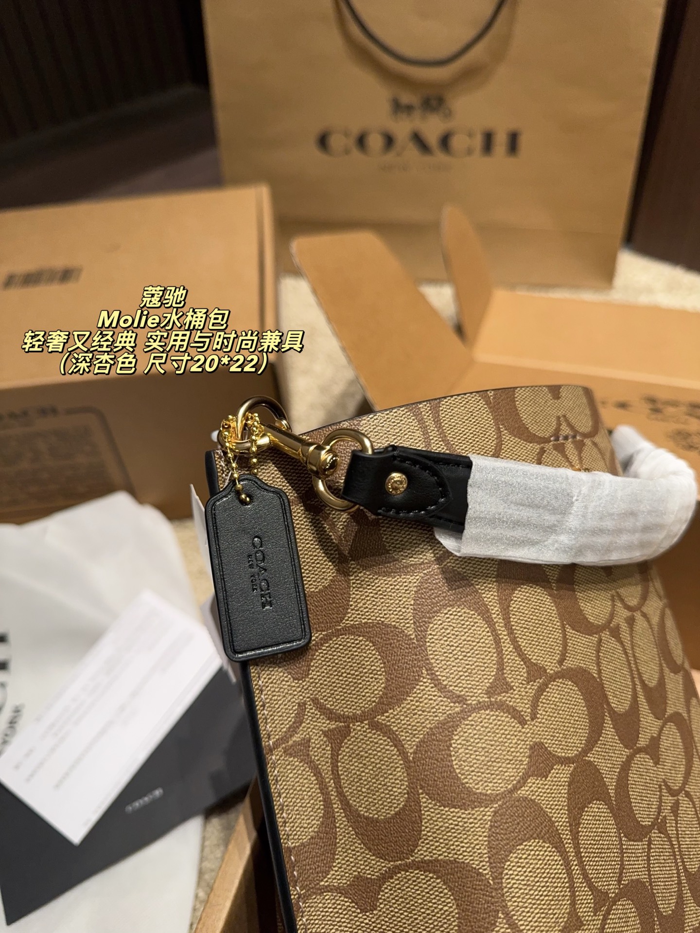💰385配飞机盒⚠️尺寸20*22 Coach 蔻驰Molie水桶包 经典Signature涂 层帆布+皮革饰边,耐用又有质感。奶茶色老花图案,低调百搭,适合多场合。容量适中,通勤休闲都OK。配可调节肩带,手提斜挎随心切换,灵活实用上。包内空问合理,平板、雨伞都能装,轻奢又经典,是实用与时尚兼具的热门选择!