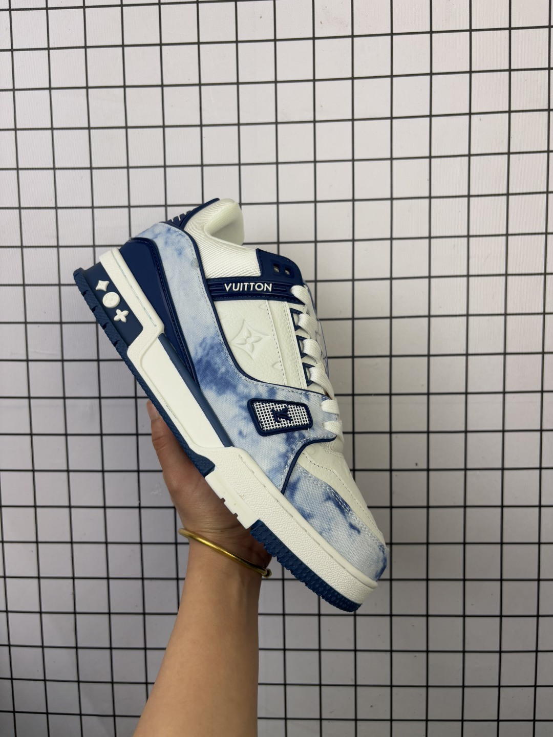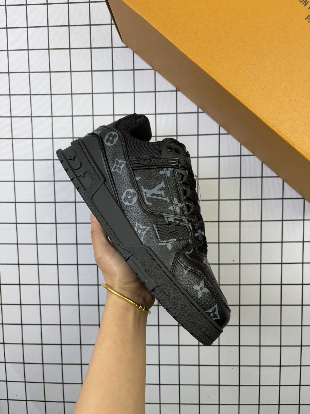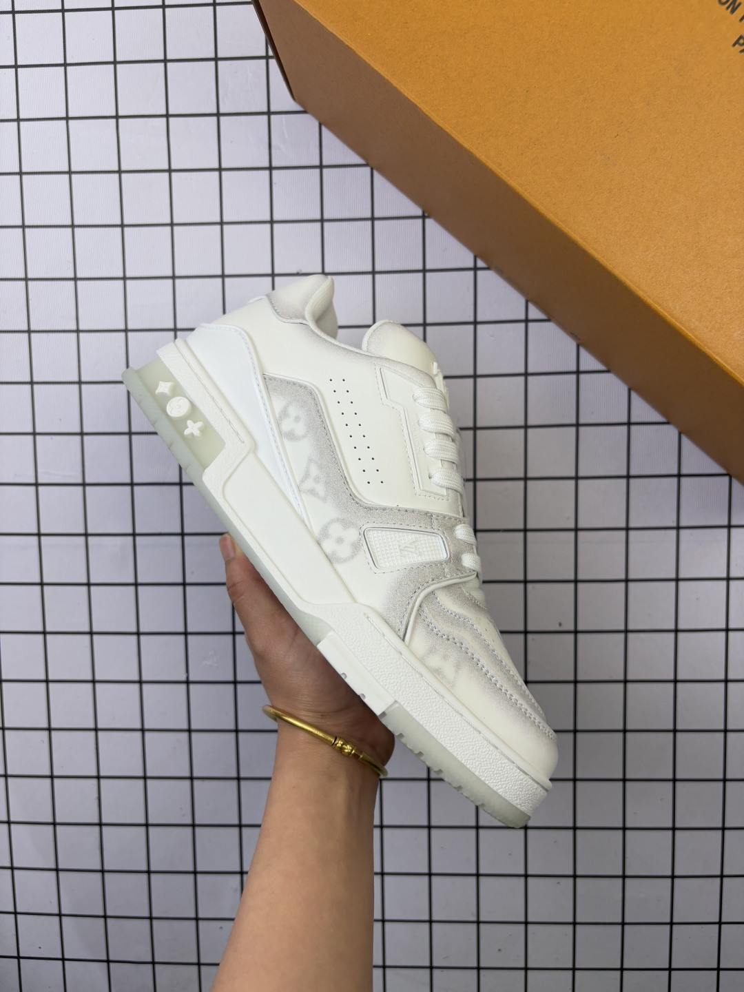 🈴💰200 【公司级】路易威登 Louis Vuitton LV路易威登板鞋 时尚运动鞋潮厚底增高男女鞋。舒适防滑底和百搭性霸屏整个时尚娱乐圈,细节调整完美主义!采用柔软帆布皮革拼接鞋面,独家开模大底, 侧边采用3D打印标志性Logo 尽显贵族时尚气息,配带正品全套包装。全新LV路易威登Louis vuitton Trainer Sneaker Low 休闲运动文化百搭板鞋。 类型:男女鞋 尺码:36-45 编码:旭D