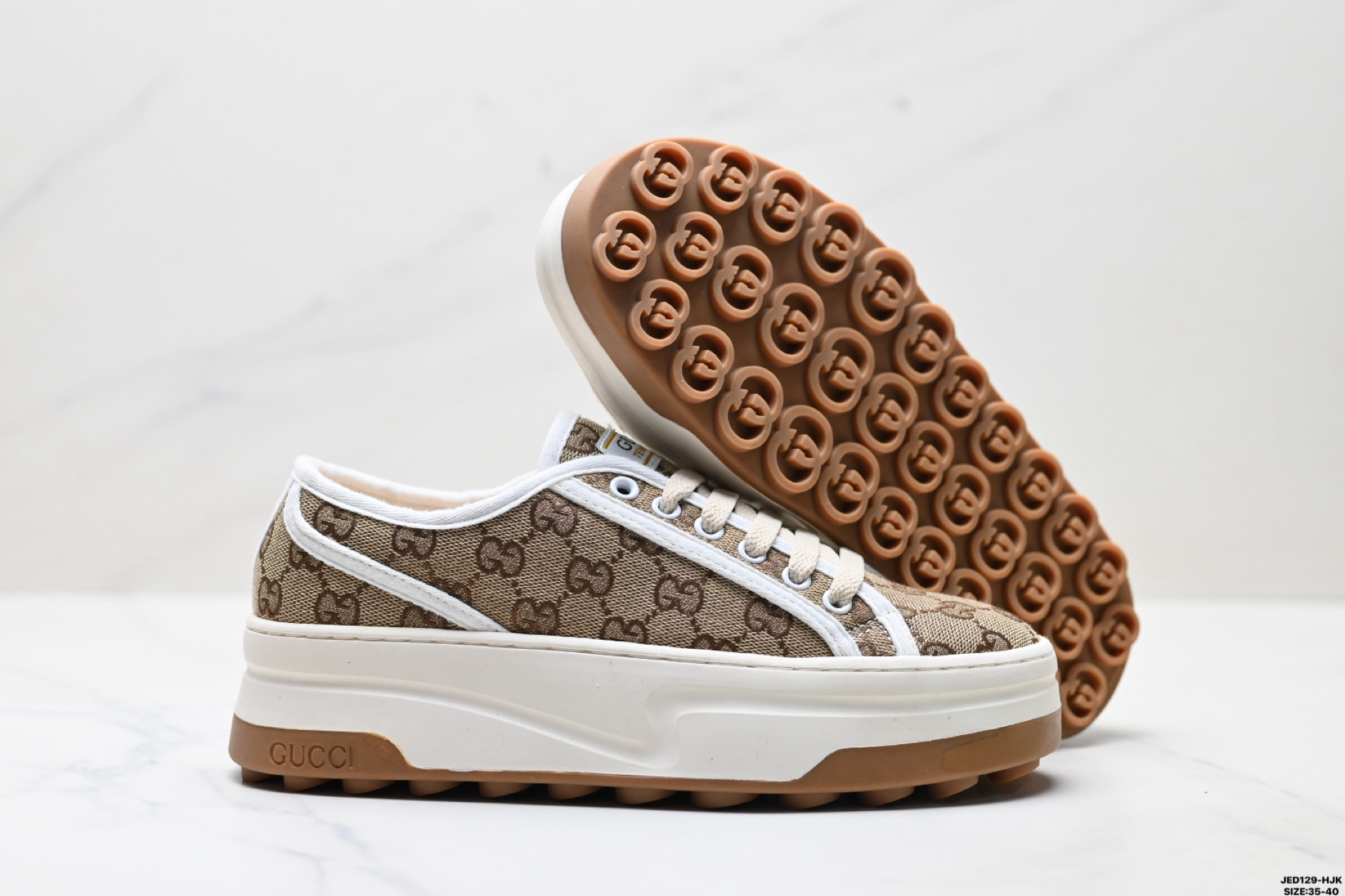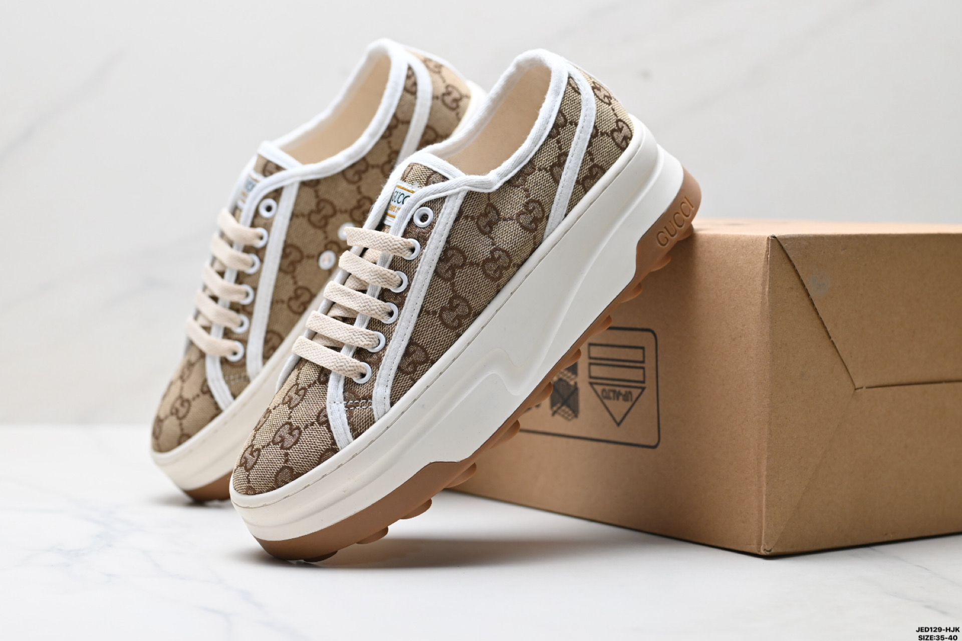 🈴💰130 真标✅GUCCI古驰 Interlocking 低帮系带 时尚板鞋 这件亮眼吸睛的单品从网球世界中汲取创作灵感 这款低帮运动鞋以同色调米色和乌木色经典GG帆布匠心打造 采用厚底设计和撞色织物滚边以现代手法焕新演绎品牌美学理念 货号:498916 A9L00 9522 尺码:35-40 ID:JED129-HJK