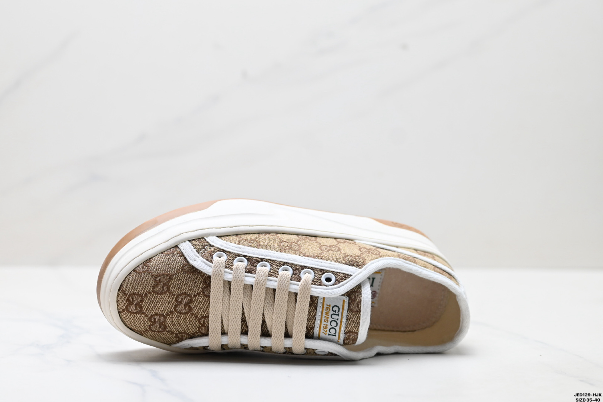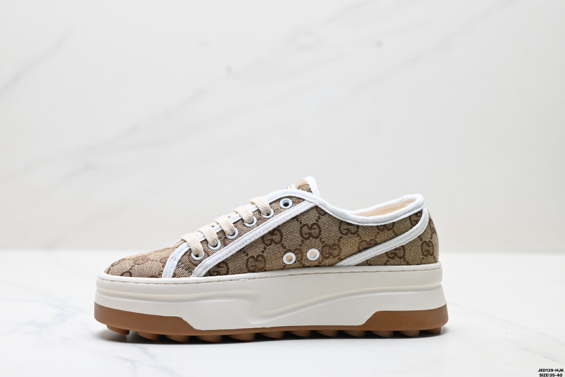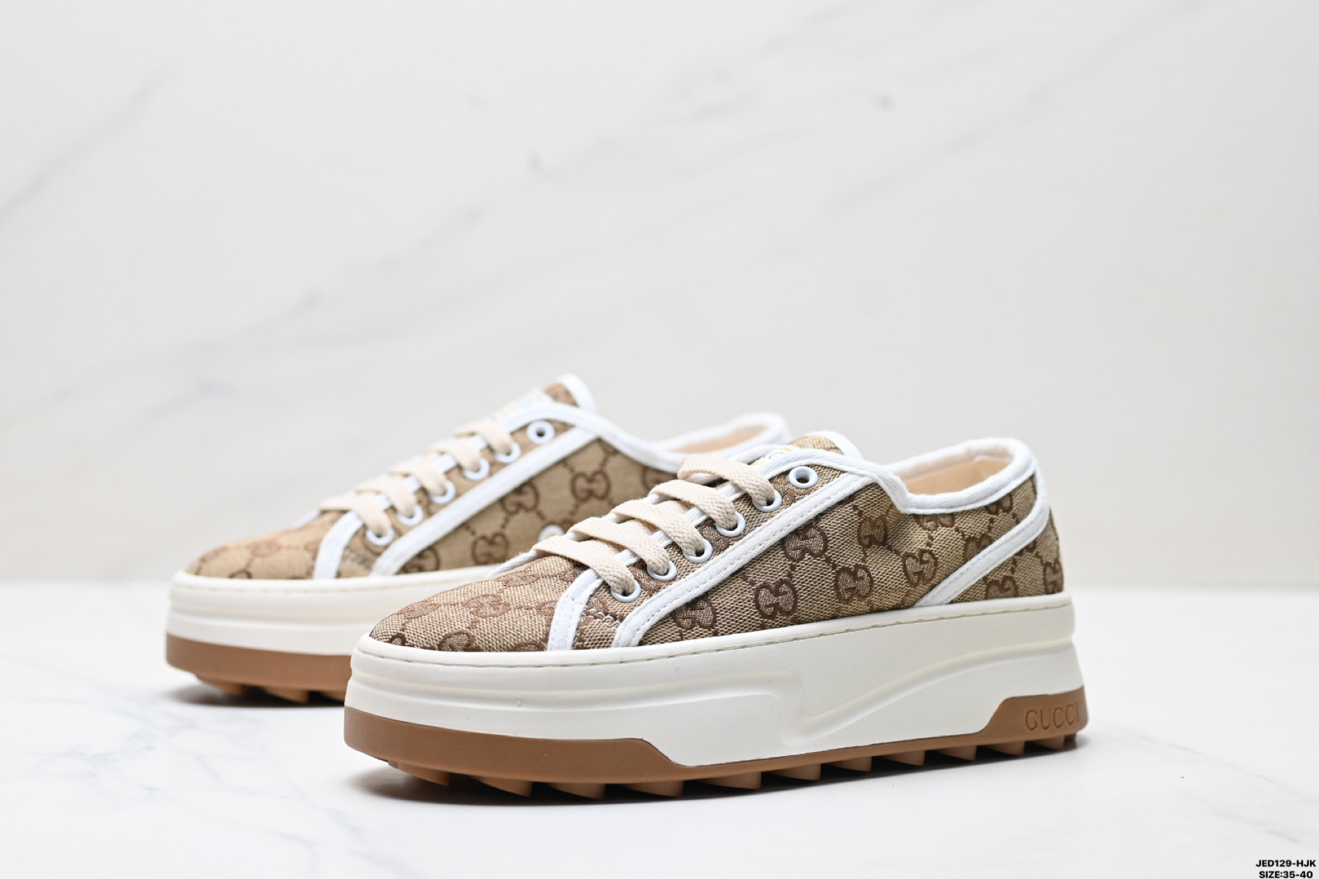 💰130 真标✅GUCCI古驰 Interlocking 低帮系带 时尚板鞋 这件亮眼吸睛的单品从网球世界中汲取创作灵感 这款低帮运动鞋以同色调米色和乌木色经典GG帆布匠心打造 采用厚底设计和撞色织物滚边以现代手法焕新演绎品牌美学理念 货号:498916 A9L00 9522 尺码:35-40 ID:JED129-HJK