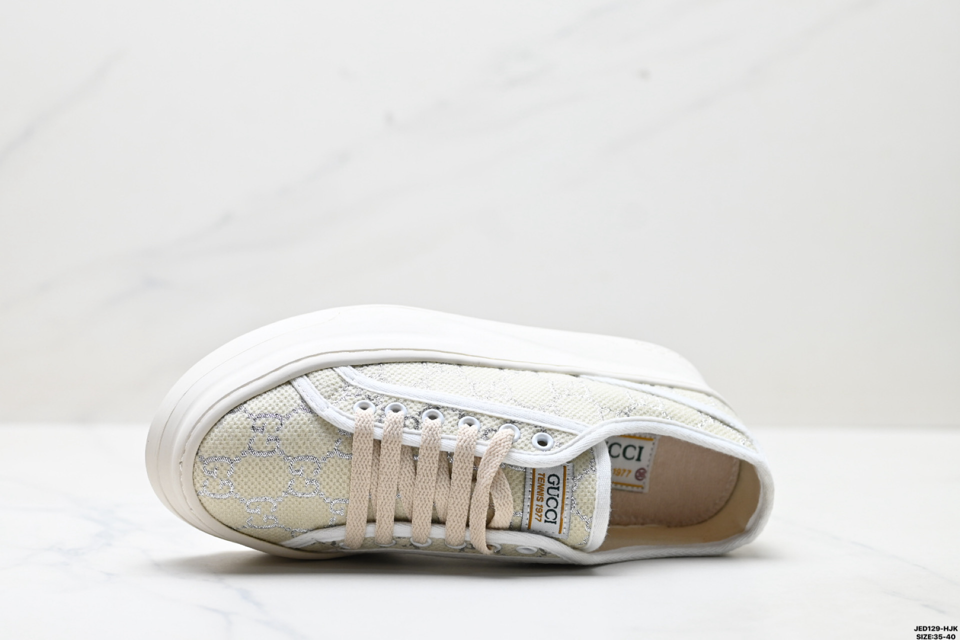 💰130 真标✅GUCCI古驰 Interlocking 低帮系带 时尚板鞋 这件亮眼吸睛的单品从网球世界中汲取创作灵感 这款低帮运动鞋以同色调米色和乌木色经典GG帆布匠心打造 采用厚底设计和撞色织物滚边以现代手法焕新演绎品牌美学理念 货号:498916 A9L00 9522 尺码:35-40 ID:JED129-HJK