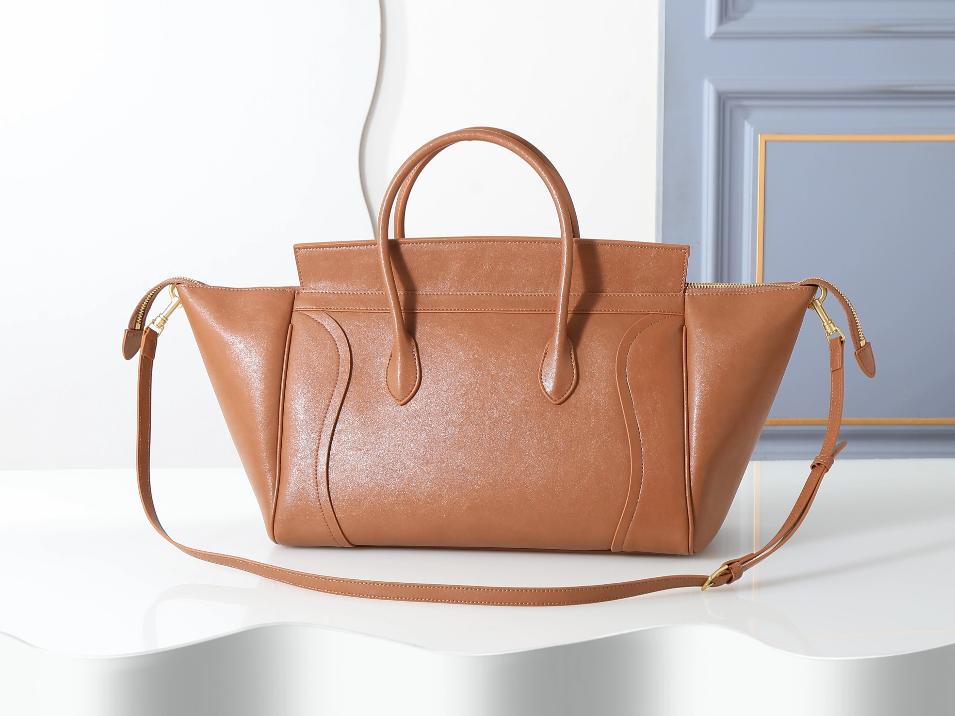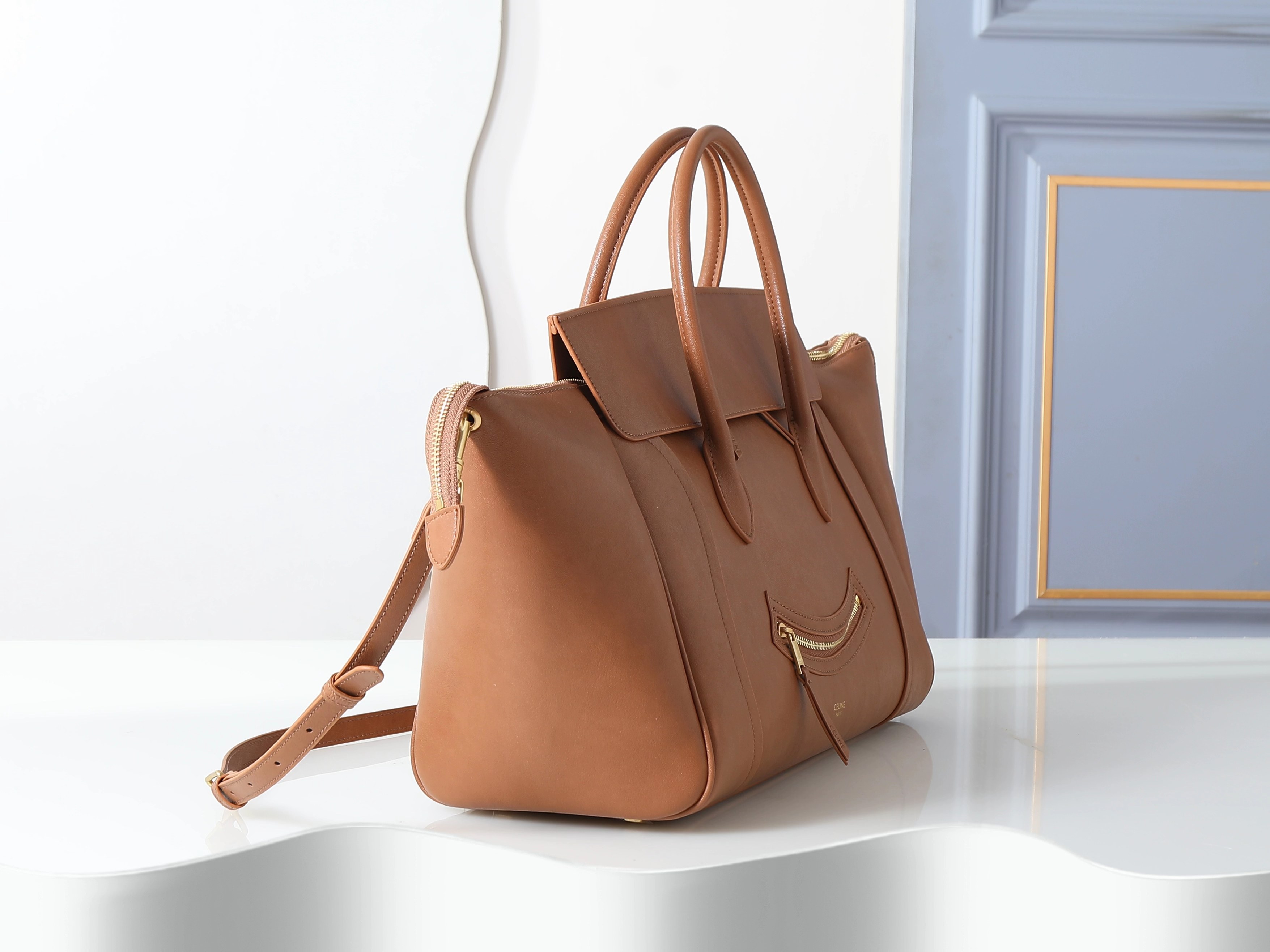 💰390 款号123683棕色大号手袋,NEW LUGGAGE全新版本笑脸包,手提、手挽、肩背。双拉链开合,尺寸:20cm-27cm-44cm