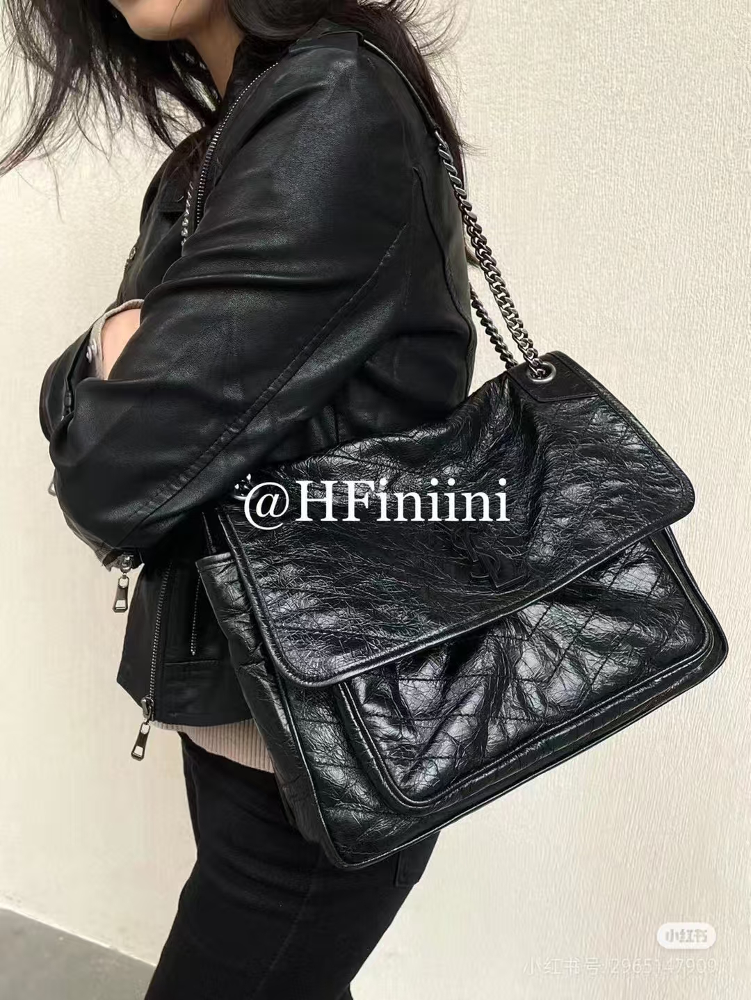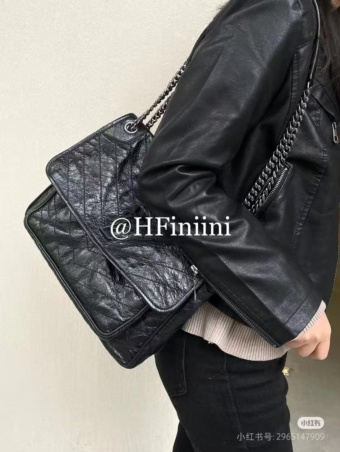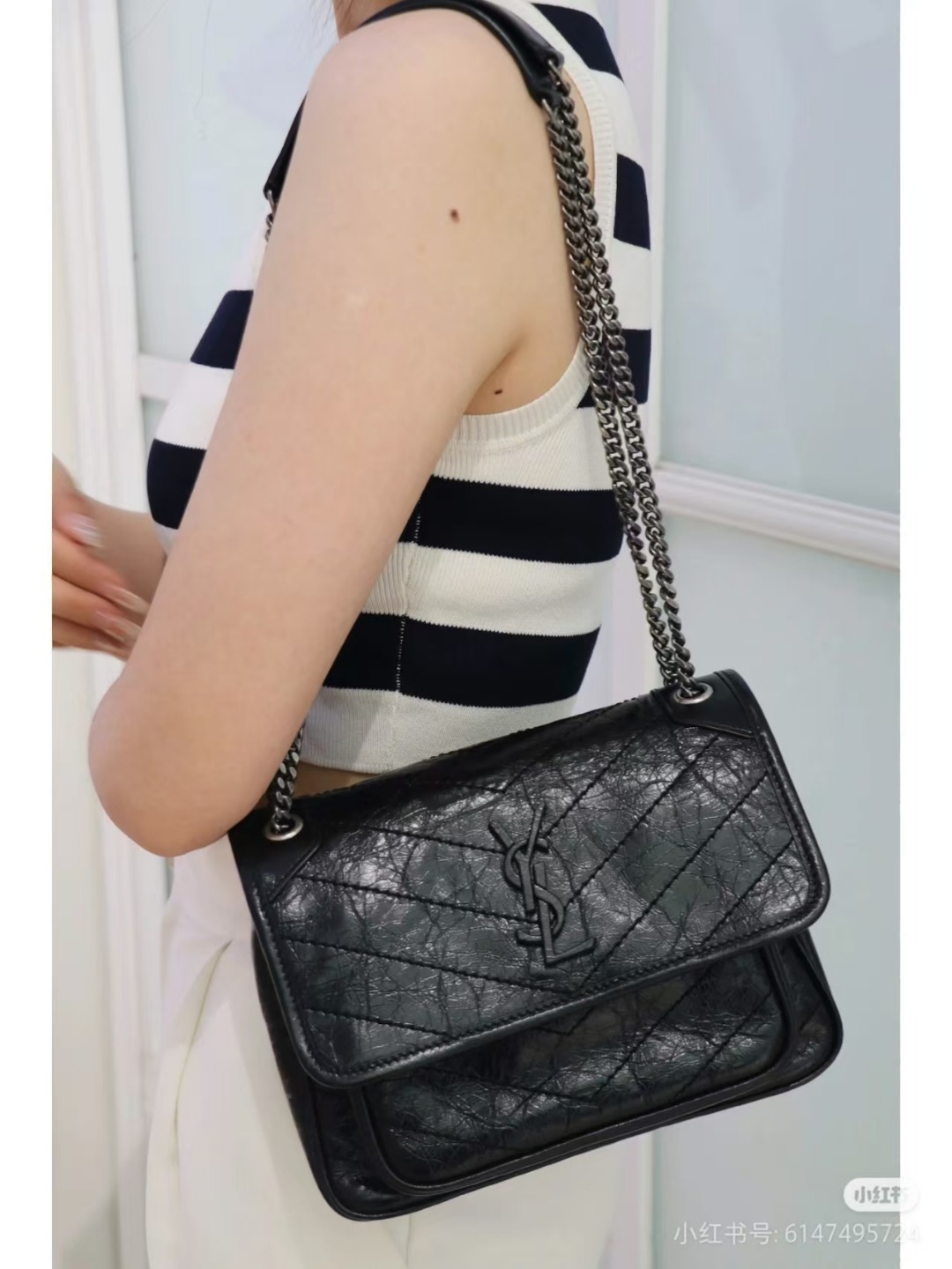圣罗兰YSL Niki 银链黑标Logo复古褶皱D扣流浪包 黑色 上身参考 圣罗兰包包